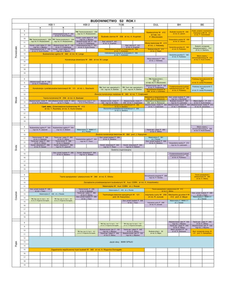 BUDOWNICTWO S2 ROK I KBI 1 a KBI 2 a 8 Zrównoważone bud. P 423 dr inż. K. Kurtz-Orecka 9 10 Poniedziałek 11 12 13 14 TOB b TN: Teoria konstrukcji L 226 mgr inż. R. Wojtaszewski Konstr. z pref. beton. P 244 mgr inż. J. Błyszko Zrównoważone bud. P 423 dr inż. K. Kurtz-Orecka TP: Teoria konstrukcji L 226 mgr inż. R. Wojtaszewski Złożone konstr. bet. P 133 dr inż. P. Freidenberg Konstr. z pref. beton. P 244 mgr inż. J. Błyszko TN: Teoria konstrukcji L 226 mgr inż. R. Wojtaszewski Konstr. z pref. beton. P 244 mgr inż. J. Błyszko Złożone konstr. bet. P 133 dr inż. P. Freidenberg Zrównoważone bud. P 423 dr inż. K. Kurtz-Orecka Budownictwo ogólne W 360 dr inż. M. Lange DUL BH BE Nawierzchnie W 412 dr hab. inż. P. Mieczkowski Budowle morskie W 430 dr inż. D. Libront Podst. prawne i mechanizmy finansowe w BE W 121 dr inż. P. Cierzniewski b Budowle ziemne W 258 dr inż. A. Krupiński Gospodarka wodna W 430 dr inż. D. Libront Bud. ziemne P 441 dr inż. A. Krupiński Bud. ziemne P 441 dr inż. A. Krupiński Oddziaływanie budowli na środowisko W 356 dr inż. T. Kozłowski Oddziaływanie budowli na środowisko Ć 356 dr inż. T. Kozłowski Mosty betonowe W 413 dr inż. J. Hołowaty Budowa dróg W 413 dr inż. S. Majer Dynamika gruntów W 165 dr inż. A. Pozlewicz Dynamika gruntów Ć 165 dr inż. A. Pozlewicz 15 Mosty betonowe P 350 dr inż. J. Hołowaty Konstrukcje drewniane W 360 dr inż. M. Lange 16 Budynki i przegrody energooszczędne L 412 dr inż. A. Siwińska Bilans cieplny i termomodernizacja W 412 dr inż. K. Kurtz-Orecka 17 18 19 TN: Nawierzchnie L 305 / 20 dr hab. inż. P. Mieczkowski 8 9 Złożone konstr. bet. P 133 dr inż. P. Freidenberg 10 TN: Tech. bet. specjalnych L 123 mgr inż. A. Zieliński Konstrukcje z prefabrykatów betonowych W 121 dr inż. L. Stachecki 11 Wtorek 14 15 16 Złożone konstr. bet. P 133 dr inż. P. Freidenberg Skrzyżowania drogowe W 258 dr inż. J. Czarnecki Fundamentowanie budowli hydrotechnicznych W 165 dr inż. A. Pozlewicz Podstawy termodynamiki Ć 353 dr inż. D. Leciej-Pirczewska Złożone konstrukcje metalowe W 360 dr inż. T. Czajkowski 12 13 TP: Tech. bet. specjalnych L 123 mgr inż. A. Zieliński Podstawy termodynamiki W 353 dr inż. D. Leciej-Pirczewska Teoria konstrukcji W 258 dr inż. A. Badower Złożone konstr. metal. P 422 Złożone konstr. metal. P 422 dr inż. M. Abramowicz dr inż. P. Popiel Złożone konstr. metal. P Złożone konstr. metal. P 430 mgr inż. M. Gielo 430 dr inż. T. Czajkowski Ekonomika przedsiębiorstw budowlanych W 356 dr inż. A. Siewiera Ekonomika przedsiębiorstw budowlanych Ć 356 dr inż. A. Siewiera Złożone konstr. metal. P 413 dr inż. A. Pełka-Sawenko I poł. sem.: Zrównoważone budownictwo W 412 dr inż. T. Rucińska dr inż. K. Kurtz-Orecka Statystyka w drogownictwie W Zarz. przed. budowl. P 326 306 prof. A. Sołowczuk mgr inż. J. Bochenek Statystyka w drogownictwie L Budowle morskie P 352 Bilans cieplny ... P 412 306 prof. A. Sołowczuk mgr inż. N. Laskowski dr inż. K. Kurtz-Orecka Złożone konstr. metal. P 422 Złożone konstr. metal. P 422 Złożone konstr. metal. P 413 dr inż. T. Czajkowski dr inż. T. Wróblewski dr inż. M. Jarosińska 17 18 19 8 9 Budownictwo ogólne P 344 mgr inż. R. Jaworski Budownictwo ogólne P 344 mgr inż. S. Skibicki Teoria konstr. P 308 dr inż. A. Badower Teoria spr. i plast. P 352 dr inż. E. Silicka Konstr. drewniane P 356 dr inż. R. Nowak Teoria spr. i plast. P 352 dr inż. E. Silicka Teoria konstr. P 308 dr inż. A. Badower Konstr. drewniane P 356 mgr inż. R. Jaworski Matematyka Ć BMW117 dr J. Rosiak Złożone konstrukcje betonowe W 360 prof. J. Kaszyński 10 11 Środa 12 13 Bilans cieplny i termomodernizacja P 356 dr inż. K. Kurtz-Orecka Teoria spr. i plast. P 352 dr inż. E. Silicka Budownictwo ogólne P 344 mgr inż. P. Tkacz Zarz. przed. budowl. P 326 dr inż. A. Siewiera Konstr. drewniane P 344 mgr inż. P. Tkacz Matematyka Ć 301 dr J. Rosiak Zarz. przed. budowl. P 326 dr inż. A. Siewiera Konstr. drewniane P 344 mgr inż. S. Skibicki Gospodarka wodna P 272 mgr inż. N. Laskowski Godzina organizacyjna 14 Zarz. przed. budowl. P 326 dr inż. A. Siewiera 15 Konstr. drewniane P 344 mgr inż. S. Skibicki Fundamentowanie budowli hydrotechnicznych P 165 dr inż. A. Pozlewicz 16 17 18 19 8 Zarządzanie przedsięwzięciami budowlanymi W Aud. CDBN dr inż. K. Araszkiewicz 10 Matematyka W Aud. CDBN dr J. Rosiak 11 Czwartek 12 13 14 15 Teoria sprężystości i plastyczności W 360 dr inż. E. Silicka Skrzyżowania drogowe P 306 mgr inż. P. Gardas Teoria sprężystości i plastyczności W 360 dr inż. E. Silicka 9 Zarz. przed. budowl. P 326 dr inż. I. Tracz Matematyka Ć 440 dr J. Rosiak TN: Zag. wsp. fiz. bud. L 441 dr inż. A. Wygocka-Domagałło TP: Zag. wsp. fiz. bud. L 441 dr inż. A. Wygocka-Domagałło Teoria konstr. P 226 dr inż. A. Badower Teoria spr. i plast. P 352 dr inż. E. Silicka Zarz. przed. budowl. P 326 dr inż. I. Tracz Matematyka Ć 440 dr J. Rosiak Technologia betonów specjalnych W 121 prof. M. Kaszyńska Zarz. przed. budowl. P 326 dr inż. I. Tracz 16 Teoria sprężystości i plastyczności W 412 dr inż. E. Silicka Inżynieria ruchu W 258 dr inż. R. Jurczak Inżynieria ruchu P 258 dr inż. R. Jurczak Mechanika gruntów II W 412 prof. Z. Meyer Zarz. przed. budowl. P 326 dr inż. I. Tracz Matematyka Ć BMW117 dr J. Rosiak Matematyka Ć BMW117 dr J. Rosiak 17 18 19 8 9 10 11 TN: Zag. wsp. fiz. bud. L 441 dr inż. A. Wygocka-Domagałło TN: Zag. wsp. fiz. bud. L 441 dr inż. A. Wygocka-Domagałło TP: Zag. wsp. fiz. bud. L 441 dr inż. A. Wygocka-Domagałło Złożone konstr. bet. P 133 mgr inż. J. Błyszko Teoria spr. i plast. P 440 dr inż. E. Silicka Teoria spr. i plast. P 440 dr inż. E. Silicka Złożone konstr. bet. P 133 mgr inż. J. Błyszko Piątek 12 13 Język obcy BMW SPNJO 14 15 16 17 18 19 Zagadnienia współczesnej fizyki budowli W 360 dr inż. A. Wygocka-Domagałło Budowa dróg L 20 dr inż. S. Majer 