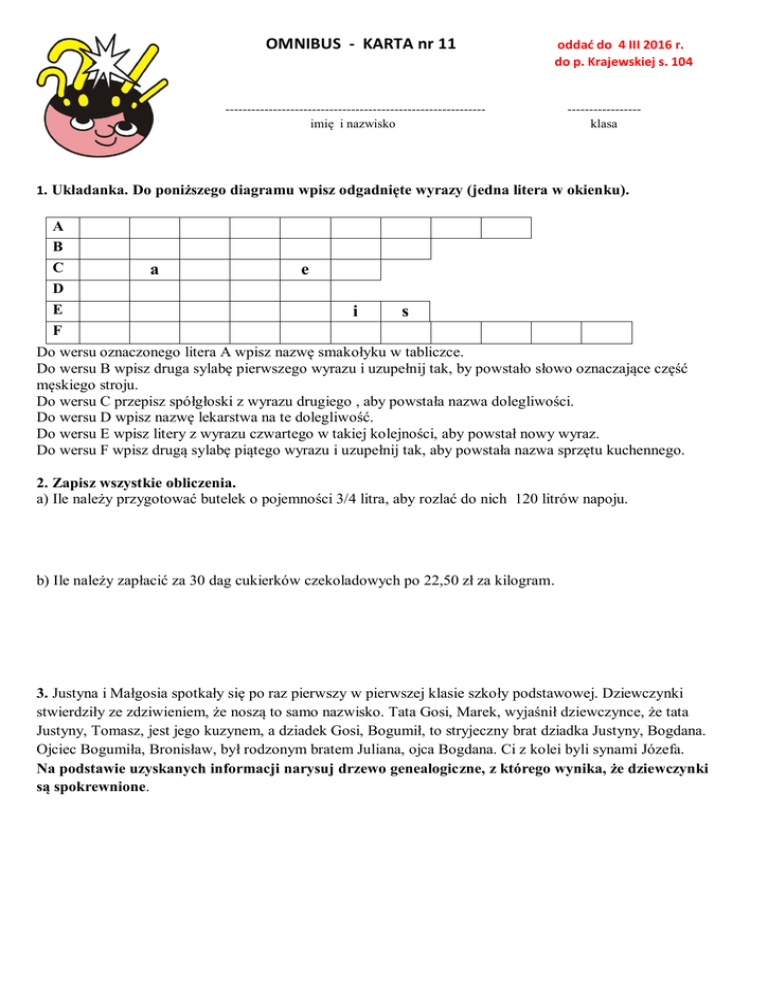 OMNIBUS - KARTA nr 11 oddać do 4 III 2016 r. do p. Krajewskiej s. 104 ------------------------------------------------------------ ----------------- imię i nazwisko klasa 1. Układanka. Do poniższego diagramu wpisz odgadnięte wyrazy (jedna litera w okienku). A B C D E F a e i s Do wersu oznaczonego litera A wpisz nazwę smakołyku w tabliczce. Do wersu B wpisz druga sylabę pierwszego wyrazu i uzupełnij tak, by powstało słowo oznaczające część męskiego stroju. Do wersu C przepisz spółgłoski z wyrazu drugiego , aby powstała nazwa dolegliwości. Do wersu D wpisz nazwę lekarstwa na te dolegliwość. Do wersu E wpisz litery z wyrazu czwartego w takiej kolejności, aby powstał nowy wyraz. Do wersu F wpisz drugą sylabę piątego wyrazu i uzupełnij tak, aby powstała nazwa sprzętu kuchennego. 2. Zapisz wszystkie obliczenia. a) Ile należy przygotować butelek o pojemności 3/4 litra, aby rozlać do nich 120 litrów napoju. b) Ile należy zapłacić za 30 dag cukierków czekoladowych po 22,50 zł za kilogram. 3. Justyna i Małgosia spotkały się po raz pierwszy w pierwszej klasie szkoły podstawowej. Dziewczynki stwierdziły ze zdziwieniem, że noszą to samo nazwisko. Tata Gosi, Marek, wyjaśnił dziewczynce, że tata Justyny, Tomasz, jest jego kuzynem, a dziadek Gosi, Bogumił, to stryjeczny brat dziadka Justyny, Bogdana. Ojciec Bogumiła, Bronisław, był rodzonym bratem Juliana, ojca Bogdana. Ci z kolei byli synami Józefa. Na podstawie uzyskanych informacji narysuj drzewo genealogiczne, z którego wynika, że dziewczynki są spokrewnione. 4. Wzorem zdrowego stylu życia jest PIRAMIDA ZDROWEGO ŻYWIENIA I AKTYWNOŚCI FIZYCZNEJ. Przyjrzyj się jej uważnie, a następnie uzupełnij zdania: Wśród wszystkich produktów, jakie spożywamy za najważniejsze uznaje się ..…………. i ………..…… Nasza dieta powinna zawierać jak najmniej …………………. , …………………. i …………………. Podstawowym napojem człowieka powinna być …………………. …………………. ,w połączeniu ze zdrową dietą, odgrywa ważną rolę w zapobieganiu wielu chorób. 5. Uzupełnij schemat wpisując odpowiednie nazwy zwierząt, których nazwy podano poniżej. żyrafa, krokodyl, salamandra, hipopotam, delfin, żółw.