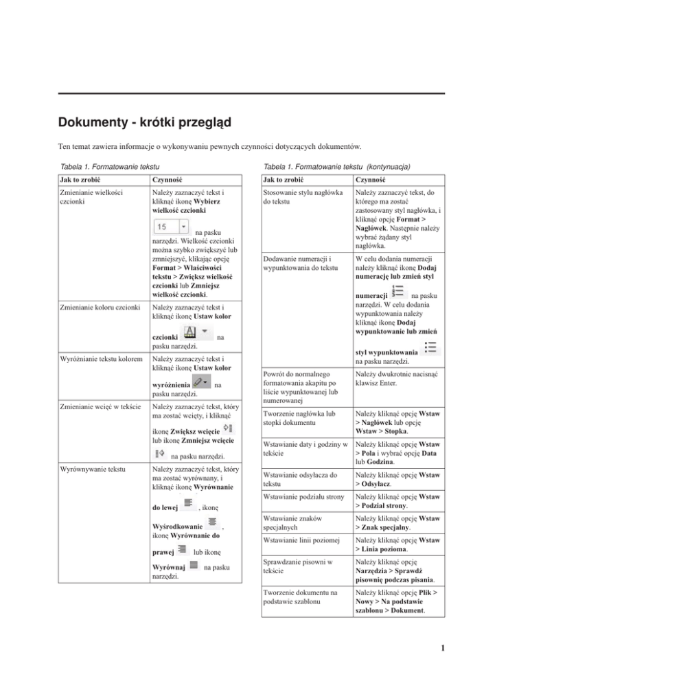 Dokumenty - krótki przegląd Ten temat zawiera informacje o wykonywaniu pewnych czynności dotyczących dokumentów. Tabela 1. Formatowanie tekstu Tabela 1. Formatowanie tekstu (kontynuacja) Jak to zrobić Czynność Jak to zrobić Czynność Zmienianie wielkości czcionki Należy zaznaczyć tekst i kliknąć ikonę Wybierz wielkość czcionki Stosowanie stylu nagłówka do tekstu Należy zaznaczyć tekst, do którego ma zostać zastosowany styl nagłówka, i kliknąć opcję Format > Nagłówek. Następnie należy wybrać żądany styl nagłówka. Dodawanie numeracji i wypunktowania do tekstu W celu dodania numeracji należy kliknąć ikonę Dodaj numerację lub zmień styl na pasku narzędzi. Wielkość czcionki można szybko zwiększyć lub zmniejszyć, klikając opcję Format > Właściwości tekstu > Zwiększ wielkość czcionki lub Zmniejsz wielkość czcionki. Zmienianie koloru czcionki czcionki pasku narzędzi. Wyróżnianie tekstu kolorem na Należy zaznaczyć tekst i kliknąć ikonę Ustaw kolor wyróżnienia pasku narzędzi. Zmienianie wcięć w tekście na Należy zaznaczyć tekst, który ma zostać wcięty, i kliknąć ikonę Zwiększ wcięcie lub ikonę Zmniejsz wcięcie na pasku narzędzi. Wyrównywanie tekstu na pasku numeracji narzędzi. W celu dodania wypunktowania należy kliknąć ikonę Dodaj wypunktowanie lub zmień Należy zaznaczyć tekst i kliknąć ikonę Ustaw kolor Należy zaznaczyć tekst, który ma zostać wyrównany, i kliknąć ikonę Wyrównanie do lewej Wyrównaj narzędzi. Powrót do normalnego formatowania akapitu po liście wypunktowanej lub numerowanej Należy dwukrotnie nacisnąć klawisz Enter. Tworzenie nagłówka lub stopki dokumentu Należy kliknąć opcję Wstaw > Nagłówek lub opcję Wstaw > Stopka. Wstawianie daty i godziny w tekście Należy kliknąć opcję Wstaw > Pola i wybrać opcję Data lub Godzina. Wstawianie odsyłacza do tekstu Należy kliknąć opcję Wstaw > Odsyłacz. Wstawianie podziału strony Należy kliknąć opcję Wstaw > Podział strony. Wstawianie znaków specjalnych Należy kliknąć opcję Wstaw > Znak specjalny. Wstawianie linii poziomej Należy kliknąć opcję Wstaw > Linia pozioma. Sprawdzanie pisowni w tekście Należy kliknąć opcję Narzędzia > Sprawdź pisownię podczas pisania. Tworzenie dokumentu na podstawie szablonu Należy kliknąć opcję Plik > Nowy > Na podstawie szablonu > Dokument. , ikonę , Wyśrodkowanie ikonę Wyrównanie do prawej styl wypunktowania na pasku narzędzi. lub ikonę na pasku 1 Tabela 1. Formatowanie tekstu (kontynuacja) Tabela 2. Praca z tabelami (kontynuacja) Jak to zrobić Czynność Jak to zrobić Czynność Dodawanie spisu treści Należy kliknąć opcję Format > Nagłówek, aby zastosować styl nagłówka do każdego nagłówka, kliknąć miejsce, w którym ma znajdować się spis treści, i kliknąć opcję Wstaw > Spis treści. Zmienianie szerokości kolumny Edytowanie spisu treści Należy wprowadzić zmiany w nagłówkach dokumentu, kliknąć prawym przyciskiem myszy spis treści i kliknąć opcję Aktualizuj. Należy przytrzymać wskaźnik myszy nad krawędzią kolumny, aż przyjmie on kształt wskaźnika zmiany wielkości. Należy przeciągnąć krawędź w odpowiednie nowe miejsce. Zmienianie wysokości wiersza Należy przytrzymać wskaźnik myszy nad krawędzią wiersza, aż przyjmie on kształt wskaźnika zmiany wielkości. Należy przeciągnąć krawędź w odpowiednie nowe miejsce. Zmienianie wielkości całej tabeli Należy przytrzymać wskaźnik myszy nad końcem tabeli do momentu wyświetlenia uchwytu do zmiany wielkości i strzałki Usuwanie spisu treści Należy kliknąć spis treści prawym przyciskiem myszy i kliknąć opcję Usuń. Tabela 2. Praca z tabelami Jak to zrobić Czynność Tworzenie tabeli Aby utworzyć prostą tabelę, należy kliknąć opcję Tabela > Utwórz. Aby utworzyć tabelę z użyciem predefiniowanych stylów, należy kliknąć ikonę Zmień styl tabeli narzędzi. Dodawanie wiersza do tabeli albo przenoszenie go w górę lub w dół tabeli na pasku . Należy obustronnej przeciągnąć uchwyt, aby uzyskać żądaną wielkość tabeli. Scalanie komórek Należy zaznaczyć komórki do scalenia, kliknąć prawym przyciskiem myszy i wybrać opcję Komórka > Scal komórki. Jeśli chcesz scalić komórkę z komórką znajdującą się poniżej, należy kliknąć komórkę prawym przyciskiem myszy i wybrać opcję Komórka > Scal z komórką poniżej. Dzielenie komórki Należy kliknąć komórkę prawym przyciskiem myszy i wybrać opcję Komórka > Podziel pionowo lub Podziel poziomo. Szybkie usuwanie całej zawartości komórki Należy kliknąć komórkę prawym przyciskiem myszy i wybrać opcję Komórka > Wyczyść treść. Dodawanie krawędzi do tabeli Należy kliknąć tabelę prawym przyciskiem myszy i wybrać opcję Tabela > Właściwości tabeli. Należy kliknąć strzałkę ikony Wstaw lub przenieś wiersz na pasku narzędzi, a następnie wybrać opcję Wstaw wiersz powyżej, Wstaw wiersz poniżej, Przenieś wiersz powyżej lub Przenieś wiersz poniżej. Dodawanie kolumny do Należy kliknąć strzałkę ikony tabeli albo przenoszenie jej w Wstaw lub przenieś lewo lub w prawo w tabeli na kolumnę pasku narzędzi, a następnie wybrać opcję Wstaw kolumnę przed, Wstaw kolumnę po, Przenieś kolumnę przed lub Przenieś kolumnę po. 2 Dokumenty - krótki przegląd Tabela 2. Praca z tabelami (kontynuacja) Tabela 3. Praca z grafiką (kontynuacja) Jak to zrobić Czynność Jak to zrobić Czynność Ustawianie kolorów tła dla komórek Należy zaznaczyć komórki, a następnie kliknąć ikonę Ustawianie właściwości obrazu, takich jak wysokość, szerokość, krawędzie i wyrównanie Należy kliknąć obraz i wybrać opcję Format > Właściwości obrazu. Ustaw kolor tła na pasku narzędzi. Aby ustawić kolor tła dla jednej komórki, nie trzeba jej wybierać. Wystarczy ją kliknąć. Dodawanie podpisu do tabeli Należy kliknąć t