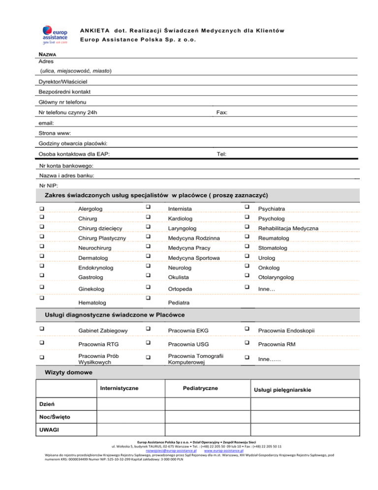 A N K I E T A d o t . R e a l i z a c j i Ś w i a d c z e ń M e d yc z n yc h d l a K l i e n t ó w E u r o p As s i s t a n c e P o l s k a S p . z o . o . NAZWA Adres (ulica, miejscowość, miasto) Dyrektor/Właściciel Bezpośredni kontakt Główny nr telefonu Nr telefonu czynny 24h Fax: email: Strona www: Godziny otwarcia placówki: Osoba kontaktowa dla EAP: Tel: Nr konta bankowego: Nazwa i adres banku: Nr NIP: Zakres świadczonych usług specjalistów w placówce ( proszę zaznaczyć) Alergolog Internista Psychiatra Chirurg Kardiolog Psycholog Chirurg dziecięcy Laryngolog Rehabilitacja Medyczna Chirurg Plastyczny Medycyna Rodzinna Reumatolog Stomatolog Neurochirurg Medycyna Pracy Dermatolog Medycyna Sportowa Urolog Endokrynolog Neurolog Onkolog Gastrolog Okulista Otolaryngolog Ginekolog Ortopeda Inne… Hematolog Pediatra Usługi diagnostyczne świadczone w Placówce Gabinet Zabiegowy Pracownia EKG Pracownia Endoskopii Pracownia RTG Pracownia USG Pracownia RM Pracownia Prób Wysiłkowych Pracownia Tomografii Komputerowej Inne…… Wizyty domowe Internistyczne Pediatryczne Usługi pielęgniarskie Dzień Noc/Święto UWAGI Europ Assistance Polska Sp z o.o. • Dział Operacyjny • Zespół Rozwoju Sieci ul. Wołoska 5, budynek TAURUS, 02-675 Warszaw • Tel. : (+48) 22 205 50 09 lub 10 • Fax : (+48) 22 205 50 11 [email protected] www.europ-assistance.pl Wpisana do rejestru przedsiębiorców Krajowego Rejestru Sądowego, prowadzonego przez Sąd Rejonowy dla m.st. Warszawy, XIII Wydział Gospodarczy Krajowego Rejestru Sądowego, pod numerem KRS: 0000034499 Numer NIP: 525-10-32-299 Kapitał zakładowy: 3 000 000 PLN Współpraca z NFZ Tak Nie ND Usług komercyjnych POZ ……………. Rehabilitacja Wizyty specjalistyczne ……………. ……………. Czas oczekiwania na świadczenie w ramach: NFZ …………. ………… …………. Tryb leczenia w Placówce Stacjonarny Ambulatoryjny Dzienny Domowy Grupy wiekowe Pacjentów, leczonych w Placówce 0–1 1 – 12 1 12-18 >18 Z jakimi lekarzami/ placówkami/ instytucjami współpracuje Placówka? Lekarz (specjalizacja) ………………………………………………………. Placówka ………………………………………………… ND… Zakres usług rehabilitacyjnych świadczonych w Placówce Kinezyterapia Fizjoterapia Zajęcia Indywidualne Zajęcia grupowe Ćwiczenia na przyrządach Wyciągi lecznicze Inne ………………………… Magnetoterapia Terapia falami uderzeniowymi Laseroterapia Sekwencyjny masaż uciskowy Ultradźwięki Hydroterapia Balneoterapia Krioterapia Elektroterapia Inne……… Masaż Tak Nie Rehabilitacja domowa Tak Nie Jeżeli tak, podać jaki obszar obejmuje…………………………………………. Metody fizjoterapeutyczne stosowane w Placówce PNF Osteopatia NDT- Bobath dla dorosłych McKenzie Rehabilitacja Sportowa NDT- Bobath dla dzieci Europ Assistance Polska Sp z o.o. • Dział Operacyjny • Zespół Rozwoju Sieci ul. Wołoska 5, budynek TAURUS, 02-675 Warszaw • Tel. : (+48) 22 205 50 09 lub 10 • Fax : (+48) 22 205 50 11 [email protected] www.europ-assistance.pl Wpisana do rejestru przedsiębiorców Krajowego Rejestru Sądowego, prowadzonego przez Sąd Rejonowy dla m.st. Warszawy, XIII Wydział Gospodarczy Krajowego Rejestru Sądowego, pod numerem KRS: 0000034499 Numer NIP: 525-10-32-299 Kapitał zakładowy: 3 000 000 PLN Terapia tkanek miękkich Metoda SET Metoda Vojty Neuromobilizacja Urazy Czaszkowo Mózgowe Urazy Rdzenie Kręgowego Kinesiology Taping Spastyczność Terapia Manualna wg Czy Placówka ma doświadczenie w leczeniu/ rehabilitacji Pacjentów: po urazach rdzenia kręgowego, poruszających się na wózkach inwalidzkich? po amputacjach kończyn (np. przygotowanie kikuta do zaprotezowania, nauka chodu z protezą)? po urazach czaszkowo – mózgowych? Tak Nie Tak Nie Tak objętych respiratoterapią? Tak Nie Nie W leczeniu/rehabilitacji jakich schorzeń Placówka specjalizuje się szczególnie (np. udary, urazy kręgosłupa, dysfunkcje narządu ruchu, itp.) Dotyczy pacjentów korzystających z usług rehabilitacyjnych: Jaki procent obsługiwanych w Placówce Pacjentów stanowią dzieci, a jaki dorośli? Dzieci ……...% % Dorośli ………% Jaki procent Pacjentów to osoby po wypadkach komunikacyjnych (na 100% Pacjentów)? ……………………………………….. % Czy Placówka jest dostosowana do potrzeb Osób Niepełnosprawnych? TAK 1 NIE Czy Placówka współpracuje z firmą zapewniającą transport Osób Niepełnosprawnych? TAK 1 NIE Jeśli tak, proszę podać nazwę : DO ANKIETY, PROSIMY DOŁĄCZYĆ CENNIK USŁUG PAŃSTWA PLACÓWKI Uprzejmie dziękujemy za wypełnienie i odesłanie ankiety Europ Assistance Polska Sp. z o. o. Europ Assistance Polska Sp z o.o. • Dział Operacyjny • Zespół Rozwoju Sieci ul. Wołoska 5, budynek TAURUS, 02-675 Warszaw • Tel. : (+48) 22 205 50 09 lub 10 • Fax : (+48) 22 205 50 11 [email protected] www.europ-assistance.pl Wpisana do rejestru przedsiębiorców Krajowego Rejestru Sądowego, prowadzonego przez Sąd Rejonowy dla m.st. Warszawy, XIII Wydział Gospodarczy Krajowego Rejestru Sądowego, pod numerem KRS: 0000034499 Numer NIP: 525-10-32-299 Kapitał zakładowy: 3 000 000 PLN