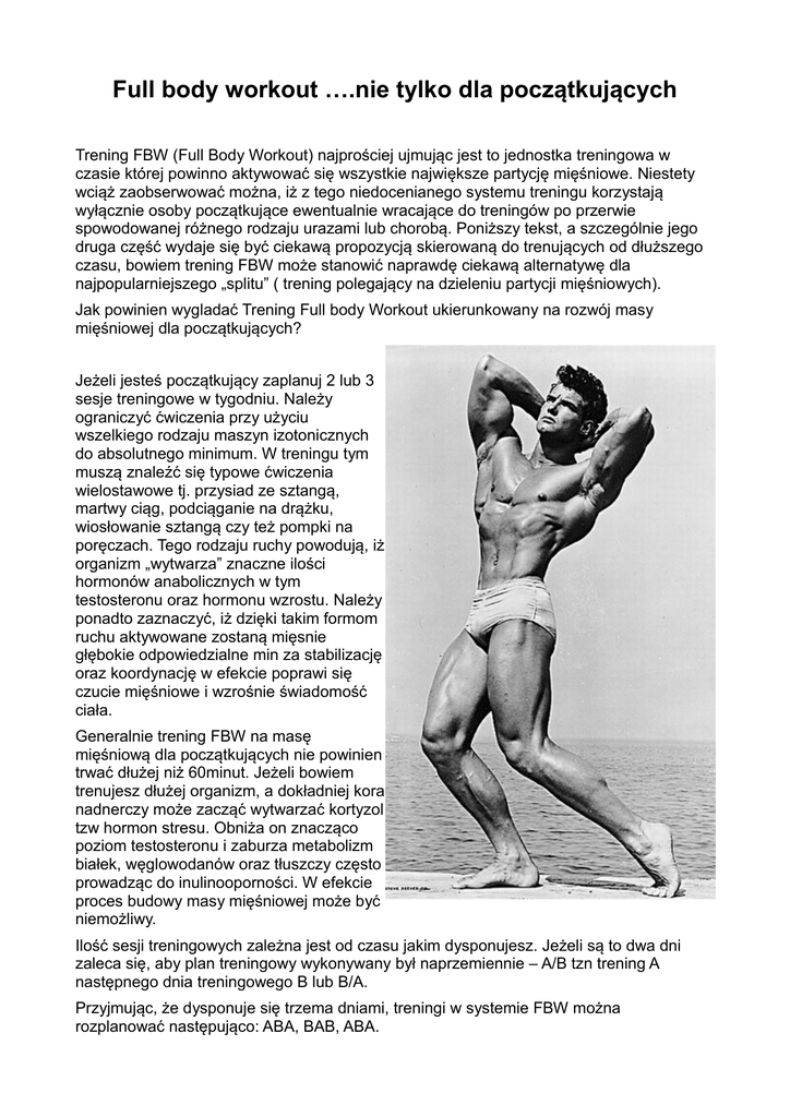 Full body workout ….nie tylko dla początkujących Trening FBW (Full Body Workout) najprościej ujmując jest to jednostka treningowa w czasie której powinno aktywować się wszystkie największe partycję mięśniowe. Niestety wciąż zaobserwować można, iż z tego niedocenianego systemu treningu korzystają wyłącznie osoby początkujące ewentualnie wracające do treningów po przerwie spowodowanej różnego rodzaju urazami lub chorobą. Poniższy tekst, a szczególnie jego druga część wydaje się być ciekawą propozycją skierowaną do trenujących od dłuższego czasu, bowiem trening FBW może stanowić naprawdę ciekawą alternatywę dla najpopularniejszego „splitu” ( trening polegający na dzieleniu partycji mięśniowych). Jak powinien wygladać Trening Full body Workout ukierunkowany na rozwój masy mięśniowej dla początkujących? Jeżeli jesteś początkujący zaplanuj 2 lub 3 sesje treningowe w tygodniu. Należy ograniczyć ćwiczenia przy użyciu wszelkiego rodzaju maszyn izotonicznych do absolutnego minimum. W treningu tym muszą znaleźć się typowe ćwiczenia wielostawowe tj. przysiad ze sztangą, martwy ciąg, podciąganie na drążku, wiosłowanie sztangą czy też pompki na poręczach. Tego rodzaju ruchy powodują, iż organizm „wytwarza” znaczne ilości hormonów anabolicznych w tym testosteronu oraz hormonu wzrostu. Należy ponadto zaznaczyć, iż dzięki takim formom ruchu aktywowane zostaną mięsnie głębokie odpowiedzialne min za stabilizację oraz koordynację w efekcie poprawi się czucie mięśniowe i wzrośnie świadomość ciała. Generalnie trening FBW na masę mięśniową dla początkujących nie powinien trwać dłużej niż 60minut. Jeżeli bowiem trenujesz dłużej organizm, a dokładniej kora nadnerczy może zacząć wytwarzać kortyzol tzw hormon stresu. Obniża on znacząco poziom testosteronu i zaburza metabolizm białek, węglowodanów oraz tłuszczy często prowadząc do inulinooporności. W efekcie proces budowy masy mięśniowej może być niemożliwy. Ilość sesji treningowych zależna jest od czasu jakim dysponujesz. Jeżeli są to dwa dni zaleca się, aby plan treningowy wykonywany był naprzemiennie – A/B tzn trening A następnego dnia treningowego B lub B/A. Przyjmując, że dysponuje się trzema dniami, treningi w systemie FBW można rozplanować następująco: ABA, BAB, ABA. Poniżej przykład treningu FBW na masę mięśniową dla osób początkujących. Optymalny zakres to 6 – 12 powtórzeń: Zestaw A: Nogi: Przysiady ze sztangą na barkach 3s Plecy: Wiosłowanie sztangą w opadzie tułowia 3s Klatka: Wyciskanie sztangielek na ławce poziomej 3s Barki: Wyciskanie żołnierskie 3s Triceps: Wyciskanie sztangi w wąskim chwycie 2s Biceps: Podciąganie na drążku wąskim podchwytem 2s Zestaw B: Plecy: Martwy Ciąg 3s Nogi: Przysiad ze sztangą trzymaną z przodu 2s Plecy: Podciąganie na drążku 3s Klatka: Wyciskanie sztangi na ławce skośnej dodatniej 3s Barki: Wznosy ramion w bok z sztangielkami 3s Triceps: Pompki na poręczach 2s Biceps: Uginanie przedramion ze sztangą 2s Jak z kolei powinien wyglądać trening FBW ukierunkowany na rozwój masę mięśniową dla zaawansowanych? Jeżeli jesteś średniozaawansowany lub zaawansowany wypróbuj zmodyfikowany system FBW składający się z dwóch mikrocykli stosowanych naprzemiennie. Pierwszy czyli metoda 5x5 kształtować będzie rozwój siły mięśniowej. Z kolei zmodyfikowana metoda 20 powtórzeń zastosowana w odniesie do całego ciała, umożliwi rozwój masy mięśniowej. Wywodzi się ona z systemu „The 20 Rep Squat HLM Full Body Workout”. Powyższe modyfikacje sprawią, iż trening stanie się ciekawy i urozmaicony, a mięśnie będą „zszokowane” , istnieje również duże prawdopodobieństwo, iż stagnacja zostanie przełamana. Stosując trening FBW 5x5 należy skoncentrować się na dużych ciężarach, bowiem jest to doskonały sposób na rozwinięcie siły mięśniowej oraz dużych mięśni. Układ mięśniowy człowieka przystosowuje się do wielkości obciążeń jakim jest poddawany. Metoda ta pozwoli aktywować włókna mięśniowe szybkokurczliwe( białe) dla których odpowiednim bodźcem jest duże obciążenie. Wśród najważniejszych założeń metody 5x5 wyróżnić należy: - optymalne wydają się być dwa treningi - dwie pierwsze serie stanowią tzw”serie aklimacyjne”, zastosować należy obciążenie wynoszące około 60% ciężaru wykorzystywanego w trzech kolejnych seriach - w serii 3,4 i 5 obciążenie stanowić powinno 80% ciężaru maksymalnego (obciążenie jakim jesteś w stanie wykonać maksymalnie jedno powtórzenie poprawnie technicznie). - przerwy pomiędzy poszczególnymi seriami wynosić powinny od 2 – 3 minut, w przypadku martwych ciągów lub przysiadów dopuszczalne są nawet 5 minutowe odpoczynki. Metoda 20 powtórzeń stosowana w treningu FBW aktywować będzie włókna czerwone wolnokurczliwe. Jej istotną zaletą jest możliwość odpoczynku oraz regeneracji układu nerwowego oraz kostno stawowego. Wśród priorytetowych założeń treningu FBW 20 REP wyszczególnić należy: - dwa treningi w tygodniu - po zaledwie jednym ćwiczeniu na każdą partycję mięśniową w zakresie 20 powtórzeń w każdej serii - przerwy pomiędzy seriami nie powinny trwać mieścić się w przedziale 2 – 3 minut - obciążenie powinno być dobrane tak, aby móc wykonać dokładnie 20 powtórzeń - na małe partie mięśniowe powinno wykonać się 2- 3 serii na większe zaś 3 – 4 serii - dozwolone są ćwiczenia izolowane, ale tylko w przypadku treningu mniejszych grup mięśniowych tj. łydka, biceps czy triceps. Poniżej przykład czterodniowego treningu FBW nastawionego na hipertrofię mięśniową dla zaawansowanych składającego się z dwóch mikrocykli ( FBW 5x5 oraz 20 Rep FBW) Plan treningowy - Siła A: 1. Przysiady ze sztangą na barkach 5x5 2. Martwy ciąg 5x5 3. Wyciskanie sztangi na ławce skośnej dodat