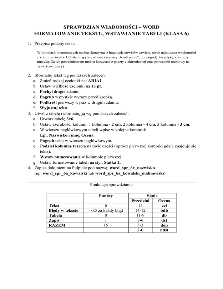SPRAWDZIAN WIADOMOŚCI – WORD FORMATOWANIE TEKSTU, WSTAWIANIE TABELI (KLASA 6) 1. Przepisz podany tekst: W portalach internetowych moŜna skorzystać z bogatych serwisów zawierających najnowsze wiadomości z kraju i ze świata. Udostępniają one równieŜ serwisy „tematyczne”, np. pogodę, turystykę, sport czy muzykę. Za ich pośrednictwem moŜna korzystać z poczty elektronicznej oraz prowadzić rozmowy na Ŝywo (tzw. czaty). 2. Sformatuj tekst wg poniŜszych zaleceń: a. Zmień rodzaj czcionki na: ARIAL. b. Ustaw wielkość czcionki na 13 pt. c. Pochyl drugie zdanie. d. Pogrub wszystkie wyrazy przed kropką. e. Podkreśl pierwszy wyraz w drugim zdaniu. f. Wyjustuj tekst. 3. Utwórz tabelę i sformatuj ją wg poniŜszych zaleceń: a. Utwórz tabelę 3x6. b. Ustaw szerokości kolumn: 1 kolumna - 2 cm, 2 kolumna - 4 cm, 3 kolumna - 3 cm. c. W wierszu nagłówkowym tabeli wpisz w kolejne komórki: Lp., Nazwisko i imię, Ocena. d. Pogrub tekst w wierszu nagłówkowym. e. Podziel kolumnę trzecią na dwie części (oprócz pierwszej komórki gdzie znajduje się tekst). f. Wstaw numerowanie w kolumnie pierwszej. g. Ustaw formatowanie tabeli na styl: Siatka 2. 4. Zapisz dokument na Pulpicie pod nazwą: word_spr_6x_nazwisko (np. word_spr_6a_kowalski lub word_spr_6a_kowalski_malinowski). Punktacja sprawdzianu: Punkty Tekst Błędy w tekście Tabela Zapis RAZEM 6 - 0,5 za kaŜdy błąd 8 1 15 Skala Przedział Ocena 15 cel 14-12 bdb 11-9 db 8-6 dst 5-3 dop 2-0 ndst SPRAWDZIAN WIADOMOŚCI – WORD FORMATOWANIE TEKSTU, WSTAWIANIE TABELI (KLASA 6) ROZWIĄZANIE W portalach internetowych moŜna skorzystać z bogatych serwisów zawierających najnowsze wiadomości z kraju i ze świata. Udostępniają one równieŜ serwisy „tematyczne”, np. pogodę, turystykę, sport czy muzykę. Za ich pośrednictwem moŜna korzystać z poczty elektronicznej oraz prowadzić rozmowy na Ŝywo (tzw. czaty). Lp. 1. 2. 3. 4. 5. Nazwisko i imię Ocena Punktacja sprawdzianu: Punkty Tekst Błędy w tekście Tabela Zapis RAZEM 6 - 0,5 za kaŜdy błąd 8 1 15 Skala Przedział Ocena 15 cel 14-12 bdb 11-9 db 8-6 dst 5-3 dop 2-0 ndst