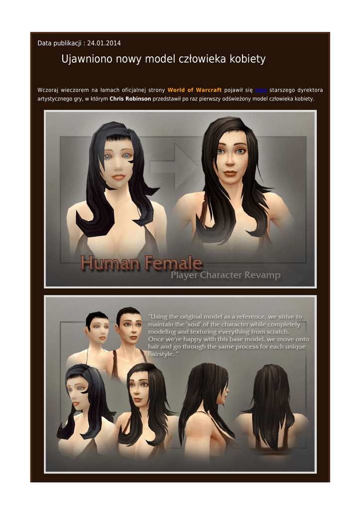 Data publikacji : 24.01.2014 Ujawniono nowy model człowieka kobiety Wczoraj wieczorem na łamach oficjalnej strony World of Warcraft pojawił się wpis starszego dyrektora artystycznego gry, w którym Chris Robinson przedstawił po raz pierwszy odświeżony model człowieka kobiety. Autor: Sigmar Data publikacji : 24.01.2014 Tagi: Chris Robinson, modele postaci Liczba wyświetleń strony: 4208 Komentarz (3) dodaj komentarz Fajny!~BeLial Battlenet Network 2014/01/24 08:10 Widać, że gra się rozwija :P W becie US w 2004 roku grałem na athlonie 800Mhz i nic nie cieło. Teraz by już się tak nie dało :P~ElemenT Battlenet Network 2014/01/24 10:05 http://media.wow-europe.com/infographic/pl/world-of-warcraft-infographic.html wow jaki WoW :D i to PL szok ;]~VeR 2014/01/28 21:38 dodaj komentarz Pozostałe nowości Zapowiedź zmian w klasach - Mnich Legion wkroczył w fazę alfa testów w czasie których dostępna jest póki co jedynie lokacja startowa łowców demonów, a my przyglądamy się temu, jakich zmian doczeka się klasa, która stosunkowo niedawno pojawiła się w World of Warcraft. Oto co na najnowszy dodatek Blizzard przygotował dla mnichów.Data publikacji: 24.11.20150 Zapowiedź zmian w klasach - Wojownik Po krótkiej przerwie wracamy z tłumaczeniami blogów poświęconych zmianom, jakie pojawią się w klasach w nadchodzącym dodatku do World of Warcraft. Oto czego powinni spodziewać się wojownicy z Azeroth w LegionieData publikacji: 23.11.20150 Zapowiedź zmian w klasach - Szaman Kolejna zapowiedzieć, która pojawiła się jakiś czas temu na łamach oficjalnej strony społecznościowej dotyczy szamana. Największe zmiany w przypadku tej klasy dotknęły totemy oraz system zasobów specjalizacji Elemental oraz EnhancementData publikacji: 16.11.20150 11 urodziny World of Warcraft World of Warcraft obchodzi już swoje 11 urodziny. Z tej okazji Blizzard przygotował kilka zabawek, które powinny wszystkim przypomnieć sam początek przygody w świecie Azeroth - w rolach głównych Edwin VanCleef, Hogger, murlok oraz Windfury (w wersji nadmuchiwanej).Data publikacji: 16.11.20150 Zapowiedź zmian w klasach - Rycerz śmierci Kolejna zapowiedź opublikowana na łamach oficjalnej strony społecznościowej World of Warcraft poświęcona jest klasie rycerzy śmierci. Poniżej znajdziecie informacje między innymi o ujednoliceniu wszystkich run oraz nowej umiejętności specjalizacji Blood, która została zainspirowana Lordem Marrowgarem z Icecrown Citadel.Data publikacji: 15.11.20150 Wszystkie nowości