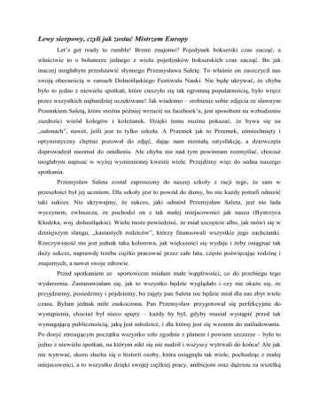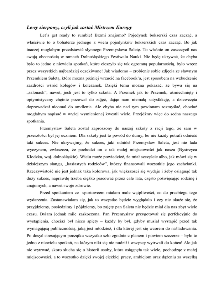 Lewy sierpowy, czyli jak zostać Mistrzem Europy Let’s get ready to rumble! Brzmi znajomo? Pojedynek bokserski czas zacząć, a właściwie to o bohaterze jednego z wielu pojedynków bokserskich czas zacząć. Bo jak inaczej mogłabym przedstawić słynnego Przemysława Saletę. To właśnie on zaszczycił nas swoją obecnością w ramach Dolnośląskiego Festiwalu Nauki. Nie będę ukrywać, że chyba było to jedno z niewielu spotkań, które cieszyło się tak ogromną popularnością, było wręcz przez wszystkich najbardziej oczekiwane! Jak wiadomo – zrobienie sobie zdjęcia ze sławnym Przemkiem Saletą, które można później wrzucić na facebook’a, jest sposobem na wzbudzenie zazdrości wśród kolegów i koleżanek. Dzięki temu można pokazać, że bywa się na „salonach”, nawet, jeśli jest to tylko szkoła. A Przemek jak to Przemek, uśmiechnięty i optymistyczny chętnie pozował do zdjęć, dając nam niemałą satysfakcję, a dziewczęta doprowadzał nieomal do omdlenia. Ale chyba nie nad tym powinnam rozmyślać, chociaż mogłabym napisać w wyżej wymienionej kwestii wiele. Przejdźmy więc do sedna naszego spotkania. Przemysław Saleta został zaproszony do naszej szkoły z racji tego, że sam w przeszłości był jej uczniem. Dla szkoły jest to powód do dumy, bo nie każdy potrafi odnieść taki sukces. Nie ukrywajmy, że sukces, jaki odniósł Przemysław Saleta, jest nie lada wyczynem, zwłaszcza, że pochodzi on z tak małej miejscowości jak nasza (Bystrzyca Kłodzka, woj. dolnośląskie). Wielu może powiedzieć, że miał szczęście albo, jak mówi się w dzisiejszym slangu, „kasiastych rodziców”, którzy finansowali wszystkie jego zachcianki. Rzeczywistość nie jest jednak taka kolorowa, jak większości się wydaje i żeby osiągnąć tak duży sukces, naprawdę trzeba ciężko pracować przez całe lata, często poświęcając rodzinę i znajomych, a nawet swoje zdrowie. Przed spotkaniem ze sportowcem miałam małe wątpliwości, co do przebiegu tego wydarzenia. Zastanawiałam się, jak to wszystko będzie wyglądało i czy nie okaże się, że przyjdziemy, posiedzimy i pójdziemy, bo zajęty pan Saleta nie będzie miał dla nas zbyt wiele czasu. Byłam jednak mile zaskoczona. Pan Przemysław przygotował się perfekcyjnie do wystąpienia, chociaż był nieco spięty – każdy by był, gdyby musiał wystąpić przed tak wymagającą publicznością, jaką jest młodzież, i dla której jest się wzorem do naśladowania. Po dosyć stresującym początku wszystko szło zgodnie z planem i powiem szczerze – było to jedno z niewielu spotkań, na którym nikt się nie nudził i wszyscy wytrwali do końca! Ale jak nie wytrwać, skoro słucha się o historii osoby, która osiągnęła tak wiele, pochodząc z małej miejscowości, a to wszystko dzięki swojej ciężkiej pracy, ambicjom oraz dążeniu za wszelką cenę do celu. Niewielu ma w sobie tyle samozaparcia i determinacji, żeby realizować swoje marzenia bez względu na przeciwności losu czy opinie innych ludzi. Tak, często zazdrość innych jest jeszcze większą przeszkodą niż brak pieniędzy, ponieważ wszyscy za wszelką cenę próbują udowodnić, że się nie da. Proszę Państwa, jak się chce, to wszystko da się zrobić! Ale przecież nie samą pracą człowiek żyje. Czym byłoby życie bez odrobiny przyjemności i szaleństwa? Nasz gość opowiedział nam o swoim pobycie w Stanach Zjednoczonych, gdzie przede wszystkim trenował, aby później zostać Mistrzem Europy w boksie zawodowym, ale nie tylko. Poznał tam wielu ludzi, z którymi spędził mnóstwo radosnych chwil, zwiedził wiele miejsc, które do końca życia zostaną w jego pamięci. Zaznaczył jednak, że jego droga kariery nie była usłana różami, ponieważ był w jego życiu okres, kiedy sława za bardzo uderzyła mu do głowy i z tego powodu zrobił wiele rzeczy, których nie powinien. Jednak każda porażka czy słabsza chwila niesie ze sobą jakąś naukę, która ma wpływ na nasze późniejsze decyzje. Saleta jest inteligentnym człowiekiem i potrafi zachęcić do działania. Może nie każdy, ale większość po spotkaniu z nim chciała coś zmienić w swoim życiu, bardziej poświęcić się swoim pasjom, aby mieć szansę osiągnąć, chociaż połowę sukcesu, jaki osiągnął Przemysław Saleta. On sam uważa, że jeśli sami nie zrealizujemy swoich marzeń, nikt nie zrobi tego za nas i jeśli nie zrobimy tego tu i teraz, będziemy żałować, że tego nie zrobiliśmy. Jednak wszystko, co dobre szybko się kończy, a w tym przypadku nawet zbyt szybko. Nim się obejrzałam, trzeba było już się żegnać, wracać do szkolnej rzeczywistości. Jak przystało na porządnych uczniów, stanęliśmy na wysokości zadania, dziękując Przemysławowi Salecie za to, że zechciał nas odwiedzić i opowiedzieć nam swoją historię. Miałam wrażenie, że on był bardziej wdzięczny nam niż my jemu, ponieważ do samego końca cierpliwe robił sobie zdjęcia, z czego oczywiście skorzystałam, i rozdawał autografy. Nie myślałam, że jest to tak sympatyczny człowiek, bo jak wiadomo media kreują własny wizerunek człowieka, który jest często sprzeczny z rzeczywistością. Spotkanie mogę podsumować wypowiedzią jednego z uczniów: „Pan Przemek to równy gość i szacun za to, co zrobił!” No cóż, być może już nigdy nie trafi nam się okazja spotkania Salety, ale ten jeden raz wystarczył, żeby wzbudzić w każdym determinację do spełniania swoich marzeń. Zuzanna Pers, kl. II A LO ZSO – I Liceum Ogólnokształcące im. Powstańców Śląskich Ul. Sempołowskiej 13, 57-500 Bystrzyca Kłodzka