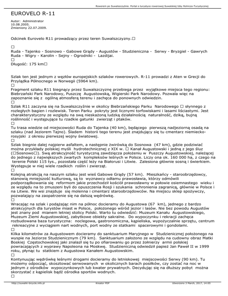 Rowerem po Suwalszczyźnie. Portal o turystyce rowerowej Suwalskiej Izby Rolniczo-Turystycznej EUROVELO R-11 Autor: Administrator 10.08.2005. Zmieniony 22.07.2009. Odcinek Eurovelo R11 prowadzący przez teren Suwalszczyzny. Ruda - Tajenko - Sosnowo - Gabowe Grądy - Augustów - Studzieniczna - Serwy - Bryzgiel - Gawrych Ruda - Wigry - Karolin - Sejny - Ogrodniki - Lazdijai. Długość: 175 km Szlak ten jest jednym z węzłów europejskich szlaków rowerowych. R-11 prowadzi z Aten w Grecji do Przylądka Północnego w Norwegii (5964 km). Fragment szlaku R11 biegnący przez Suwalszczyznę przebiega przez wyjątkowe miejsca tego regionu: Biebrzański Park Narodowy, Puszczę Augustowską, Wigierski Park Narodowy. Pozwala więc na zapoznanie się z ogólną atmosferą terenu i zachęca do ponownych odwiedzin. Szlak R11 zaczyna się na Suwalszczyźnie w okolicy Biebrzańskiego Parku Narodowego słynnego z rozległych bagien i rozlewisk. Teren Parku pokryty jest licznymi torfowiskami i lasami liściastymi. Jest charakterystyczny ze względu na swą nieskażoną ludzką działalnością naturalność, dziką, bujną roślinność i występujące tu rzadkie gatunki zwierząt i ptaków. Tu trasa wiedzie od miejscowości Ruda do Tajenka (40 km), będącego pierwszą nadjeziorną osadą na szlaku (nad Jeziorem Tajno). Śladem historii tego terenu jest znajdujący się tu cmentarz niemieckorosyjski z okresu pierwszej wojny światowej. Szlak biegnie dalej najpierw asfaltem, a następnie żwirówką do Sosnowa (47 km), gdzie podziwiać można przykłady polskiej myśli hydrotechnicznej z XIX w. Kanał Augustowski i jedną z jego śluz (Sosnowo). Swą atrakcyjność turystyczną zawdzięcza położeniu w Puszczy Augustowskiej, należącej do jednego z największych zwartych kompleksów leśnych w Polsce. Liczy ona ok. 160 000 ha, z czego na terenie Polski 115 tys., pozostała część leży na Białorusi i Litwie. Zalesiona głównie sosną i świerkiem. Występuje w niej wiele rzadkich roślin i zwierząt. Kolejną atrakcją na naszym szlaku jest wieś Gabowe Grądy (57 km). Mieszkańcy - staroobrzędowcy, stanowią mniejszość kulturową, są to wyznawcy odłamu prawosławia, którzy odmówili podporządkowania się reformom jakie przechodził kościół prawosławny w połowie osiemnastego wieku i ze względu na to zmuszeni byli do opuszczenia Rosji i szukania schronienia zagranicą, głównie w Polsce i na Litwie. We wsi znajduje się molenna i cmentarz staroobrzędowców. Na miejscu sklep spożywczy, pozwalający na zaopatrzenie się na dalszą wędrówkę. Wracając na szlak i podążając nim na północ docieramy do Augustowa (67 km), jednego z bardzo atrakcyjnych dla turystów miast w Polsce, położonego wśród jezior i lasów. Nie bez powodu Augustów jest znany pod mianem letniej stolicy Polski. Warto tu odwiedzić: Muzeum Kanału Augustowskiego, Muzeum Ziemi Augustowskiej, zabytkowe obiekty sakralne. Do wypoczynku i rekracji zachęca rozbudowana baza turystyczna: noclegowa, gastronomiczna, kąpieliska, wypożyczalnie sprzętu, centrum rekreacyjne z wyciągiem nart wodnych, port wodny ze statkami spacerowymi i gondolami. Kilka kilometrów za Augustowem docieramy do sanktuarium Maryjnego w Studzienicznej położonego na wyspie na Jeziorze Studzienicznym (79 km). Sanktuarium założono ze względu na cudowny obraz Matki Boskiej Częstochowskiej jaki znalazł się tu po ofiarowaniu go przez żołnierzy armii polskiej powracających z wyprawy Napoleona na Moskwę. Studzieniczną odwiedził papież Jan Paweł II w 1999 roku, płynąc tu statkiem z Augustowa Kanałem Augustowskim. Kontynuując wędrówkę leśnymi drogami docieramy do letniskowej miejscowości Serwy (90 km). Tu możemy odpocząć, skosztować serwowanych w okolicznych barach posiłków, czy zostać na noc w jednym z ośrodków wypoczynkowych lub kwater prywatnych. Decydując się na dłuższy pobyt można skorzystać z kąpielisk bądź ośrodka sportów wodnych. http://suwalki-bicycle.info.pl Kreator PDF Utworzono 3 March, 2017, 14:05 Rowerem po Suwalszczyźnie. Portal o turystyce rowerowej Suwalskiej Izby Rolniczo-Turystycznej Kiedy zdecydujemy się na ponowne wyruszenie na wędrówkę szlakiem Eurovelo R11, dotrzemy do kolejnej letniskowej miejscowości, a mianowicie do Bryzgla (110 km). Wieś ta położona jest na brzegu największego i zarazem uznawanego za najpiękniejsze na Suwalszczyźnie Jeziora Wigry, stanowiącego raj dla kajakarzy, żeglarzy i miłośników wędkarstwa. Jezioro to wpisane jest na międzynarodową listę obiektów wodnych z bogatą florą i fauną projektu - Project Aqua Conservation Programme. Ma rozwiniętą linię brzegową z licznymi półwyspami i wyspami. Owiane jest mgłą legend i tajemnic. Jezioro otacza Wigierski Park Narodowy o powierzchni 15085 ha, mający za cel zachować unikalny charakter tutejszej przyrody. Kilka kilometrów dalej mijamy kolejną letniskową miejscowość położoną nad Wigrami z jej ośrodkami wypoczynkowymi, plażami i kąpieliskami - Gawrych Rudę (115 km). W pobliżu linia kolejki wąskotorowej, 2 wypożyczalnie rowerów, baza noclegowa i gastronomiczna, sklepy. W końcu przemierzając teren Wigierskiego Parku Narodowego docieramy do wypoczynkowej miejscowości Stary Folwark (124 km) posiadającej rozwiniętą infrstrukturę turystyczną - sklep, bar, ośrodki wypoczynkowe. Na dalszym etapie wędrówki dojeżdżamy do wsi Wigry (130 km) położonej na niewielkiej wysepce Jeziora Wigry połączonej z lądem groblą. Miejsce to znane jest ze względu na barkowy pokamedulski klasztor wybudowany w latach 1694-1745. Położenie w otoczeniu jezior i lasów, a także zabytkowy kościół na wzgórzu, czynią z klasztoru prawdziwą atrakcję, uświetnioną faktem, iż w 1999 roku przebywał tu w czasie swej pielgrzymki do Polski papież Jan Paweł II. W sezonie rejs papieskim statkiem po wodach jeziora Wigry umożliwia poznanie jego uroku. Atrakcją na drodze do Sejn jest