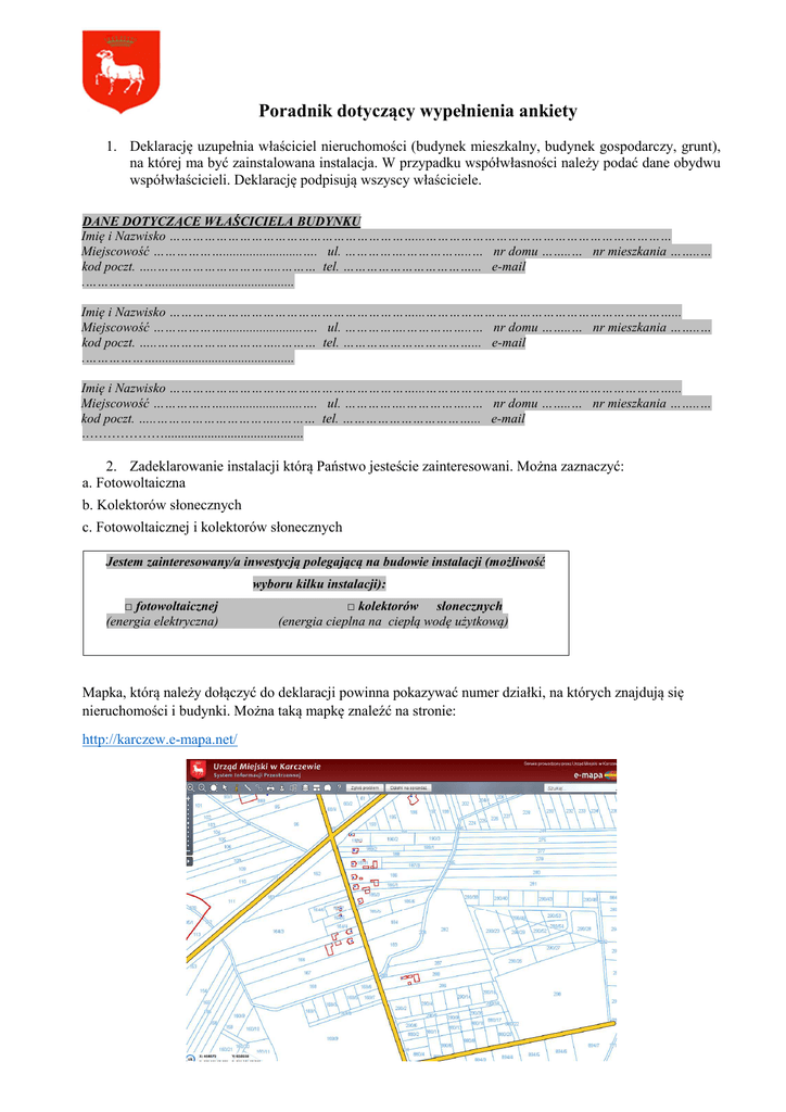 Poradnik dotyczący wypełnienia ankiety 1. Deklarację uzupełnia właściciel nieruchomości (budynek mieszkalny, budynek gospodarczy, grunt), na której ma być zainstalowana instalacja. W przypadku współwłasności należy podać dane obydwu współwłaścicieli. Deklarację podpisują wszyscy właściciele. DANE DOTYCZĄCE WŁAŚCICIELA BUDYNKU Imię i Nazwisko ………………………………………………………...……………………………………………………… Miejscowość ………………........................…. ul. …………….……………..… nr domu ……..… nr mieszkania ……..… kod poczt. …..…………………………..……… tel. ……………………………... e-mail .……………….......................................... Imię i Nazwisko ………………………………………………………...………………………………………………………... Miejscowość ………………........................…. ul. …………….……………..… nr domu ……..… nr mieszkania ……..… kod poczt. …..…………………………..……… tel. ……………………………... e-mail .……………….......................................... Imię i Nazwisko ………………………………………………………...………………………………………………………... Miejscowość ………………........................…. ul. …………….……………..… nr domu ……..… nr mieszkania ……..… kod poczt. …..…………………………..……… tel. ……………………………... e-mail .……………….......................................... 2. Zadeklarowanie instalacji którą Państwo jesteście zainteresowani. Można zaznaczyć: a. Fotowoltaiczna b. Kolektorów słonecznych c. Fotowoltaicznej i kolektorów słonecznych Jestem zainteresowany/a inwestycją polegającą na budowie instalacji (możliwość wyboru kilku instalacji): □ fotowoltaicznej (energia elektryczna) □ kolektorów słonecznych (energia cieplna na ciepłą wodę użytkową) Mapka, którą należy dołączyć do deklaracji powinna pokazywać numer działki, na których znajdują się nieruchomości i budynki. Można taką mapkę znaleźć na stronie: http://karczew.e-mapa.net/ Jeżeli montaż instalacji ma być na: • budynku, który jest budowany w 2015 roku • elewacji budynku Prosimy o dołączenie zdjęcia powierzchni, gdzie ma być zainstalowana instalacja (zdjęcie budynku, elewacji – mile widziane podanie wymiarów). 3. Wskazanie dwóch możliwych lokalizacji instalacji. Należy w tabeli wpisać możliwe lokalizacje instalacji (budynek mieszkalny, budynek gospodarczy, grunt) w kolumnie o nazwie „obiekt A” i „Obiekt B”. Na przykład w kolumnie „Obiekt A” we wskazane miejsce wpisać „Budynek mieszkalny” a w kolumnie „Obiekt B” wpisać „Grunt” lub „Budynek gospodarczy”. I. Charakterystyka obiektów budowlanych wchodzących w skład gospodarstwa domowego Obiekt A Obiekt B Wyszczególnienie ………………………….. ………………………….. 4. Podanie numeru działek na której znajdują się nieruchomości. Jeżeli obiekt leży na więcej niż jednej działce należy podać wszystkie, na których położony jest obiekt. W tabele należy również wpisać adres lokalizacji nieruchomości. Numer działki/-ek (na której mieści się obiekt) Adres nieruchomości 5. Należy podać rok budowy obiektu oraz wskazać czy właściciele uzupełnieni na pierwszej stronie deklaracji mają tytuł prawny do obiektu jak również wskazać czy budynki mają powyżej czy poniżej 300 m2 – informacja o powierzchni będzie weryfikowana. Rok budowy Posiadany tytuł prawny do obiektu (1) Powierzchnia użytkowa budynku poniżej 300 m2 (2) tak / nie * tak / nie * tak / nie * tak / nie * 6. Dla instalacji kolektorów słonecznych oraz fotowoltaicznej należy wskazać powierzchnię na obiekcie do zainstalowania instalacji. Jeżeli powierzchnią jest dach, na którym ma być zainstalowana instalacja fotowoltaiczna lub kolektorów słonecznych, to powinien być skierowany na południe z dopuszczalnym odchyleniem od południa o 200 (nie mylić ze spadem dachu) na wschód lub na zachód. W przypadku większych odchyleń należy wskazać, lokalizację (w pozycji Obiekt B) dogodniejszą, bądź wskazać czy jest możliwość zainstalowania instalacji na gruncie. Rekomendowanym miejscem instalacji kolektorów słonecznych jest dom mieszkalny. Instalację fotowoltaiczną można zamontować na domu mieszkalnym, budynku gospodarczym, gruncie. Podając powierzchnię na dachu spadowym lub płaskim podajemy taką część dachu stanowiącą zwartą powierzchnię bez przeszkód w postaci: okien, kominów itp. W przypadku montażu instalacji na dachach należy podać rodzaj pokrycia dachowego (eternit, blacha, itd.). W przypadku montażu instalacji fotowoltaicznych na elewacji, prosimy pamiętać, iż w takich miejscach potrzeba dwa razy więcej miejsca na 1 kW (potrzeba 12 m2 a nie 6 m2). Miejsca, gdzie będzie instalacja (dach, grunt) nie powinny w ciągu dnia być zacieniane przez obiekty (drzewa, budynki). Dla instalacji na elewacji i gdy Właściciel nieruchomości nie jest pewien czy się uda ją zlokalizować na obiekcie, prosimy o dołączenie zdjęcia wydrukowanego (czarnobiałe jest wystarczające) nieruchomości od strony południowej (dachu lub elewacji). Powierzchnia południowej ekspozycji dachu dla instalację wykorzystującą energię słońca w [m2] Lub Elewacji (gdy nie ma miejsca na dachu) Rodzaj pokrycia dachowego(3) 7. W przypadku wnioskowania o instalację kolektorów słonecznych należy podać ilość osób zamieszkujących dom mieszkalny na stałe. W przypadku, gdy cześć rodziny (np. studiujący poza miejscem zamieszkania członkowie rodziny) przebywa w obiekcie tymczasowo należy nie wliczać tyc