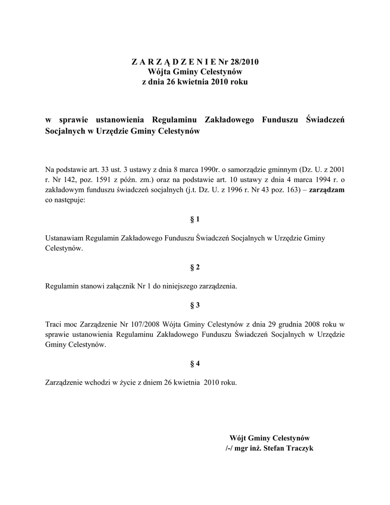 Z A R Z Ą D Z E N I E Nr 28/2010 Wójta Gminy Celestynów z dnia 26 kwietnia 2010 roku w sprawie ustanowienia Regulaminu Zakładowego Funduszu Świadczeń Socjalnych w Urzędzie Gminy Celestynów Na podstawie art. 33 ust. 3 ustawy z dnia 8 marca 1990r. o samorządzie gminnym (Dz. U. z 2001 r. Nr 142, poz. 1591 z późn. zm.) oraz na podstawie art. 10 ustawy z dnia 4 marca 1994 r. o zakładowym funduszu świadczeń socjalnych (j.t. Dz. U. z 1996 r. Nr 43 poz. 163) – zarządzam co następuje: §1 Ustanawiam Regulamin Zakładowego Funduszu Świadczeń Socjalnych w Urzędzie Gminy Celestynów. §2 Regulamin stanowi załącznik Nr 1 do niniejszego zarządzenia. §3 Traci moc Zarządzenie Nr 107/2008 Wójta Gminy Celestynów z dnia 29 grudnia 2008 roku w sprawie ustanowienia Regulaminu Zakładowego Funduszu Świadczeń Socjalnych w Urzędzie Gminy Celestynów. §4 Zarządzenie wchodzi w życie z dniem 26 kwietnia 2010 roku. Wójt Gminy Celestynów /-/ mgr inż. Stefan Traczyk REGULAMIN ZAKŁADOWEGO FUNDUSZU ŚWIADCZEŃ SOCJALNYCH w Urzędzie Gminy Celestynów I. Przepisy wstępne §1 1. Regulamin Zakładowego Funduszu Świadczeń Socjalnych w Urzędzie Gminy Celestynów tworzy się na podstawie następujących przepisów: - art. 8 ust. 2 ustawy z dnia 4 marca 1994 r. o zakładowym funduszu świadczeń socjalnych (tekst jednolity Dz. U. z 1996 r. Nr 70, poz. 335 z późn. zm.) 2. Regulamin Zakładowego Funduszu Świadczeń Socjalnych w Urzędzie Gminy Celestynów, zwany dalej „Regulaminem”, określa: - przeznaczenie środków socjalnych na poszczególne cele i rodzaje działalności socjalnej, - osoby uprawnione do korzystania ze środków Funduszu. - zasady i warunki korzystania z usług i świadczeń finansowanych ze środków Funduszu. 3. Ilekroć w Regulaminie mowa jest o: 1) Funduszu – rozumieć przez to należy zakładowy fundusz świadczeń socjalnych w Urzędzie Gminy Celestynów, 2) Pracodawcy – rozumieć przez to należy Wójta Gminy Celestynów, który administruje środkami Funduszu, 3) ustawie – rozumieć przez to należy ustawę z dnia 4 marca 1994 r. o zakładowym funduszu świadczeń socjalnych (dz. U. nr 70, poz. 335 z 1996 r. z póź. zm.), 4) Przedstawicielu Załogi – rozumieć przez to należy osobę wybraną przez załogę do reprezentowania jej interesów. 3. Fundusz tworzy się z corocznego odpisu podstawowego, naliczanego w stosunku do przeciętnej liczby zatrudnionych, w wysokości określonej przez ustawę. 4. Środki Funduszu mogą być zwiększone o wpływy, środki i przychody przewidziane w art. 7 ustawy. 5. Środki niewykorzystane w danym roku kalendarzowym przechodzą na rok następny. 6. Środki Funduszu są gromadzone na odrębnym rachunku bankowym. II. Przeznaczenie Zakładowego Funduszu Świadczeń Socjalnych. §2 1. Środki Funduszu przeznacza się na finansowanie działalności socjalnej organizowanej na rzecz osób uprawnionych do korzystania z Funduszu w tym : 1) zapomogi pieniężne bezzwrotne w razie wypadków losowych, długotrwałej choroby lub ubóstwa, 2) dofinansowanie raz w roku kalendarzowym wypoczynku urlopowego pracowników, 3) dofinansowanie działalności kulturalno-oświatowej w postaci organizacji spotkań integracyjnych, zakupu biletów na imprezy artystyczne, kulturalne, rozrywkowe i sportowe oraz sprzętu sportowego do wspólnego użytku, 4) pożyczki zwrotne na cele mieszkaniowe. III. Osoby uprawnione do korzystania z Zakładowego Funduszu Świadczeń Socjalnych. §3 1. Ze świadczeń Funduszu mają prawo korzystać : 1) pracownicy zatrudnieni w Urzędzie Gminny Celestynów niezależnie od rodzaju umowy o pracę oraz od wymiaru czasu pracy, 2) pracownicy przebywający na urlopach wychowawczych, 3) emeryci i renciści, zatrudnieni przed przejściem na emeryturę lub rentę w Urzędzie Gminy Celestynów, 4) członkowie rodzin osób wymienionych w pkt. 1-3. 2. Członkami rodzin, o których mowa w ust. 1 pkt. 4) są : 1) współmałżonkowie, 2) pozostające na utrzymaniu i wychowaniu osoby uprawnionej dzieci własne, dzieci przysposobione oraz przyjęte na wychowanie w ramach rodziny zastępczej do lat 18, a jeżeli kształcą się w szkole – do czasu ukończenia nauki, nie dłużej jednak niż do ukończenia 25 lat, a osoby niepełnosprawne bez względu na wiek. 3. W razie zbiegu uprawnień i braku możliwości przyznania świadczeń wszystkim uprawnionym, pierwszeństwo do korzystania z funduszu przysługuje osobom: 1) posiadającym rodziny wielodzietne tzn. wychowującym troje i więcej dzieci, 2) wychowującym dzieci, które ze względu na stan zdrowia wymagają specjalnej opieki i leczenia, a także dzieci całkowicie lub częściowo osierocone, 3) samotnie wychowującym dzieci. IV. Zasady i warunki przyznawania świadczeń socjalnych. §4 1. Przyznanie i wysokość świadczenia ze środków Funduszu uzależniona jest od sytuacji życiowej, rodzinnej i materialnej, a w przypadku pomocy mieszkaniowej również od sytuacji mieszkaniowej i ma charakter uznaniowy. Osoby korzystające ze świadczeń socjalnych są obowiązane informować Pracodawcę o zmianach ich sytuacji życiowej, rodzinnej i materialnej, mających wpływ na uprawnienia do świadczeń z Funduszu. 2. Świadczenia w postaci zapomóg pieniężnych, dofinansowania wypoczynku, a także pożyczki zwrotnej na cele mieszkaniowe udzielane są na podstawie wniosków osób uprawnionych. 3. Sytuacja materialna jest ustalana według kryterium dochodu przypadającego na jednego członka rodziny osoby uprawnionej w okresie 6 miesięcy przed złożeniem wniosku. 4. Przy ustalaniu dochodu brutto przypadającego na jedną osobę w rodzinie przyjmuje się wszystkie stałe dochody pracownika, jego współmałżonka oraz innych osób z nim zamieszkujących i wspólnie prowadzących gospodarstwo domowe. 5. Ubiegający się o świadczenie socjalne wykazuje w/w dochód w pisemnym oświadczeniu, wraz z załączonymi kopiami zeznań wszystkich zamieszkujących i prowadzących ws