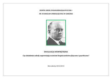 ZESPÓŁ SZKÓŁ PONADGIMNAZJALNYCH NR 1 IM. STANISŁAWA MIKOŁAJCZYKA W GNIEŹNIE EWALUACJA WEWNĘTRZNA Czy działania szkoły zapewniają uczniom bezpieczeństwo fizyczne i psychiczne? Rok szkolny 2013/2014 WSTĘP Ewaluacja wewnętrzna została przeprowadzona w oparciu o podstawę prawną, którą stanowi Rozporządzenie Ministra Edukacji Narodowej z dnia 7 października 2009r. w sprawie nadzoru pedagogicznego (Dz.U. z 2009 r. Nr 168 poz. 1324) oraz Rozporządzenie Ministra Edukacji Narodowej z dnia 10 maja 2013r. zmieniające rozporządzenie w sprawie nadzoru pedagogicznego (Dz.U. z 2013r. poz. 560). W roku szkolnym 2013/2014 ewaluacja dotyczyła bezpośrednio wymagania dotyczącego respektowania norm społecznych w szkole. Istotnym warunkiem prawidłowego procesu uczenia się jest poczucie bezpieczeństwa. Aktywność intelektualna nierozerwalnie związana jest ze stanem psychicznej równowagi. Z tej przyczyny niezwykle istotną kwestią wydaje się być poznawanie zasad i rozumienie ich znaczenia, co dla społeczności szkolnej stanowi istotny element rozwoju. Również działania szkoły powinny koncentrować się na zapewnieniu uczniom bezpieczeństwa fizycznego i psychicznego oraz eliminowaniu zagrożeń i wzmacnianiu właściwych zachowań. Podczas prac ewaluacyjnych wykorzystano narzędzia badawcze przygotowane przez zespół do spraw ewaluacji. Ankiety, których grupą docelową byli nauczyciele oraz uczniowie, miały charakter anonimowy i podlegały analizie zbiorczej. Przygotowano także formularz wywiadu z dyrektorem Zespołu Szkół Ponadgimnazjalnych nr 1 im. Stanisława Mikołajczyka w Gnieźnie, Panią Iwoną Ratajczak. Do wywiadu z rodzicami wytypowano określoną liczbę: 12 respondentów. W trakcie prowadzenia zaplanowanych czynności ewaluacyjnych przeprowadzono: ankietowanie nauczycieli: łącznie 32 nauczycieli, z czego 2 ankiety odrzucono; ankietowanie uczniów: łącznie 89 uczniów. Nie odrzucono żadnej ankiety; wywiad z rodzicami: respondenci odpowiedzieli na 5 pytań; wywiad z dyrektorem Zespołu Szkół Ponadgimnazjalnych nr 1 im. Stanisława Mikołajczyka w Gnieźnie. Pani Iwona Ratajczak udzieliła odpowiedzi na 4 pytania; analizę wybranej dokumentacji szkolnej. Projekt ewaluacji sporządziły: Joanna Piechowiak oraz Monika Górecka, natomiast za przeprowadzenie poszczególnych czynności ewaluacji wewnętrznej w roku szkolnym 2013/2014, wraz ze sporządzeniem raportu końcowego, odpowiadały: Joanna Piechowiak, Marzena Idaszak – Wiewióra oraz Marzena Bociek. Spis treści: I. Cele i zakres ewaluacji wewnętrznej. 1. Przedmiot badań. 2. Cele ewaluacji wewnętrznej. 3. Kryteria ewaluacji. 4. Pytania kluczowe. II. Organizacja pracy w obszarach objętych ewaluacją. 1. Metody i narzędzia badawcze wykorzystane przy ewaluacji. 2. Wskazanie źródeł informacji. 3. Dobór próby badawczej. 4. Harmonogram czynności ewaluacyjnych. III. Prezentacja wyników ewaluacji. 1. Zbiorcze opracowanie ankiet ewaluacyjnych dla nauczycieli i uczniów. 2. Analiza dokumentów szkolnych. 3. Analiza wywiadów. IV. Wnioski i rekomendacje. 1. Wnioski z badań, czyli wartościowanie działań wynikające ze zgromadzonych informacji. 2. Rekomendacje, czyli propozycje działań, które mogą zmienić stan rzeczy na korzystniejszy. 3. Formy upowszechnienia raportu. V. Załączniki. 1. Kwestionariusze ankiet dla uczniów i nauczycieli. 2. Kwestionariusz wywiadu. 3. Kwestionariusz wywiadu fokusowego dla rodziców. I. Cele i zakres ewaluacji wewnętrznej. 1. Przedmiot badań: czy działania szkoły zapewniają uczniom bezpieczeństwo fizyczne i psychiczne? 2. Cele ewaluacji wewnętrznej: pozyskiwanie informacji dotyczących stopnia znajomości i przestrzegania norm społecznych w szkole, dostarczenie wszystkim uczestnikom życia szkolnego informacji dotyczących skuteczności podjętych działań mających na celu zapewnienie uczniom poczucia bezpieczeństwa fizycznego i psychicznego, gromadzenie wiadomości dotyczących działań podejmowanych w środowisku szkolnym mających na celu eliminowanie zagrożeń i wzmacnianie pożądanych zachowań oraz wprowadzaniu ich modyfikacji – w przypadku zaistniałej konieczności, zdiagnozowanie potrzeb wszystkich podmiotów społeczności szkolnej w zakresie działań profilaktycznych zmierzających do wzmacniania pożądanych zachowań uczniów. 3. Kryteria ewaluacji: w szkole prowadzona jest diagnoza zachowań uczniów i zagrożeń zaistniałych w środowisku szkolnym, uczniowie znają obowiązujące w szkole normy społeczne, w szkole podejmowane są różne działania o charakterze wychowawczym i profilaktycznym mające na celu eliminowanie zagrożeń oraz wzmacnianie pożądanych zachowań uczniów, uczestnicy życia szkoły czują się w niej bezpiecznie. 4. Pytania kluczowe: jaki jest stopień poczucia bezpieczeństwa fizycznego i psychicznego wśród uczniów? czy uczniowie, nauczyciele i rodzice potrafią wymienić działania, które są podejmowane w szkole w celu poprawy bezpieczeństwa psychicznego i fizycznego wszystkim jej podmiotom? jakie są propozycje zmian i modyfikacji działań już funkcjonujących służących poprawie bezpieczeństwa? czy uczniowie wiedzą, jakich zachowań się od nich oczekuje? w jakim stopniu działania szkoły rozwijają u uczniów umiejętność radzenia sobie z własną agresją? II. Organizacja pracy w obszarach objętych ewaluacją. 1. Metody i narzędzia badawcze wykorzystane przy ewaluacji: ankiety rozpowszechnione wśród uczniów i nauczycieli, wywiad, wywiad fokusowy, analiza dokumentacji szkolnej, arkusz diagnostyczny porównujący oceny z zachowania uczniów, strona internetowa szkoły. 2. Wskazanie źródeł informacji: nauczyciele ZSP nr 1 im. Stanisława Mikołajczyka w Gnieźnie, uczniowie ZSP nr 1 im. Stanisława Mikołajczyka w Gnieźnie, informacje pochodzące z wywiadu fokusowego z docelową grupą rodziców, informacje pochodzące z wywiadu przeprowadzonego z panią dyrektor Iwo