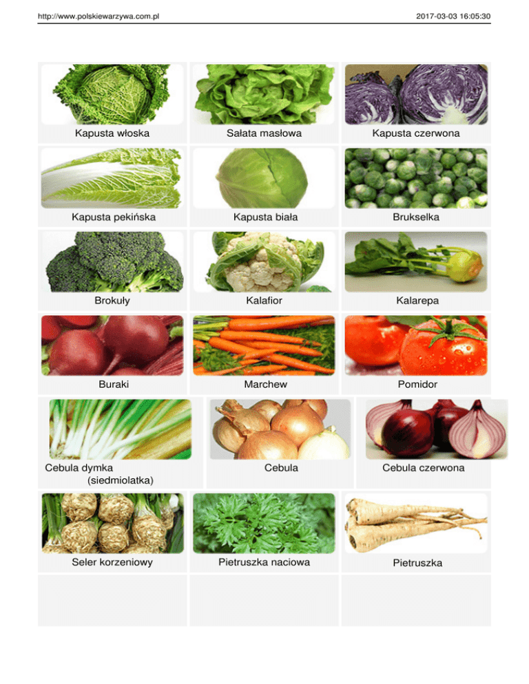 http://www.polskiewarzywa.com.pl 2017-03-03 16:05:30 Kapusta włoska Sałata masłowa Kapusta czerwona Kapusta pekińska Kapusta biała Brukselka Brokuły Kalafior Kalarepa Buraki Marchew Pomidor Cebula dymka (siedmiolatka) Seler korzeniowy Cebula Pietruszka naciowa Cebula czerwona Pietruszka http://www.polskiewarzywa.com.pl 2017-03-03 16:05:30 Cebula szalotka Sałata lodowa Cukinia Ogórek gruntowy Ogórek szklarniowy Rzodkiewka Kukurydza cukrowa Koper Fasola szparagowa Por Szczypiorek Papryka czerwona Papryka zielona Włoszczyzna pęczak Maliny Opakowanie: Fasola szparagowa żółta Papryka żółta Śliwki fioletowe http://www.polskiewarzywa.com.pl 2017-03-03 16:05:30 Carry bag Tacka + folia Flow-pack Raszel Folia z mikroperforacją Rękaw siatkowy Tacka +folia Worek foliowy perforowany Strona 3/3