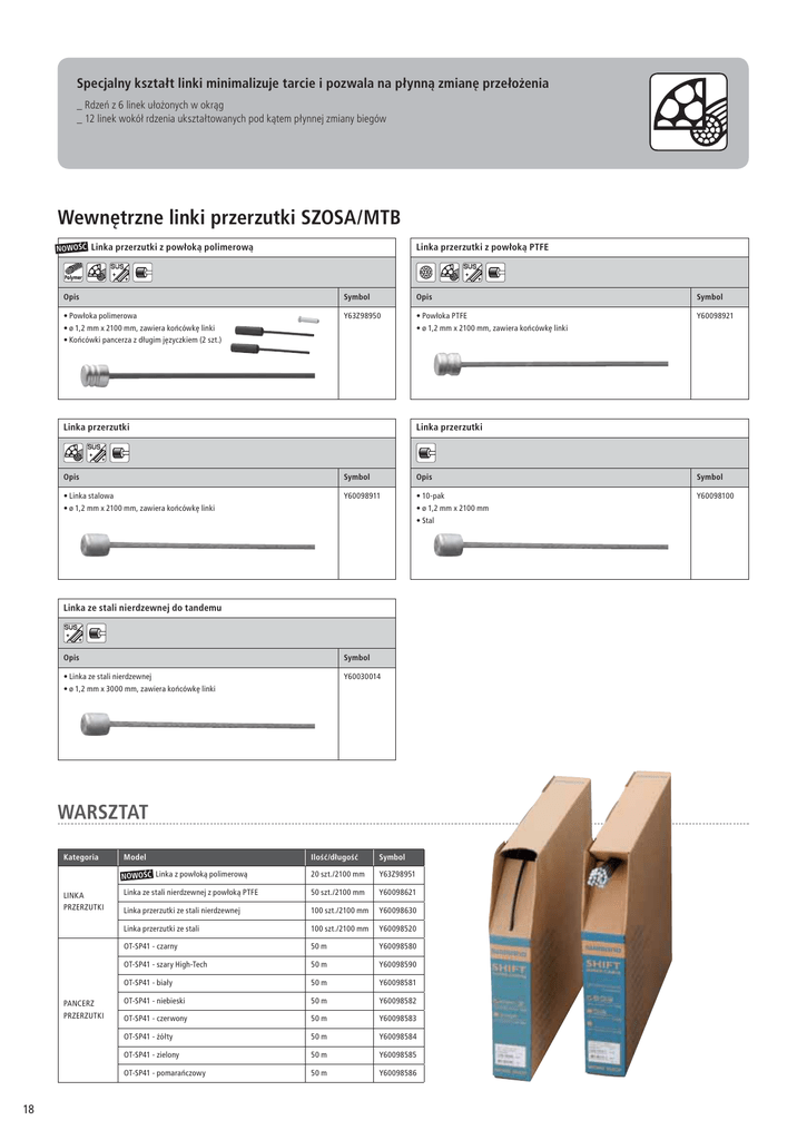 Specjalny kształt linki minimalizuje tarcie i pozwala na płynną zmianę przełożenia _ Rdzeń z 6 linek ułożonych w okrąg _ 12 linek wokół rdzenia ukształtowanych pod kątem płynnej zmiany biegów Wewnętrzne linki przerzutki SZOSA/MTB NOWOŚĆ Linka przerzutki z powłoką polimerową Linka przerzutki z powłoką PTFE Opis Symbol Opis Symbol • Powłoka polimerowa • ø 1,2 mm x 2100 mm, zawiera końcówkę linki • Końcówki pancerza z długim języczkiem (2 szt.) Y63Z98950 • Powłoka PTFE • ø 1,2 mm x 2100 mm, zawiera końcówkę linki Y60098921 Linka przerzutki Linka przerzutki Opis Symbol Opis Symbol • Linka stalowa • ø 1,2 mm x 2100 mm, zawiera końcówkę linki Y60098911 • 10-pak • ø 1,2 mm x 2100 mm • Stal Y60098100 Linka ze stali nierdzewnej do tandemu Opis Symbol • Linka ze stali nierdzewnej • ø 1,2 mm x 3000 mm, zawiera końcówkę linki Y60030014 WARSZTAT Kategoria LINKA PRZERZUTKI PANCERZ PRZERZUTKI 18 Model Ilość/długość Symbol NOWOŚĆ Linka z powłoką polimerową 20 szt./2100 mm Y63Z98951 Linka ze stali nierdzewnej z powłoką PTFE 50 szt./2100 mm Y60098621 Linka przerzutki ze stali nierdzewnej 100 szt./2100 mm Y60098630 Linka przerzutki ze stali 100 szt./2100 mm Y60098520 OT-SP41 - czarny 50 m Y60098580 OT-SP41 - szary High-Tech 50 m Y60098590 OT-SP41 - biały 50 m Y60098581 OT-SP41 - niebieski 50 m Y60098582 OT-SP41 - czerwony 50 m Y60098583 OT-SP41 - żółty 50 m Y60098584 OT-SP41 - zielony 50 m Y60098585 OT-SP41 - pomarańczowy 50 m Y60098586 Klocki hamulcowe Pancerz linki hamulca M system: do zastosowań MTB. Z miękką wyściółką pomagającą w płynnym hamowaniu. Układa się wokół kierownicy. SLR: do rowerów szosowych. Z twardą wyściółką zachowującą kształt nawet w trudnych warunkach. Układa się wokół kierownicy. Pancerz linki hamulca BC-9000: Wstępnie nasmarowany pancerz z miękką wkładką dla płynnego i skutecznego hamowania. Układa się wokół kierownicy. Hamulec tarczowy (okładziny / tarcze / przewody) Zestawy linek hamulca SZOSA NOWOŚĆ Zestaw linek hamulca z powłoką polimerową BC-9000 Kolor Symbol • Końcówki pancerza z języczkiem do BC-9000 (2 szt.) • Końcówki linki (2 szt.) Czarny Y8YZ98010 Biały Y8YZ98020 Czerwony Y8YZ98030 Szary High-Tech Y8YZ98040 Symbol Łańcuchy Drobne komponenty • ø 1,6 mm x 1000 mm (1 szt.) • ø 1,6 mm x 2000 mm (1 szt.) • Powłoka polimerowa* • Stal nierdzewna Kasety zębatek Linka • Pancerz linki hamulca BC-9000 • 1800 mm (1 szt.) • 800 mm (1 szt.) Linki Pancerz Zestaw linek hamulca z powłoką PTFE Linka Drobne komponenty Kolor • SLR 1400 mm • SLR 800 mm • ø 1,6 mm x 1000 mm • ø 1,6 mm x 2050 mm • Powłoka PTFE • Stal nierdzewna • Końcówki linki (2 szt.) • Końcówki pancerza (2 szt.) Czarny Y80098011 Biały Y80098012 Żółty Y80098013 Czerwony Y80098014 Niebieski Y80098015 Y80098016 Pomarańczowy Y80098017 Szary High-Tech Y80098018 Pancerz Linka Drobne komponenty Symbol • SLR 2200 mm • Cczarny • ø 1,6 mm x 1000 mm • ø 1,6 mm x 2050 mm • Stal nierdzewna • Końcówki linki (2 szt.) • Końcówki pancerza (2 szt.) Y80098019 Stosować BC-9000 (linki hamulcowe z powłoką polimerową) tylko przy hamulcach serii BR-9000. Przy innych kombinacjach linka nie zapewnia wystarczającego zaciskania. Może to powodować poluzowanie linki hamulcowej i utratę kontroli nad hamulcem i w prowadzić do ciężkich obrażeń. Osie suportu * Ostrzeżenie na temat linek hamulcowych z powłoką polimerową Kółeczka tylnej przerzutki Zestaw linek hamulca ze stali nierdzewnej Zielony Tarcze Pancerz Bloki Zestawy linek hamulca MTB Zestawy linek hamulca SZOSA/MTB Zestaw linek hamulca ze stali Narzędzia Zestaw linek hamulca ze stali nierdzewnej Linka Drobne komponenty Symbol Pancerz Linka Drobne komponenty Symbol • ø 1,6 mm x 1000 mm • ø 1,6 mm x 2050 mm • Stal nierdzewna • Końcówki linki (2 szt.) • Końcówki pancerza (2 szt.) Y80098021 • Pancerz do MTB 2200 mm • Czarny • ø 1,6 mm x 1000 mm • ø 1,6 mm x 2050 mm • Stal • Końcówki linki (2 szt.) • Końcówki pancerza z mosiądzu/ powlekana niklem (2 szt.) Y80098022 Smary i inne Pancerz • M system 2200 mm • Czarny 19 Linki hamulca SZOSA NOWOŚĆ Linka hamulca z powłoką polimerową BC-9000 Linka hamulca z powłoką PTFE Opis Symbol Opis Symbol • Powłoka polimerowa* • ø 1,6 mm x 2000 mm • Stal nierdzewna, zawiera końcowkę linki • Końcówki pancerza z języczkiem do BC-9000 (2 szt.) Y8YZ98050 • Powłoka PTFE • ø 1,6 mm x 2050 mm • Stal nierdzewna, zawiera końcówkę linki Y80098320 * patrz str. 19 Linka hamulca ze stali nierdzewnej Linka hamulca do tandemu ze stali nierdzewnej Opis Symbol Opis Symbol • ø 1,6 mm x 2050 mm • Stal nierdzewna Y80098330 • ø 1,6 mm x 3500 mm • zawiera końcówkę linki Y80035014 Linki hamulca MTB Linka hamulca ze stali nierdzewnej Linka hamulca ze stali nierdzewnej do tandemu Opis Symbol Opis Symbol • ø 1,6 mm x 2050 mm • Stal nierdzewna, zawiera końcówkę linki Y80098210 • ø 1,6 mm x 3500 mm • zawiera końcówkę linki Y80Z35013 Linki hamulca SZOSA/ MTB Linka hamulca Szosowe/MTB typ W-End Opis Symbol • ø 1,6 mm x 2050 mm • Stal typu W-End, zawiera końcówkę linki • 10 szt. Y80098410 WARSZTAT Kategoria LINKA HAMULCA PANCERZ LINKI HAMULCA 20 Model Ilość/długość Symbol NOWOŚĆ Linka hamulca z powłoką polimerową BC-9000 20 szt./2000 mm Y8YZ98051 Nierdzewna linka hamulca z powłoką PTFE, szosa 50 szt./2050 mm Y80098571 Linka hamulca ze stali nierdzewnej, szosa 100 szt./2050 mm Y80098561 Linka hamulca ze stali, szosa 100 szt./2050 mm Y80098531 Linka hamulca ze stali nierdzewnej, MTB 100 szt./2050 mm Y80098551 Linka hamulca ze stali, MTB 100 szt./2050 mm Y80098521 NOWOŚĆ Pancerz linki hamulca BC-9000 - czarny 40 m Y8YZA0489 NOWOŚĆ Pancerz linki hamulca BC-9000 - szary High-Tech 40 m Y8YZA048A NOWOŚĆ Pancerz linki hamulca BC-9000 - biały 40 m Y8YZA0483 
