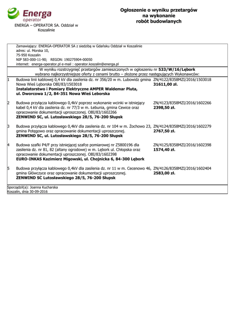 ENERGA – OPERATOR SA. Oddział w Koszalinie Ogłoszenie o wyniku przetargów na wykonanie robót budowlanych Zamawiający: ENERGA-OPERATOR SA z siedzibą w Gdańsku Oddział w Koszalinie adres: ul. Morska 10, 75-950 Koszalin NIP 583-000-11-90; REGON: 190275904-00050 internet: energa-operator.pl e-mail : [email protected] 1 W wyniku rozstrzygnięć przetargów zamieszczonych w ogłoszeniu nr 533/W/16/Lębork wybrano najkorzystniejsze oferty z cenami brutto – złożone przez następujących Wykonawców: Budowa linii kablowej 0,4 kV dla zasilenia dz. nr 356/20 w m. Lubowidz gmina ZN/4122/8358MZI/2016/1503018 Nowa Wieś Lęborska OBI/83/1503018 31611,00 zł. Instalatorstwo i Pomiary Elektryczne AMPER Waldemar Pluta, ul. Dworcowa 1/2, 84-351 Nowa Wieś Leborska 2 Budowa przyłącza kablowego 0,4kV poprzez wykonanie wcinki w istniejący kabel 0,4 kV dla zasilenia dz. nr 77/3 w m. Łebunia, gmina Cewice oraz opracowanie dokumentacji uproszczonej. OBI/83/1602266 ZENWIND SC, ul. Lutosławskiego 28/5, 76-200 Słupsk 3 Budowa przyłącza kablowego 0,4kV dla zasilenia dz. nr 104 w m. Żochowo 23, ZN/4124/8358MZI/2016/1602279 gmina Potęgowo oraz opracowanie dokumentacji uproszczonej. 2767,50 zł. ZENWIND SC, ul. Lutosławskiego 28/5, 76-200 Słupsk 4 Budowa szafki P4/F przy istniejącej szafce pomiarowej nr Z5800196 dla zasilenia dz. nr 81, 82 (altany ogrodowe) w m. Lębork ul. Chłopska oraz opracowanie dokumentacji uproszczonej. OBI/83/1602398 EURO-INKAS Kazimierz Migowski, ul. Chojnicka 6, 84-300 Lębork 5 Budowa przyłącza kablowego 0,4kV dla zasilenia dz. nr 11 w m. Cecenowo 46, ZN/4126/8358MZI/2016/1602404 gmina Główczyce oraz opracowanie dokumentacji uproszczonej. 2583,00 zł. ZENWIND SC Lutosławskiego 28/5, 76-200 Słupsk Sporządził(a): Joanna Kucharska Koszalin, dnia 30-09-2016 ZN/4123/8358MZI/2016/1602266 2398,50 zł. ZN/4125/8358MZI/2016/1602398 1574,40 zł.