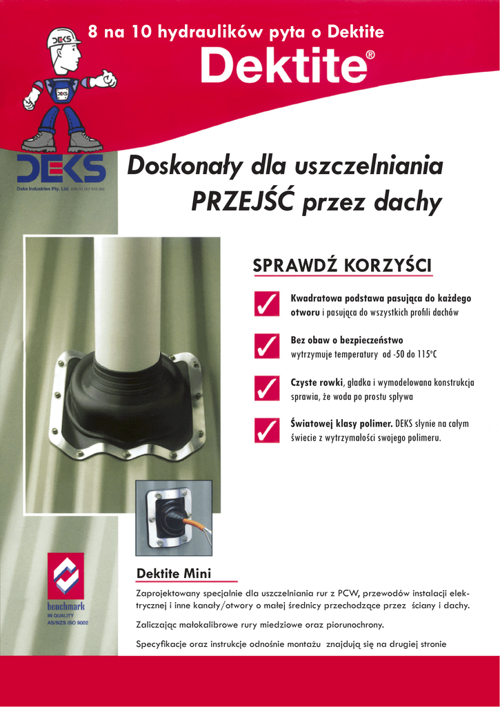 8 na 10 hydraulików pyta o Dektite Doskonały dla uszczelniania PRZEJŚĆ przez dachy SPRAWDŹ KORZYŚCI Kwadratowa podstawa pasująca do każdego otworu i pasująca do wszystkich profili dachów Bez obaw o bezpieczeństwo wytrzymuje temperatury od -50 do 115oC Czyste rowki, gładka i wymodelowana konstrukcja sprawia, że woda po prostu spływa Światowej klasy polimer. DEKS słynie na całym świecie z wytrzymałości swojego polimeru. Dektite Mini Zaprojektowany specjalnie dla uszczelniania rur z PCW, przewodów instalacji elektrycznej i inne kanały/otwory o małej średnicy przechodzące przez ściany i dachy. Zaliczając małokalibrowe rury miedziowe oraz piorunochrony. Specyfikacje oraz instrukcje odnośnie montażu znajdują się na drugiej stronie Instrukcja montażu Wyprofilować manżetę do profilu dachu. Wygładzić wszelkie zagięcia i nierówności. Nie naciągać aksymalnie w celu umożliwienia wibracji. Przymocować manżetę za pomocą WKRĘTÓW WIERCĄCYCH Z PODKŁADKĄ EPDM. Ko lor ch yle n ie wa m Po ds ta Ru r Ko d am m Łatwy dobór Nałożyć substancję uszczelniającą zawijając elastyczny kołnierz. m Nasunąć na rurę manżetę używając przy tym wody jako smaru. Na Ostrymi nożyczkami przyciąć stożek tak aby pasował do rozmiaru rury. czarny szary czerwony (EPDM) Polimer uszczelniający EPDM Dektite został oficjalnie przetestowany przez Coal Corporation of Victoria, Australia na zatwierdzonych przewodach kominowych i stwierdzono iż spełnia on wszystkie normy australijskie oraz brytyjskie. Pod żadnym pozorem nie należy go montować na nie zatwierdzonych lub aktywnych kanałach spalinowych EPDM – wytrzymuje temperatury od -50 do 115oC i CHWILOWO do 150oC Wyniki badań Metoda ASTM Opis testu Wymagania Wyniki testu dla czarnego EPDM Wyniki testu dla szarego EPDM D224D D412 D412 Twardość w stopniach Shore’a ‘A’ Wytrzymałość na rozciąganie(MPa min) Wydłużenie podczas zrywania (% min) 60 +/- 5 7,0 min 350 min 60 10,5 650 60 10,6 650 D624 Wytrzymałość na rozdarcie Matryca C (kN/m min): Wytrzymałość na rozdzieranie metodą „spodni” (kN/m min) 20,0 min 10,0 min 31,5 14,0 32,0 14,5 D573 Żaroodporność 70 godzin w 100oC Zmiana w twardości (punkty): Zmiana w rozciągłości (%) Zmiana w długości (%) +/- 10 +/- 25 +/- 25 +1 +3,5 -14,0 +3 +5,0 -16,0 100 ppm. Brak pęknięć Zdany Zdany Nie kruszy się Zdany Zdany U.L 94 H.B. Zdany Zdany D365 Odkształcenie trwałe po ściskaniu 22 godziny w 70oC (%max) Odporność na ozon Kruchość w niskiej temperaturze 3 min w -50oC UI.84 Ognioodporność Kolory SZARY EPDM* CZARNY EPDM CZERWONY EPDM* * NA INDYWIDUALNE ZAMÓWIENIE