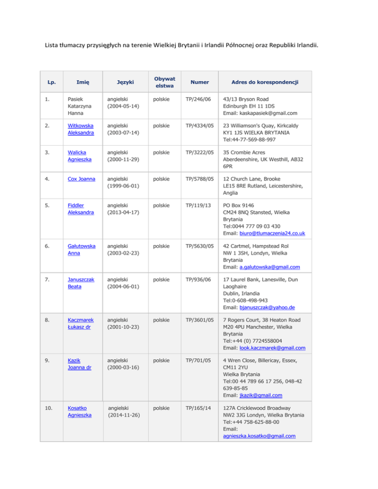Lista tłumaczy przysięgłych na terenie Wielkiej Brytanii i Irlandii Północnej oraz Republiki Irlandii. Lp. Imię Języki Obywat elstwa Numer Adres do korespondencji 1. Pasiek Katarzyna Hanna angielski (2004-05-14) polskie TP/246/06 43/13 Bryson Road Edinburgh EH 11 1DS Email: [email protected] 2. Witkowska Aleksandra angielski (2003-07-14) polskie TP/4334/05 23 Williamson's Quay, Kirkcaldy KY1 1JS WIELKA BRYTANIA Tel:44-77-569-88-997 3. Walicka Agnieszka angielski (2000-11-29) polskie TP/3222/05 35 Crombie Acres Aberdeenshire, UK Westhill, AB32 6PR 4. Cox Joanna angielski (1999-06-01) polskie TP/5788/05 12 Church Lane, Brooke LE15 8RE Rutland, Leicestershire, Anglia 5. Fiddler Aleksandra angielski (2013-04-17) polskie TP/119/13 PO Box 9146 CM24 8NQ Stansted, Wielka Brytania Tel:0044 777 09 03 430 Email: [email protected] 6. Gałutowska Anna angielski (2003-02-23) polskie TP/5630/05 42 Cartmel, Hampstead Rol NW 1 3SH, Londyn, Wielka Brytania Email: [email protected] 7. Januszczak Beata angielski (2004-06-01) polskie TP/936/06 17 Laurel Bank, Lanesville, Dun Laoghaire Dublin, Irlandia Tel:0-608-498-943 Email: [email protected] 8. Kaczmarek Łukasz dr angielski (2001-10-23) polskie TP/3601/05 7 Rogers Court, 38 Heaton Road M20 4PU Manchester, Wielka Brytania Tel:+44 (0) 7724558004 Email: [email protected] 9. Kazik Joanna dr angielski (2000-03-16) polskie TP/701/05 4 Wren Close, Billericay, Essex, CM11 2YU Wielka Brytania Tel:00 44 789 66 17 256, 048-42 639-85-85 Email: [email protected] 10. Kosatko Agnieszka angielski (2014-11-26) polskie TP/165/14 127A Cricklewood Broadway NW2 3JG Londyn, Wielka Brytania Tel:+44 758-625-88-00 Email: [email protected] 11. ŁadnowskaWańkowicz Katarzyna angielski (2002-11-04) polskie TP/1139/06 67 Mayfield Gardens Londyn W7 3RB, Wielka Brytania Tel:dom.:0044-20-8575-9302, kom.:0044-77-9355-4750 Email: [email protected] 12. Małaczyński Adam angielski (1997-02-19) polskie TP/2402/05 151 Lower Brownhill Road SO16 9LD Southampton, Wlk. Brytania Tel:044 758 73 77 813, 609 450 099 Email: [email protected] 13. Mchugh Małgorzata angielski (1999-07-12) polskie TP/1181/06 119 Greenwich South Street, SE 10 8NX Londyn, United Kingdom Email: [email protected] m 14. Paśnikowska Magdalena angielski (1998-01-20) polskie TP/4101/05 4 THE ELMS, ELM TREE AVENUE, CO13 0BD FRINTON ON SEA, WIELKA BRYTANIA Email: [email protected] 15. Rej Magdalena angielski (2008-10-23) polskie TP/83/08 67 Railway Road, Clongriffin 13 Dublin, Irlandia Tel:+353 857631135 Email: [email protected] 16. SzermińskaWołos Monika angielski (1998-11-04) polskie TP/6347/05 54 Stamford Road PR 8 4 ET Southport, UK 17. Sznyter Sylwia angielski (2005-01-24) polskie TP/2742/05 28 Grand Canal View, Kilmainham 8 Dublin, Irlandia 18. Sztuczka Mariusz angielski (2003-10-23) polskie TP/3035/05 93 Dane Road Coventry, CV2 4JT, United Kingdom Tel:0044 (0)7535-202-404 Email: [email protected] 19. Szubert Monika angielski (2013-04-17) polskie TP/96/13 37 Annamoe Park, Cabra 7 Dublin, Irlandia Tel:00353862373017 Email: [email protected] 20. Szulc Marcin angielski (2014-07-15) polskie TP/111/14 78 Benburb Street, Smithfield 7 Dublin, Irlandia Tel:+353 85 75 13 666 Email: [email protected] Www: http://www.heartofeurope.ie 21. Wołos Mariusz angielski (1998-11-04) polskie TP/6047/05 Stamford Road 54 Southport PR&4ET, UK 22. Wrzeszcz Magdalena angielski (2014-07-15) polskie TP/93/14 13 Adlington House, Rollason Way CM14 4AH Brentwood, Essex, Wielka Brytania Tel:+48(0)7972837412 Email: [email protected]