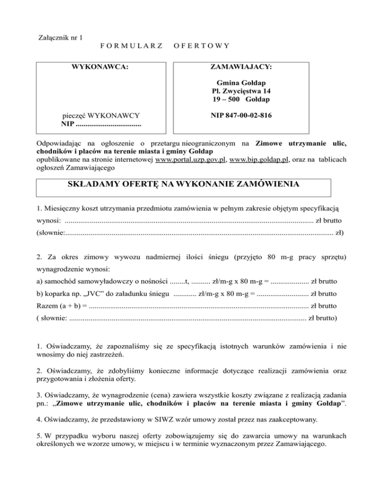Załącznik nr 1 F O R M U LAR Z WYKONAWCA: OFERTOWY ZAMAWIAJACY: Gmina Gołdap Pl. Zwycięstwa 14 19 – 500 Gołdap pieczęć WYKONAWCY NIP .................................. NIP 847-00-02-816 Odpowiadając na ogłoszenie o przetargu nieograniczonym na Zimowe utrzymanie ulic, chodników i placów na terenie miasta i gminy Gołdap opublikowane na stronie internetowej www.portal.uzp.gov.pl, www.bip.goldap.pl, oraz na tablicach ogłoszeń Zamawiającego SKŁADAMY OFERTĘ NA WYKONANIE ZAMÓWIENIA 1. Miesięczny koszt utrzymania przedmiotu zamówienia w pełnym zakresie objętym specyfikacją wynosi: ................................................................................................................................. zł brutto (słownie:........................................................................................................................................... zł) 2. Za okres zimowy wywozu nadmiernej ilości śniegu (przyjęto 80 m-g pracy sprzętu) wynagrodzenie wynosi: a) samochód samowyładowczy o nośności ........t, .......... zł/m-g x 80 m-g = .................... zł brutto b) koparka np. „JVC” do załadunku śniegu ............ zł/m-g x 80 m-g = ........................... zł brutto Razem (a + b) = .................................................................................................................. zł brutto ( słownie: ........................................................................................................................... zł brutto) 1. Oświadczamy, że zapoznaliśmy się ze specyfikacją istotnych warunków zamówienia i nie wnosimy do niej zastrzeżeń. 2. Oświadczamy, że zdobyliśmy konieczne informacje dotyczące realizacji zamówienia oraz przygotowania i złożenia oferty. 3. Oświadczamy, że wynagrodzenie (cena) zawiera wszystkie koszty związane z realizacją zadania pn.: „Zimowe utrzymanie ulic, chodników i placów na terenie miasta i gminy Gołdap”. 4. Oświadczamy, że przedstawiony w SIWZ wzór umowy został przez nas zaakceptowany. 5. W przypadku wyboru naszej oferty zobowiązujemy się do zawarcia umowy na warunkach określonych we wzorze umowy, w miejscu i w terminie wyznaczonym przez Zamawiającego. 6. Oświadczamy, że uważamy się związani niniejszą ofertą przez okres wskazany przez Zamawiającego w specyfikacji istotnych warunków zamówienia tj.: przez 30 dni. 7. Oświadczamy, że prace objęte niniejszym zakresem zamówienia wykonamy we własnym zakresie bez udziału podwykonawców/ z udziałem podwykonawców* (informację o podwykonawcach zawarliśmy w treści oferty na załączniku nr 5) . 8. Oświadczamy, że udzielamy 30 dniowego terminu płatności. 9. Oświadczamy, że zrealizujemy zamówienie w terminie określonym w Rozdziale III pkt SIWZ. 10. Do niniejszej oferty załączamy wszystkie wymagane w SIWZ dokumenty – wymienione w rozdziale III ust. III.3. oraz dodatkowe dokumenty stanowiące integralną część umowy (należy przedłożyć wykaz dokumentów składających się na ofertę i stanowiących jej część integralną). 11. Oferta została złożona na .............. stronach podpisanych i kolejno ponumerowanych od nr ................... do nr ..................... Ofertę podpisali : ................................................................................................. /podpis i pieczęć uprawnionego przedstawiciela Wykonawcy/ ...................................., dnia ............................