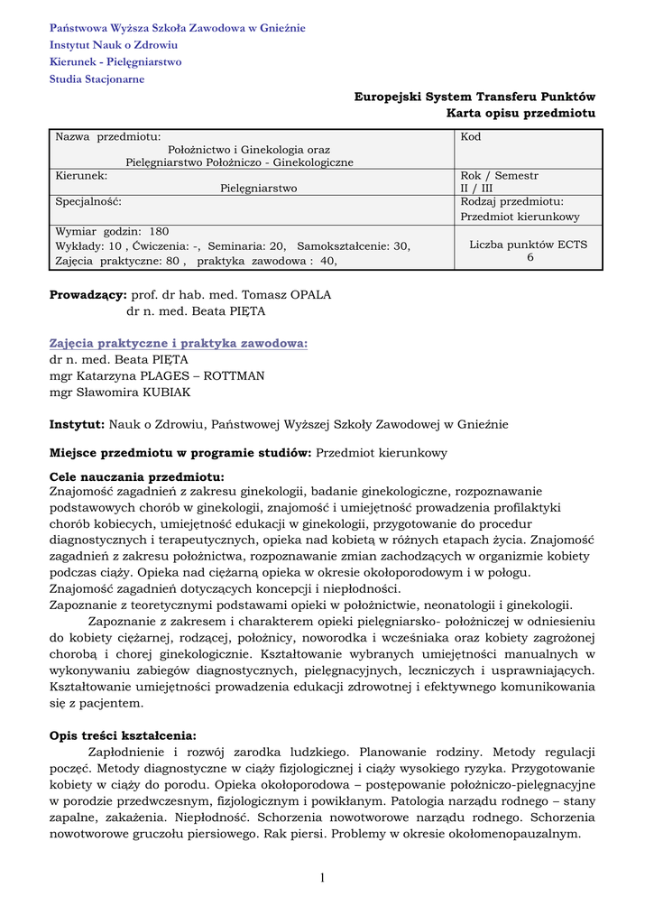 Państwowa Wyższa Szkoła Zawodowa w Gnieźnie Instytut Nauk o Zdrowiu Kierunek - Pielęgniarstwo Studia Stacjonarne Europejski System Transferu Punktów Karta opisu przedmiotu Nazwa przedmiotu: Kod Położnictwo i Ginekologia oraz Pielęgniarstwo Położniczo - Ginekologiczne Kierunek: Rok / Semestr II / III Rodzaj przedmiotu: Przedmiot kierunkowy Pielęgniarstwo Specjalność: Wymiar godzin: 180 Wykłady: 10 , Ćwiczenia: -, Seminaria: 20, Samokształcenie: 30, Zajęcia praktyczne: 80 , praktyka zawodowa : 40, Liczba punktów ECTS 6 Prowadzący: prof. dr hab. med. Tomasz OPALA dr n. med. Beata PIĘTA Zajęcia praktyczne i praktyka zawodowa: dr n. med. Beata PIĘTA mgr Katarzyna PLAGES – ROTTMAN mgr Sławomira KUBIAK Instytut: Nauk o Zdrowiu, Państwowej Wyższej Szkoły Zawodowej w Gnieźnie Miejsce przedmiotu w programie studiów: Przedmiot kierunkowy Cele nauczania przedmiotu: Znajomość zagadnień z zakresu ginekologii, badanie ginekologiczne, rozpoznawanie podstawowych chorób w ginekologii, znajomość i umiejętność prowadzenia profilaktyki chorób kobiecych, umiejętność edukacji w ginekologii, przygotowanie do procedur diagnostycznych i terapeutycznych, opieka nad kobietą w różnych etapach życia. Znajomość zagadnień z zakresu położnictwa, rozpoznawanie zmian zachodzących w organizmie kobiety podczas ciąży. Opieka nad ciężarną opieka w okresie okołoporodowym i w połogu. Znajomość zagadnień dotyczących koncepcji i niepłodności. Zapoznanie z teoretycznymi podstawami opieki w położnictwie, neonatologii i ginekologii. Zapoznanie z zakresem i charakterem opieki pielęgniarsko- położniczej w odniesieniu do kobiety ciężarnej, rodzącej, położnicy, noworodka i wcześniaka oraz kobiety zagrożonej chorobą i chorej ginekologicznie. Kształtowanie wybranych umiejętności manualnych w wykonywaniu zabiegów diagnostycznych, pielęgnacyjnych, leczniczych i usprawniających. Kształtowanie umiejętności prowadzenia edukacji zdrowotnej i efektywnego komunikowania się z pacjentem. Opis treści kształcenia: Zapłodnienie i rozwój zarodka ludzkiego. Planowanie rodziny. Metody regulacji poczęć. Metody diagnostyczne w ciąży fizjologicznej i ciąży wysokiego ryzyka. Przygotowanie kobiety w ciąży do porodu. Opieka okołoporodowa – postępowanie położniczo-pielęgnacyjne w porodzie przedwczesnym, fizjologicznym i powikłanym. Patologia narządu rodnego – stany zapalne, zakażenia. Niepłodność. Schorzenia nowotworowe narządu rodnego. Schorzenia nowotworowe gruczołu piersiowego. Rak piersi. Problemy w okresie okołomenopauzalnym. 1 Państwowa Wyższa Szkoła Zawodowa w Gnieźnie Instytut Nauk o Zdrowiu Kierunek - Pielęgniarstwo Studia Stacjonarne Zapłodnienie i rozwój zarodka ludzkiego. Przygotowanie pacjentek do wybranych położniczo – ginekologicznych badań diagnostycznych Opieka nad kobietą w ciąży fizjologicznej. Opieka pielęgniarska w trakcie porodu. Pielęgnowanie położnicy w przebiegu połogu fizjologicznego i patologicznego. Nieprawidłowy czas trwania ciąży. Pielęgnowanie kobiety w ciąży wysokiego ryzyka (krwawienia występujące w drugiej połowie ciąży, ciąża powikłana Nadciśnieniem Indukowanym Ciążą, ciąża powikłana konfliktem serologicznym). Pielęgnacja noworodka donoszonego i wcześniaka. Udział pielęgniarki w profilaktyce, rozpoznawaniu i leczeniu stanów zapalnych narządu rodnego kobiety. Problemy zdrowotne kobiet w wieku rozrodczym i przekwitania. Przygotowanie i opieka nad pacjentką zakwalifikowaną do drobnych zabiegów i operacji ginekologicznych. Problemy pielęgnacyjne kobiet z chorobą nowotworową narządu rodnego i gruczołu piersiowego Wymagane wiadomości: Student zna teoretyczne zagadnienia z zakresu ginekologii , badania ginekologicznego, rozpoznawania podstawowych chorób w ginekologii, posiada umiejętność prowadzenia profilaktyki chorób kobiecych, umiejętność edukacji w ginekologii , przygotowania pacjenta do procedur diagnostycznych i terapeutycznych ,opieki nad kobietą w różnych etapach życia. Zna podstawowe zagadnienia z zakresu położnictwa, rozpoznawanie zmian zachodzących w organizmie kobiety podczas ciąży. Potrafi sprawować opiekę nad ciężarną, kobietą w okresie okołoporodowym i w połogu. Zna zagadnienia dotyczące koncepcji i niepłodności. Zajęcia praktyczne Student zna teoretyczne podstawy opieki w położnictwie, neonatologii i ginekologii. Zna zakres i charakter opieki pielęgniarsko- położniczej w odniesieniu do kobiety ciężarnej, rodzącej, położnicy, noworodka i wcześniaka oraz kobiety zagrożonej chorobą i chorej ginekologicznie. Potrafi wykonać podstawowe zabiegi diagnostyczne, procedury pielęgnacyjne, lecznicze i usprawniające. Potrafi prowadzić edukację zdrowotną i efektywnie komunikować się z pacjentem. Forma prowadzonych zajęć: WYKŁADY: Okresy życia kobiety. Metody diagnostyczne w ginekologii i położnictwie. Stany naglące w położnictwie i ginekologii. SEMINARIA: Leczenie zachowawcze w ginekologii (zmiany zapalne w pochwie , endometriozy , zaburzenia miesiączkowania Cykl płciowy kobiet Antykoncepcja i niepłodność małżeńska Zaburzenia seksuologiczne i różnicowania płci Ciąża , poród ,połóg fizjologiczny Poród , połóg patologiczny Leczenie operacyjne w ginekologii i położnictwie Chirurgia jednego dnia w ginekologii Ciąża o przebiegu patologicznym(cukrzyca , nadciśnienie, padaczka ,poród przedwczesny, poronienie) 2 Państwowa Wyższa Szkoła Zawodowa w Gnieźnie Instytut Nauk o Zdrowiu Kierunek - Pielęgniarstwo Studia Stacjonarne ZAJĘCIA PRAKTYCZNE: Opieka nad kobietą w ciąży fizjologicznej Opieka pielęgniarska w trakcie porodu Pielęgnowanie położnicy w przebiegu połogu fizjologicznego i patologicznego Nieprawidłowy czas trwania ciąży Pielęgnowanie kobiety w ciąży wysokiego ryzyka (krwawienia występujące w drugiej połowie ciąży, ciąża powikłana Nadciśnieniem Indu