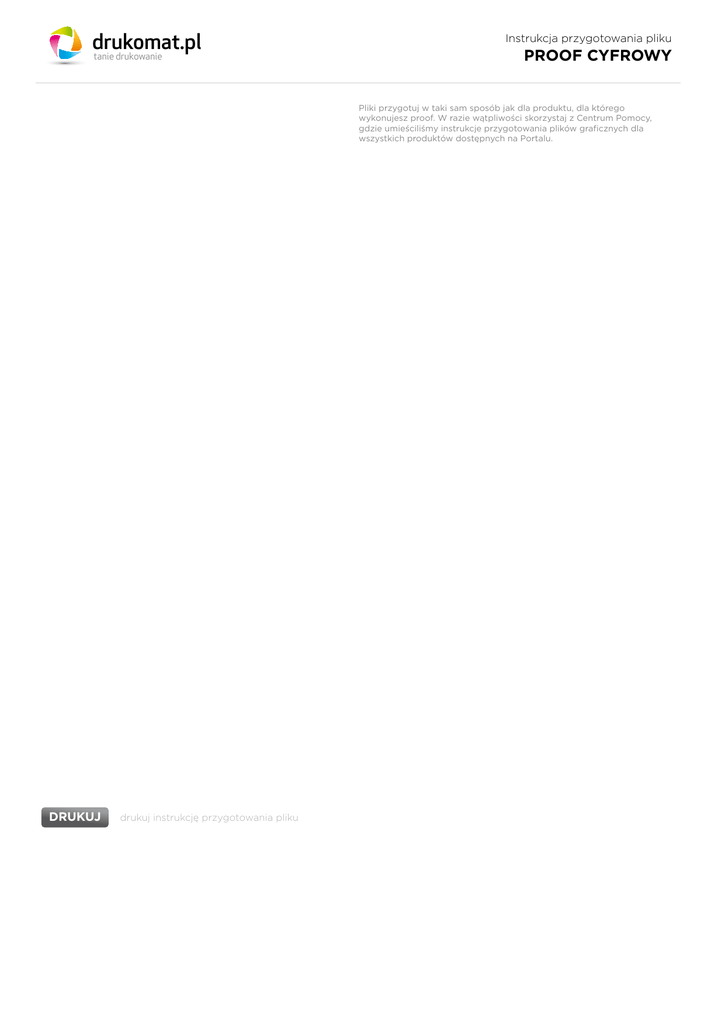 drukomat.pl tanie drukowanie Instrukcja przygotowania pliku PROOF CYFROWY Pliki przygotuj w taki sam sposób jak dla produktu, dla którego wykonujesz proof. W razie wątpliwości skorzystaj z Centrum Pomocy, gdzie umieściliśmy instrukcje przygotowania plików graficznych dla wszystkich produktów dostępnych na Portalu. drukomat.pl tanie drukowanie DRUKUJ drukuj instrukcję przygotowania pliku