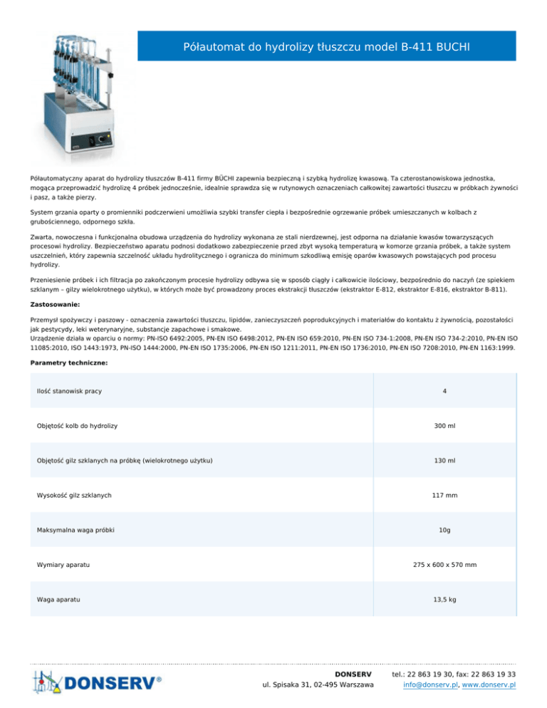 Półautomat do hydrolizy tłuszczu model B-411 BUCHI Półautomatyczny aparat do hydrolizy tłuszczów B-411 firmy BÜCHI zapewnia bezpieczną i szybką hydrolizę kwasową. Ta czterostanowiskowa jednostka, mogąca przeprowadzić hydrolizę 4 próbek jednocześnie, idealnie sprawdza się w rutynowych oznaczeniach całkowitej zawartości tłuszczu w próbkach żywności i pasz, a także pierzy. System grzania oparty o promienniki podczerwieni umożliwia szybki transfer ciepła i bezpośrednie ogrzewanie próbek umieszczanych w kolbach z grubościennego, odpornego szkła. Zwarta, nowoczesna i funkcjonalna obudowa urządzenia do hydrolizy wykonana ze stali nierdzewnej, jest odporna na działanie kwasów towarzyszących procesowi hydrolizy. Bezpieczeństwo aparatu podnosi dodatkowo zabezpieczenie przed zbyt wysoką temperaturą w komorze grzania próbek, a także system uszczelnień, który zapewnia szczelność układu hydrolitycznego i ogranicza do minimum szkodliwą emisję oparów kwasowych powstających pod procesu hydrolizy. Przeniesienie próbek i ich filtracja po zakończonym procesie hydrolizy odbywa się w sposób ciągły i całkowicie ilościowy, bezpośrednio do naczyń (ze spiekiem szklanym – gilzy wielokrotnego użytku), w których może być prowadzony proces ekstrakcji tłuszczów (ekstraktor E-812, ekstraktor E-816, ekstraktor B-811). Zastosowanie: Przemysł spożywczy i paszowy - oznaczenia zawartości tłuszczu, lipidów, zanieczyszczeń poprodukcyjnych i materiałów do kontaktu ż żywnością, pozostałości jak pestycydy, leki weterynaryjne, substancje zapachowe i smakowe. Urządzenie działa w oparciu o normy: PN-ISO 6492:2005, PN-EN ISO 6498:2012, PN-EN ISO 659:2010, PN-EN ISO 734-1:2008, PN-EN ISO 734-2:2010, PN-EN ISO 11085:2010, ISO 1443:1973, PN-ISO 1444:2000, PN-EN ISO 1735:2006, PN-EN ISO 1211:2011, PN-EN ISO 1736:2010, PN-EN ISO 7208:2010, PN-EN 1163:1999. Parametry techniczne: Ilość stanowisk pracy 4 Objętość kolb do hydrolizy 300 ml Objętość gilz szklanych na próbkę (wielokrotnego użytku) 130 ml Wysokość gilz szklanych 117 mm Maksymalna waga próbki 10g Wymiary aparatu 275 x 600 x 570 mm Waga aparatu 13,5 kg DONSERV ul. Spisaka 31, 02-495 Warszawa tel.: 22 863 19 30, fax: 22 863 19 33 [email protected], www.donserv.pl Zasilanie elektryczne 230 V ±10% Częstotliwość 50/60 Hz Pobór mocy (bez grzania/z grzaniem) 1100 W Rekomendowany piasek kwarcowy 0,3 ÷ 0,9 mm (warstwa filtracyjna) Rekomendowana ziemia okrzemkowa Celite 535 (warstwa odkładowa) Rekomendowane stężenie kwasu chlorowodorowego 4 mol/L Producent: BÜCHI Labortechnik AG Link do pliku źródłowego DONSERV ul. Spisaka 31, 02-495 Warszawa tel.: 22 863 19 30, fax: 22 863 19 33 [email protected], www.donserv.pl