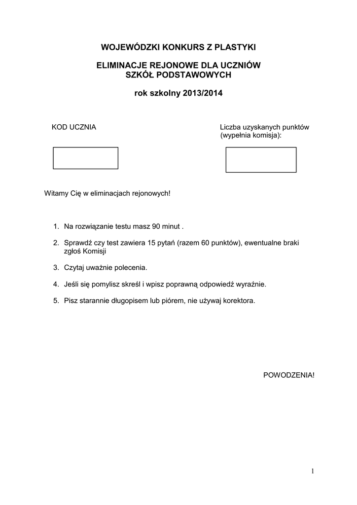 WOJEWÓDZKI KONKURS Z PLASTYKI ELIMINACJE REJONOWE DLA UCZNIÓW SZKÓŁ PODSTAWOWYCH rok szkolny 2013/2014 KOD UCZNIA Liczba uzyskanych punktów (wypełnia komisja): Witamy Cię w eliminacjach rejonowych! 1. Na rozwiązanie testu masz 90 minut . 2. Sprawdź czy test zawiera 15 pytań (razem 60 punktów), ewentualne braki zgłoś Komisji 3. Czytaj uważnie polecenia. 4. Jeśli się pomylisz skreśl i wpisz poprawną odpowiedź wyraźnie. 5. Pisz starannie długopisem lub piórem, nie używaj korektora. POWODZENIA! 1 Zadanie 1. Podkreśl właściwą definicję. Linoryt to: podkreśl właściwą odpowiedź a) technika graficzna należąca do druku wypukłego. b) technika graficzna druku wklęsłego. c) technika graficzna zaliczana do druku płaskiego. Punktacja: Za prawidłową odpowiedź 1 punkt. Zadanie 2. Co to jest tympanon? podkreśl właściwą odpowiedź a) miasto w starożytnym Rzymie b) grecki rzeźbiarz antyczny c) element architektury wypełniony dekoracją rzeźbiarską d) przedstawienie głębi w obrazie Punktacja: Za prawidłową odpowiedź 1 punkt. Zadanie 3. Co to jest prezbiterium? podkreśl właściwą odpowiedź a) część świątyni, w której znajduje się ołtarz główny b) nawa poprzeczna przecinająca nawę główną c) kościół o trzech nawach d) bardzo ozdobne rzeźbiarskie obramowanie wejścia Punktacja: Za prawidłową odpowiedź 1 punkt. Zadanie 4. Co to jest maswerk? podkreśl właściwą odpowiedź a) temat rzeźby b) malowidło ścienne c) dekoracyjny wzór architektoniczny odkuty z kamienia d) zakończenie rynny dachowej Punktacja: Za prawidłową odpowiedź 1 punkt. 2 Zadanie 5. Co to jest kapitel? podkreśl właściwą odpowiedź a) trzon kolumny b) głowica kolumny c) fryz kolumny d) baza kolumny Punktacja: Za prawidłową odpowiedź 1 punkt. Zadanie 6. Jakim dziełem jest akwaforta? podkreśl właściwą odpowiedź a) malarskim b) rzeźbiarskim c) graficznym d) architektonicznym Punktacja: Za prawidłową odpowiedź 1 punkt. Zadanie 7. Jaka para barw dopełnia się do szarości? podkreśl właściwą odpowiedź a) czerwona i zielona b) żółta i niebieska c) żółta i czerwona d) niebieska i czerwona Punktacja: Za prawidłową odpowiedź 1 punkt. Zadanie 8. Jak się nazywa sposób malowania gęstą farbą za pomocą pędzla lub szpachelki, w celu uzyskania grubej faktury w obrazie? podkreśl właściwą odpowiedź a) impast b) laserunek c) modelunek d) iluzjonizm Punktacja: Za prawidłową odpowiedź 1 punkt. 3 Zadanie 9. Sposób oddawania głębi obrazu, polegający na tym, że elementy dalsze są częściowo zasłonięte przez elementy bliższe. podkreśl właściwą odpowiedź a) perspektywa zbieżna b) perspektywa kulisowa c) perspektywa barwna d) perspektywa powietrzna Punktacja: Za prawidłową odpowiedź 1 punkt. Zadanie 10. Obraz, rysunek lub rycina, przedstawiające ogólny widok miasta lub jego fragment, to: podkreśl właściwą odpowiedź a) marina b) scena rodzajowa c) weduta d) martwa natura Punktacja: Za prawidłową odpowiedź 1 punkt. Zadanie 11. Pod przykładami wpisz właściwe nazwy stylów malarstwa wazowego starożytnej Grecji. Styl……………………………......... Styl…………………………………….. Punktacja: Za każdą prawidłową odpowiedź 1 punkt. Razem 2 punkty 4 Zadanie 12. Uzupełnij - w miejscu kropek wpisz to, czego brakuje. (tytuł rzeźby, nazwisko autora, styl) Autor………………………………………………… Tytuł…………………………………………………. Styl/epoka Autor STAROŻYTNA GRECJA MICHAŁ ANIOŁ Tytuł………………………………………………… Styl/epoka………………………………………….. Autor………………………………………………… Tytuł APOLLO I DAFNE Styl/epoka…………………………………………… 5 Autor BERTEL THORVALDSEN POMNIK………………………………………… Styl/epoka…………………………………………… Punktacja: Za każdy prawidłowy wpis 1 punkt. Razem 8 punktów Zadanie 13. Przy podanych nazwach miast wpisz przykład jednego zabytku, z którego to miasto słynie oraz dopisz styl (nazwę epoki) do którego należy. (przypomnij sobie zakres wiadomości podany przed konkursem) Nazwa miasta Nazwa zabytku Nazwa stylu (epoki) KRAKÓW RZYM BARCELONA PARYŻ STRZELNO ATENY Punktacja: za każdy prawidłowy wpis - 1 punkt. Razem 12 punktów. 6 Zadanie 14. Proszę uzupełnić luki wyrazami umieszczonymi poniżej. Nie wszystkie wyrazy pasują do tekstu. Obraz francuskiego malarza …………………..………….z 1784 roku. Jest to obraz o bardzo dokładnie przemyślanej kompozycji. Znajdujące się w tle ………………………………sprawiają, że jest podzielony na wyraźne pionowe części. W każdej z nich umieszczone są postacie. W części lewej znajduje się……………………….…….., uzbrojonych mężczyzn. Grupę ……..………………….obrazu obejmowanych przez jedną z stanowią nich. trzy Są kobiety one i dwoje wyraźnie dzieci, pogrążone w ………………………………. Wszystkie postacie ubrane są w stroje rodem ze………………………………. Już samo odwołanie do ………………………………..wskazuje na klasycystyczny charakter jego twórczości. Podstawą dzieła jest bardzo dokładny………………….…. Obraz namalowany został gładko, nigdzie nie widać duktu pędzla. WYBIERZ! ALE NIE WSZYSTKIE PASUJĄ w radości smutku i rozpaczy. rysunek. ze starożytnego Rzymu. ze współczesności kolor w prawej części Jacques'a-Louis Davida w centrum trzy łuki arkadowe tematyki antycznej trzech młodych Punktacja: Za każdą prawidłową odpowiedź 1 punkt. Razem 8 punktów. 7 Zadanie 15. Dopasuj drugi człon słynnego dzieła sztuki oraz wybierz (spośród podanych) jego autora, dopisz styl/ epokę dopisz cd. tytułu autor styl Madonna…………………………….. Powołanie 
