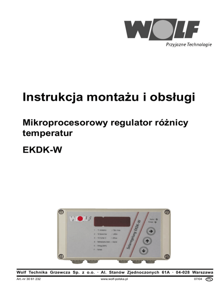 Instrukcja montażu i obsługi Mikroprocesorowy regulator różnicy temperatur EKDK-W Wolf Technika Grzewcza Sp. z o.o. · Al. Stanów Zjednoczonych 61A · 04-028 Warszawa Art.-nr 30 61 232 www.wolf-polska.pl 07/04 PL Spis treści 1 Zastosowanie/Opis ........................................................... 3 2 Wskazówki bezpieczeństwa ......................................... 3-4 3 Funkcje regulacyjne ......................................................... 4 3.1 Funkcje regulacyjne EKDK-W ...................................... 4 3.2 Pomiar ciepła EKDK-W ............................................... 5 4 Montaż ............................................................................... 5 5 Przyłącze elektryczne....................................................... 6 5.1 Przyłączenie sieci i pompy ........................................... 7 5.2 Przyłączenie czujników................................................. 7 5.3 Przyłączenie czujnika impulsów ................................... 7 5.4 Schemat instalacji z EKDK-W ...................................... 8 6 Uruchomienie.................................................................... 9 7 Obsługa /Wskazania ......................................................... 9 7.1 Wskazania z wyświetlacza LCD ................................... 9 7.2 Elementy obsługowe .................................................... 9 8 Parametry wskazań/programowe.................................. 10 8.1 Parametry wskazań .................................................... 10 8.2 Parametry programowe ............................................. 10 8.3 Przykład obsługi regulatora .........................................11 9 Usuwanie usterek ............................................................11 9.1 Kontrola funkcji ........................................................... 12 10 Dane techniczne EKDK-W ............................................. 13 11 Deklaracja zgodności ..................................................... 14 12 Tabela czujników PT1000 ............................................... 14 13 Tabele numeracji przewodów ........................................ 15 1 Zastosowanie/ Opis Mikroprocesorowy regulator różnicy temperatur EKDK-W jest przeznaczony do sterowania układami solarnymi z jednym polem kolektorów i jednym odbiorca ciepła. Realizuje podgrzew ciepłej wody użytkowej i podgrzewu basenu. · · Jest regulatorem natynkowym ze stopniem ochrony IP40. Do montażu w pomieszczeniu · Możliwe jest zwiększenie stopnia ochrony do IP65 poprzez zamianę wprowadzeń przewodów do obudowy. · · · Opis i cechy szczególne regulatora: · · · · łatwa i przejrzysta obsługa możliwość pomiaru ciepła (w połączeniu z art. nr 2444039) cyfrowe wskazanie temperatury na powrocie, kolektora i zasobnika. Punkt pomiarowy temperatury powrotu służy jednocześnie pomiarowi ciepła. · · niewielka liczba przycisków funkcyjnych regulacja różnicą temperatury z oddzielnymi nastawami różnicy załączenia i wyłączenia nastawa wartości temperatur - co 1 stopień niezależne od czasu braku zasilania zapamiętywanie nastaw wskaźnik funkcji dla statusu pracy pompy i regulatora zintegrowany licznik godzin pracy kontrola czujników oraz wskazania usterek automatyczny powrót z ręcznego trybu pracy ( po 8 godz. ) wszystkie zaciski wtykowe - ułatwienie okablowania 2 Wskazówki bezpieczeństwa „Wskazówka bezpieczeństwa“ określa wskazówki do których należy się bezwzględnie stosować aby uniknąć wypadkom lub uszkodzenia urządzenia. Niebezpieczeństwo porażenia prądem na elementach elektrycznych! Uwaga: Przed zdjęciem obudowy odłączyć napięcie. Nie dotykać urządzeń elektrycznych przy włączonym przełączniku głównym. Istnieje niebezpieczeństwo porażenia prądem elektrycznym i utraty zdrowia lub śmierci. Na zaciskach zasilania z sieci elektrycznej jest napięcie również przy wyłączonym przełączniku głównym. Uwaga „Wskazówka“ określa wskazówki techniczne, do których należy się stosować aby uniknąć usterek lub uszkodzenia urządzenia. WSZYSTKIE PRACE ELEKTRYCZNE WYKONYWAĆ PRZY ODŁĄCZONYM NAPIĘCIU! Nie zamienić nigdy przyłączy elektrycznych niskonapięciowych (czujniki). Ze względów bezpieczeństwa uruchamiać tryb ręczny tylko dla opcji testowania. W trybie ręcznym nie są aktywne maksymalne ograniczenia temperatury jak i funkcje czujników. Po upłynięciu 8 godz. i niewykonywania w tym czasie żadnych poleceń tryb ręczny powraca do trybu wskazań. Instalacje solarne podgrzewają się do bardzo wysokiej temperatury! Uwaga przy montażu czujnika kolektora! Istnieje niebezpieczeństwo poparzenia! Zamontować regulator w miejscu, które nie spowoduje zbyt wysokich temperatur pracy jego sterownika. 3 Funkcje regulatora Regulator mierzy temperaturę na czujniku kolektora (T1) i na dolnym czujniku zasobnika w pobliżu solarnej wężownicy grzejnej (T2). Pompa solarna zostaje załączona kiedy temperatura kolektora przewyższa temperaturę zasobnika o wartość różnicy (∆Tzał.) . (np. T1 = 37°C, T2 = 30°C, ∆Tzał. = 7 K). Woda w zasobniku jest podgrzewana do nastawionej maksymalnie wartości (TSp.maks.). Gdy temperatura kolektora przekracza sumę temperatury zasobnika i różnicy wyłączenia (∆Twył.), pompa solarna wyłącza się. (np. T1 = 33°C, T2 = 30°C, ∆Twył. = 3 K). Trzeci pomiar temperatury T3 jest wykorzystywany do pomiaru ilości ciepła na powrocie instalacji. 3.1 Funkcje regulatora EKDK-W Tryb pracyWyjściePompa Gotowość: Warunek LED Napięcie przyłożone ZAŁ. Start ładowania zasobnika Tk => Tsp + ∆Tzał. ZAŁ. ZAŁ. ZAŁ. Koniec ładowania zasobnika Tk =< Tsp + ∆Twył. ZAŁ. WYŁ. WYŁ. Ograniczenie temperatury Tsp > Tsp maks. ZAŁ. WYŁ. WYŁ. Tk ∆TEin =< K = = = = Temperatura kolektora [°C] Różnica włączenia [K] Mniejsze lub równe 1 Kelvin odpowiada 1°C Tsp = ∆TAus = => = LED Status Pompa