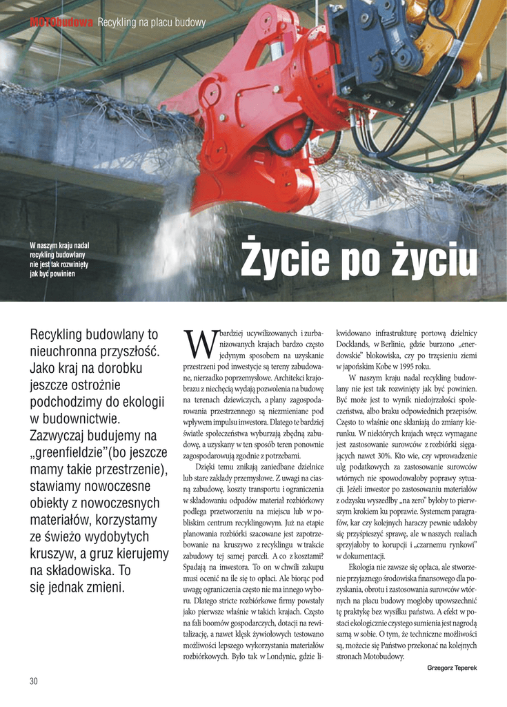 MOTObudowa Recykling na placu budowy Życie po życiu W naszym kraju nadal recykling budowlany nie jest tak rozwinięty jak być powinien Recykling budowlany to nieuchronna przyszłość. Jako kraj na dorobku jeszcze ostrożnie podchodzimy do ekologii w budownictwie. Zazwyczaj budujemy na „greenfieldzie”(bo jeszcze mamy takie przestrzenie), stawiamy nowoczesne obiekty z nowoczesnych materiałów, korzystamy ze świeżo wydobytych kruszyw, a gruz kierujemy na składowiska. To się jednak zmieni. W bardziej ucywilizowanych i zurbanizowanych krajach bardzo często jedynym sposobem na uzyskanie przestrzeni pod inwestycje są tereny zabudowane, nierzadko poprzemysłowe. Architekci krajobrazu z niechęcią wydają pozwolenia na budowę na terenach dziewiczych, a plany zagospodarowania przestrzennego są niezmieniane pod wpływem impulsu inwestora. Dlatego te bardziej światłe społeczeństwa wyburzają zbędną zabudowę, a uzyskany w ten sposób teren ponownie zagospodarowują zgodnie z potrzebami. Dzięki temu znikają zaniedbane dzielnice lub stare zakłady przemysłowe. Z uwagi na ciasną zabudowę, koszty transportu i ograniczenia w składowaniu odpadów materiał rozbiórkowy podlega przetworzeniu na miejscu lub w pobliskim centrum recyklingowym. Już na etapie planowania rozbiórki szacowane jest zapotrzebowanie na kruszywo z recyklingu w trakcie zabudowy tej samej parceli. A co z kosztami? Spadają na inwestora. To on w chwili zakupu musi ocenić na ile się to opłaci. Ale biorąc pod uwagę ograniczenia często nie ma innego wyboru. Dlatego stricte rozbiórkowe firmy powstały jako pierwsze właśnie w takich krajach. Często na fali boomów gospodarczych, dotacji na rewitalizację, a nawet klęsk żywiołowych testowano możliwości lepszego wykorzystania materiałów rozbiórkowych. Było tak w Londynie, gdzie li- kwidowano infrastrukturę portową dzielnicy Docklands, w Berlinie, gdzie burzono „enerdowskie” blokowiska, czy po trzęsieniu ziemi w japońskim Kobe w 1995 roku. W naszym kraju nadal recykling budowlany nie jest tak rozwinięty jak być powinien. Być może jest to wynik niedojrzałości społeczeństwa, albo braku odpowiednich przepisów. Często to właśnie one skłaniają do zmiany kierunku. W niektórych krajach wręcz wymagane jest zastosowanie surowców z rozbiórki sięgających nawet 30%. Kto wie, czy wprowadzenie ulg podatkowych za zastosowanie surowców wtórnych nie spowodowałoby poprawy sytuacji. Jeżeli inwestor po zastosowaniu materiałów z odzysku wyszedłby „na zero” byłoby to pierwszym krokiem ku poprawie. Systemem paragrafów, kar czy kolejnych haraczy pewnie udałoby się przyśpieszyć sprawę, ale w naszych realiach sprzyjałoby to korupcji i „czarnemu rynkowi” w dokumentacji. Ekologia nie zawsze się opłaca, ale stworzenie przyjaznego środowiska finansowego dla pozyskania, obrotu i zastosowania surowców wtórnych na placu budowy mogłoby upowszechnić tę praktykę bez wysiłku państwa. A efekt w postaci ekologicznie czystego sumienia jest nagrodą samą w sobie. O tym, że techniczne możliwości są, możecie się Państwo przekonać na kolejnych stronach Motobudowy. Grzegorz Teperek 30