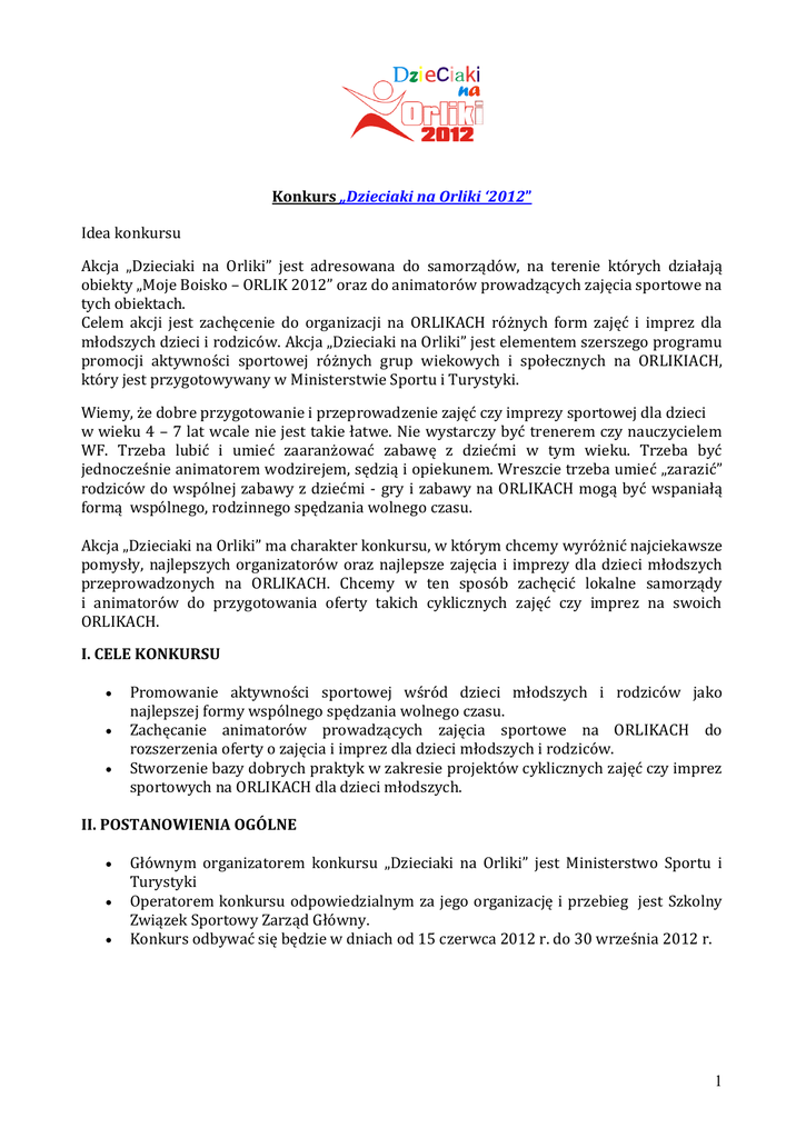 Dzieciaki na na Konkurs „Dzieciaki na Orliki ‘2012” Idea konkursu Akcja „Dzieciaki na Orliki” jest adresowana do samorządów, na terenie których działają obiekty „Moje Boisko – ORLIK 2012” oraz do animatorów prowadzących zajęcia sportowe na tych obiektach. Celem akcji jest zachęcenie do organizacji na ORLIKACH różnych form zajęć i imprez dla młodszych dzieci i rodziców. Akcja „Dzieciaki na Orliki” jest elementem szerszego programu promocji aktywności sportowej różnych grup wiekowych i społecznych na ORLIKIACH, który jest przygotowywany w Ministerstwie Sportu i Turystyki. Wiemy, że dobre przygotowanie i przeprowadzenie zajęć czy imprezy sportowej dla dzieci w wieku 4 – 7 lat wcale nie jest takie łatwe. Nie wystarczy być trenerem czy nauczycielem WF. Trzeba lubić i umieć zaaranżować zabawę z dziećmi w tym wieku. Trzeba być jednocześnie animatorem wodzirejem, sędzią i opiekunem. Wreszcie trzeba umieć „zarazić” rodziców do wspólnej zabawy z dziećmi - gry i zabawy na ORLIKACH mogą być wspaniałą formą wspólnego, rodzinnego spędzania wolnego czasu. Akcja „Dzieciaki na Orliki” ma charakter konkursu, w którym chcemy wyróżnić najciekawsze pomysły, najlepszych organizatorów oraz najlepsze zajęcia i imprezy dla dzieci młodszych przeprowadzonych na ORLIKACH. Chcemy w ten sposób zachęcić lokalne samorządy i animatorów do przygotowania oferty takich cyklicznych zajęć czy imprez na swoich ORLIKACH. I. CELE KONKURSU Promowanie aktywności sportowej wśród dzieci młodszych i rodziców jako najlepszej formy wspólnego spędzania wolnego czasu. Zachęcanie animatorów prowadzących zajęcia sportowe na ORLIKACH do rozszerzenia oferty o zajęcia i imprez dla dzieci młodszych i rodziców. Stworzenie bazy dobrych praktyk w zakresie projektów cyklicznych zajęć czy imprez sportowych na ORLIKACH dla dzieci młodszych. II. POSTANOWIENIA OGÓLNE Głównym organizatorem konkursu „Dzieciaki na Orliki” jest Ministerstwo Sportu i Turystyki Operatorem konkursu odpowiedzialnym za jego organizację i przebieg jest Szkolny Związek Sportowy Zarząd Główny. Konkurs odbywać się będzie w dniach od 15 czerwca 2012 r. do 30 września 2012 r. 1 III. ZASADY UDZIAŁU W KONKURSIE W konkursie mogą wziąć udział animatorzy prowadzący zajęcia na ORLIKACH w ramach programu „Animator – Moje boisko Orlik 2012” jak również inne osoby zgłoszone przez podmiot zarządzający ORLIKIEM. Zasady konkursu są proste. Zajęcia lub imprezy dla dzieci młodszych (4 – 7 lat) muszą być realizowane cyklicznie, przynajmniej dwa razy w miesiącu, w okresie od 15 czerwca 2012 do 30 września 2012 r.. To mogą być gry i zabawy realizowane wg dowolnych pomysłów, zawody rodzinne itp. Liczymy na pomysłowość organizatorów. Koszty organizacji zajęć czy imprez ponosi lokalny samorząd. Aby wziąć udział w konkursie „Dzieciaki na Orliki” wystarczy: a) zgłosić swojego ORLIKA i planowane zajęcia lub imprezy do 15 lipca 2012 do godziny 15,00 mailem na adres [email protected]. Regulamin Konkursu oraz formularz zgłoszeniowy znajduje się na stronie internetowej ZG SZS www.szs.pl oraz na stronach internetowych WSZS. Wykaz zgłoszonych ORLIKÓW, wraz z krótką informacją o planowanych imprezach zostanie zamieszczony na stronie internetowej www.szs.pl (wykaz będzie uzupełniany w miarę napływania zgłoszeń); b) w okresie 15 czerwca – 30 września 2012 przeprowadzić zaplanowane zajęcia/imprezy na ORLIKU – imprezy muszą być zrealizowane cyklicznie, minimum dwa razy w miesiącu, w terminach określonych w zgłoszeniu przesłanym do SZS (łącznie należy przeprowadzić minimum 6 imprez); c) do 10 października 2012 przesłać do ZG SZS sprawozdanie końcowe z przeprowadzonych zajęć/imprez – wzór sprawozdania jest dostępny na stronie www.szs.pl. Do sprawozdania należy dołączyć szersze opisy imprez, zdjęcia, relacje prasowe, itp. Sprawozdania należy przesłać mailem na adres [email protected] (wówczas zdjęcia załączone do sprawozdania muszą mieć następujące parametry – do 100 kB – jedno zdjęcie). Zgłoszenie do udziału w konkursie jest równoznaczne z wyrażeniem zgody przez Uczestnika na opublikowanie sprawozdania z jego programu (lub informacji opracowanej przez organizatorów konkursu) na stronach internetowych MSiT i ZG SZS. Organizator może w celach promocji akcji „ Dzieciaki na Orliki” w trakcie trwania konkursu zamieścić na swojej stronie internetowej informację i zdjęcia z dowolnie wybranego programu. Zamieszczenie informacji i zdjęć nie jest równoznaczne z przyznaniem nagrody. IV. PRZEBIEG KONKURSU Komisja konkursowa składać się będzie z 4 osób – po dwóch przedstawicieli Ministerstwa Sportu i Turystyki i ZG SZS. Komisja konkursowa na podstawie wszystkich przesłanych sprawozdań wyłoni 25 najlepszych programów zajęć dla dzieci młodszych przeprowadzonych na ORLIKACH. Komisja konkursowa wyłoni najlepsze programy zajęć i imprez kierując się następującymi kryteriami: o wykorzystanie w programie zajęć/imprez mniej znanych, nietypowych lub nowatorskich form aktywności sportowej odpowiednich dla dzieci młodszych; 2 włączenie do wspólnej zabawy rodziców/opiekunów; liczba uczestników zajęć/imprez; włączenie różnych podmiotów do współpracy przy realizacji zajęć/imprezy; cykliczność. Ostateczne rozstrzygnięcie konkursu nastąpi dnia 30 października 2012 r. Autorzy 25 najlepszych programów zostaną poinformowani o wynikach drogą e-mailową i telefonicznie. Autorzy 25 wyróżnionych projektów zostaną zaproszeni do udziału w seminarium podsumowującym akcję, podczas którego zostaną przedstawione niektóre z wybranych programów. o o o o V. NAGRODY Komisja konkursowa przyzna laureatom 25 najlepszych projektów nagrody rzeczowe – aparaty fotograficzne oraz torby sportowe. Wyniki konkursu zostaną ogłoszone na stronie internetowej konku