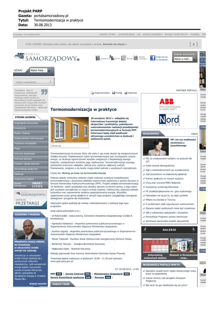 Projekt PARP Gazeta: portalsamorzadowy.pl Tytu³: Termomodernizacja w praktyce Data: 30.08.2013 GRUPA PTWP: Czwartek, 12 września 2013 GOSPODARKA HR N I E R U C H O M OŚ C I R Y N E K S P OŻ Y W C Z Y HANDEL ZDROWIE [x] PLIKI COOKIES: Stosujemy pliki cookies, aby ułatwić korzystanie z serwisu. Dowiedz się więcej > d ołącz do nas na facebooku Oce Adres e-mail... Wodzis SZUKAJ Wpisz frazę ... Wybierz województwo Chciałabym, żeby to związkowcy wytłumaczyli warszawiakom, dlaczego realizując własne prawo do demonstracji swoich poglądów nie bierzecie pod uwagę skali utrudnień poruszaniu się po mieście przez mieszkańców Warszawy - apelowała Hanna Gronkiewicz-Waltz. PARTNER PORTALU: Dodaj komentarz Prześlij Wydrukuj Inwestycje miejskie Sytuacja społeczno gospodarcza i rynek pracy Termomodernizacja w praktyce Zarządzanie urzędem i usługami dla mieszka 20 września 2013 r. odbędzie się internetowa transmisja debaty ekspertów i praktyków, poświęcona uwarunkowaniom realizacji przedsięwzięć termomodernizacyjnych w formule PPP. Internauci będą mieli możliwość aktywnego uczestnictwa w dyskusji i zadawania pytań. Gospodarka komunalna Inwestycje Prawo i finanse Społeczeństwo informacyjne Mieczys Mys WIADOMOŚCI więcej MF: nie ma możliwości zwolnienia z janosikowego Fundusze europejskie fot.sxc.hu Praca Edward Lasok PSL za zwiększeniem budżetu na pożyczki dla JST Komunikacja społeczna Termomodernizacja to proces, który dla wielu z nas może okazać się nieograniczonym źródłem korzyści. Podstawowym celem termomodernizacji jest zmniejszenie zużycia energii, co skutkuje ograniczeniem kosztów związanych z eksploatacją danego budynku i polepszeniem komfortu jego użytkowania. Termomodernizacja wymaga poniesienia znacznych nakładów, jednak przy wyborze właściwej metody finansowania, związane z nią koszty mogą zostać pokryte z uzyskanych oszczędności. Edukacja Czytaj też: Wyścig po kasę na termomodernizację Jest pozwolenie na białostocką spalarnię Podczas debaty omówiony zostanie model realizacji inwestycji kompleksowej termomodernizacji i utrzymania obiektów użyteczności publicznej w gminie Karczew w formule Partnerstwa Publiczno-Prywatnego (PPP). Projekt zakłada termomodernizację 10 obiektów: szkół i przedszkoli oraz ośrodka zdrowia na terenie gminy, a jego celem jest uzyskanie oszczędności w zużyciu energii cieplnej i elektrycznej, poprawa estetyki budynków oraz usprawnienie systemu gospodarowania energią. Wszystkie zaplanowane przez gminę działania w ramach tego projektu uwzględniają rozwiązania ekologiczne i przyjazne dla środowiska. Pomoc społeczna w nowym wydaniu Zaproszeni goście podzielą się wiedzą i doświadczeniami z realizacji tego typu projektów. O problemach osób zagrożonych wykluczeniem Ochrona środowiska Ochrona zdrowia Polityka i Społeczeństwo Wydarzenia lokalne Swój udział potwierdzili m.in.: ROZMOWA TYGODNIA Polski dramat demograficzny Sąd o odszkodowaniach po wywłaszczeniu Chcą znać wycenę MPEC Białystok Inwestorzy wybierają Warszawę Fotoradary nie są po to, by łupić portfele Miliony na oświatę w Toruniu Zlecanie zadań publicznych może być modelowe Konsultacje Programu pomoc techniczna - Agnieszka Kalisiewicz - ekspertka partnerstwa publiczno-prywatnego w Departamencie Instrumentów Wsparcia Ministerstwa Gospodarki, Inwestycje w odnawialne źródła energii spotkają się z pozytywnym odbiorem mieszkańców, jeśli oszczędność energii będzie rzeczywista uważa Krzysztof Wilczyński, główny specjalista ds. zarządzania energią w Urzędzie Miasta Ełku. więcej rozmów • Wojciech Bernatow Inwestycje miejskie Sytuacja społeczno gospodarcza i rynek pracy GALERIE - Ewelina Łagoda - ekspertka partnerstwa publiczno-prywatnego w Departamencie Instrumentów Wsparcia Ministerstwa Gospodarki, - Marek Tobiacelli - Dyrektor działu efektywności energetycznej Siemens Polska, Zarządzanie urzędem i usługami dla mieszka Starachowice Warszawa wprowadza budżet obywatelski Mieszkańcy muszą widzieć, że inwestycje w odnawialne źródła energii się opłacają Sytuacja społeczno gospodarcza i rynek pracy PE przełożył głosowanie ws. gazu łupkowego NIK o szkoleniach policjantów i strażaków - dr Rafał Cieślak - radca prawny, Kancelaria Doradztwa Gospodarczego Cieślak & Kordasiewicz, Inwestycje miejskie • - Bartłomiej Tkaczyk - Zastępca Burmistrza Karczewa, - Małgorzata Pajek - Skarbnik Karczewa. Zarządzanie urzędem i usługami dla mieszka Sopot Debatę poprowadzi Ewa Ivanova, dziennikarka Dziennika Gazety Prawnej. Transmisja będzie nadawana w godzinach 10.00 - 11.30 pod adresem www.ppp.parp.gov.pl Antyranking stołecznych dzielnic Muzeum w Konstancinie - wizje... WIADOMOŚCI PORTALU WNP.PL AT 30-08-2013, 14:00 PPP RSS | Serwis Internet RSS | Ministerstwo Gospodarki RSS | Serwis Konsultacje społeczne RSS | Karczew RSS | ZOBACZ TAKŻE Specjalny zespół oceni wpływ elastycznego czasu pracy na gospodarkę Czarne chmury nad zarządem Kompanii Węglowej Bez taryf na gaz obylibyśmy się już jutro? Jacek Karnowski Inwestycje miejskie