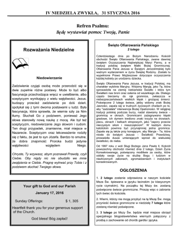 IV NIEDZIELA ZWYKŁA, 31 STYCZNIA 2016 Refren Psalmu: Będę wysławiał pomoc Twoją, Panie Święto Ofiarowania Pańskiego Rozważania Niedzielne 2 lutego Niedowierzanie Czterdziestego dnia po Bożym Narodzeniu Kościół obchodzi Święto Ofiarowania Pańskiego, zwane dawniej świętem Oczyszczenia Najświętszej Maryi Panny, a w tradycji polskiej świętem Matki Bożej Gromnicznej. Ofiarowanie Pana Jezusa w Świątyni Jerozolimskiej było ważnym wydarzeniem w życiu Świętej Rodziny. Zostało tu wypełnione Prawo Mojżeszowe dotyczące oczyszczenia każdej kobiety po urodzeniu dziecka. Zadziwienie czyjąś osobą może przerodzić się w dwie zupełnie różne postawy. Może to być albo fascynacja przechodząca wręcz w uwielbienie, albo sceptycyzm wynikający z wielu wątpliwości. Jezus, budzący przecież zadziwienie po dziś dzień, spotykał się z tymi dwoma postawami u ludzi. Była fascynacja, która sprawiła, że wiernie szły za Nim tłumy. Słuchali Go z podziwem, ponieważ Jego słowa stanowiły nową naukę z mocą. Ale był też sceptycyzm, niedowierzanie Jego słowom i cudom. Ten drugi przypadek, znamienne, miał miejsce w Nazarecie. Sceptycyzm oraz lekceważenie rodziły się z faktu, że jest to syn Józefa. Bardzo to smutne, że dobra znajomość Proroka budzi jedynie wątpliwości względem Niego. Chryste, Ty wzywasz, abym poznawał Prawdę, czyli Ciebie. Oby nigdy nic nie obudziło we mnie zwątpienia w Ciebie. Pragnę wytrwać przy Tobie i z podziwem słuchać Twojego słowa. Your gift to God and our Parish January 17, 2016 Sunday Offerings: $ 1, 305 Heartfelt thank you for your generous support of the Church. God bless! Bóg zapłać! Święto Ofiarowania Pana Jezusa, w tradycji Polskiej, ma charakter wybitnie Maryjny. Widzimy Maryję, jako Tę, która sprowadziła na ziemię niebiańskie Światło i która tym Światłem nas broni oraz osłania od wszelkiego zła. Dlatego często bierzemy do rąk gromnice, zwłaszcza w niebezpieczeństwach wielkich klęsk i grożącej śmierci. Poświęcone 2 lutego świece, jakby widomy znak Bożej Jasności, zapala się w trudnych życiowych chwilach po to, aby "zadziałała" interwencja Bożej Opatrzności. W religijnej tradycji polskiej podczas burzy, nadal stawiamy świece – gromnicę w oknach. Gromnicami zażegnywano klęski gradowe, ich dymem kreślono znaki krzyża na drzwiach, piecu, oknach i belkach stropowych, jako "zapory przeciw nieczystym siłom i nieszczęściom". W każdym domu katolickim powinna być przynajmniej jedna gromnica. Zapala się ją także przy konającym, aby Maryja - Ta, która niosła do świątyni Jezusa - Światłość Prawdziwą, prowadziła dusze umierających wprost do wiekuistej światłości, do nieba. Od 1997 roku z woli Sługi Bożego Jana Pawła II, Kościół powszechny obchodzi również dnia 2 lutego, Dzień Życia Konsekrowanego, poświęcony modlitwie za osoby, które oddały swoje życie na służbę Bogu i ludziom w niezliczonych zakonach, zgromadzeniach i instytutach konsekrowanych. OGŁOSZENIA 1. 2 lutego zostanie odprawiona w naszym kościele Msza Św. śpiewana w języku łacinskim (w klasycznym rycie rzymskim). Na początku tej Mszy św. zostaną poświęcone świece gromniczne. Proszę więc o zabranie tych świec do kościoła. 2. Wierni, którzy nie mogą przybyć na tę Mszę Św. mogą przynieść świece gromniczne w niedzielę 7 lutego które zostaną również poświęcone. 3. 3 lutego po Mszy Św. będzie miał miejsce obrzęd specjalnego błogosławieństwa wiernych połączony z prośbą o zachowanie od chorób gardła i języka. 4th SUNDAY IN ORDINARY TIME, JANUARY 31, 2016 Psalm Refrain: My mouth will tell, O Lord, of your deeds of salvation. Reflection ..... This Sunday we read from the Gospel of Luke, continuing immediately from last week's Gospel. Recall that in last Sunday's Gospel, Jesus read from the prophet Isaiah and announced that this Scripture was now fulfilled. In today's Gospel, we learn that the people of Nazareth are impressed by Jesus' words, and yet they seem surprised. They still think of Jesus as merely Joseph's son. They do not expect such words from someone they believe that they know. This Gospel is about who Jesus is and who people believe him to be. The story of Jesus' preaching and rejection at Nazareth is found in each of the Synoptic Gospels. In Luke's Gospel, this incident is told in a way that foretells Jesus' passion and death and helps explain the inclusion of the Gentiles in the promise of salvation. In Luke's Gospel this incident appears at the beginning of Jesus' ministry; in Matthew and Mark, this event is placed considerably later, after Jesus has preached and taught elsewhere. Only Luke identifies the content of Jesus' teaching in any detail, telling us that Jesus read from the book of the prophet Isaiah in the synagogue. In Mark and Matthew's Gospels, Jesus teaches in the synagogue in Nazareth, and the townspeople take offense because Jesus is only the son of a carpenter. They reject his authority to teach them. In Matthew and Mark, it is only after Jesus is rejected that he observes times when Israel has rejected prophets. In Luke's Gospel, the people are surprised but not immediately offended by Jesus' words in the synagogue. It is the words that follow his reading from the prophet Isaiah that seem to offend them. Jesus challenges and provokes the people of Nazareth by referring to examples in which Israel rejected the prophets. He also challenges them to respond to his message, the message of a prophet, in a way that is different from their ancestors. This call for a new response leads to his rejection. It is helpful to consider the historical context of Luke's Gospel. Luke has witnessed the acceptance of the gospel message among many Gentiles. He endeavors to explain why the Good News of Jesus has not been as well-received by his Jewish contemporaries. Luke's report interprets the cause of Jesus' rejection at Nazare