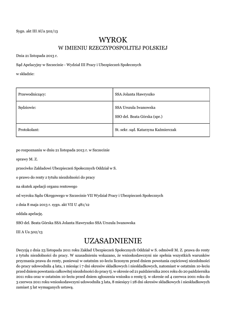 Sygn. akt III AUa 502/13 WYROK W IMIENIU RZECZYPOSPOLITEJ POLSKIEJ Dnia 21 listopada 2013 r. Sąd Apelacyjny w Szczecinie - Wydział III Pracy i Ubezpieczeń Społecznych w składzie: Przewodniczący: SSA Jolanta Hawryszko Sędziowie: SSA Urszula Iwanowska SSO del. Beata Górska (spr.) Protokolant: St. sekr. sąd. Katarzyna Kaźmierczak po rozpoznaniu w dniu 21 listopada 2013 r. w Szczecinie sprawy M. Z. przeciwko Zakładowi Ubezpieczeń Społecznych Oddział w S. o prawo do renty z tytułu niezdolności do pracy na skutek apelacji organu rentowego od wyroku Sądu Okręgowego w Szczecinie VII Wydział Pracy i Ubezpieczeń Społecznych z dnia 8 maja 2013 r. sygn. akt VII U 481/12 oddala apelację. SSO del. Beata Górska SSA Jolanta Hawryszko SSA Urszula Iwanowska III A Ua 502/13 UZASADNIENIE Decyzją z dnia 23 listopada 2011 roku Zakład Ubezpieczeń Społecznych Oddział w S. odmówił M. Z. prawa do renty z tytułu niezdolności do pracy. W uzasadnieniu wskazano, że wnioskodawczyni nie spełnia wszystkich warunków przyznania prawa do renty, ponieważ w ostatnim 10-leciu liczonym przed dniem powstania częściowej niezdolności do pracy udowodniła 4 lata, 1 miesiąc i 7 dni okresów składkowych i nieskładkowych, natomiast w ostatnim 10-leciu przed dniem powstania całkowitej niezdolności do pracy tj. w okresie od 21 października 2001 roku do 20 października 2011 roku oraz w ostatnim 10-leciu przed dniem zgłoszenia wniosku o rentę tj. w okresie od 4 czerwca 2001 roku do 3 czerwca 2011 roku wnioskodawczyni udowodniła 3 lata, 8 miesięcy i 28 dni okresów składkowych i nieskładkowych zamiast 5 lat wymaganych ustawą. M. Z. zaskarżyła powyższa decyzję, domagając się przyznania prawa do renty z tytułu całkowitej niezdolności do pracy. W uzasadnieniu odwołania skarżąca zarzuciła organowi rentowemu, że nie wziął pod uwagę tego, że zgodnie z utrwalonym orzecznictwem renta z tytułu niezdolności do pracy przysługuje ubezpieczonemu, który udowodnił okres składkowy i nieskładkowy wynoszący co najmniej 20 lat dla kobiety oraz jest całkowicie niezdolny do pracy (tj. spełnia warunki opisane w art. 57 ust. 2 ustawy emerytalnej), bez potrzeby wykazywania przewidzianego w art. 58 ust. 2 tej ustawy pięcioletniego okresu składkowego i nieskładkowego przypadającego w ciągu ostatniego dziesięciolecia przed zgłoszeniem wniosku o rentę lub przed dniem powstania niezdolności do pracy. W odpowiedzi na odwołanie organ rentowy wniósł o jego oddalenie, podtrzymując w całości argumentację przedstawioną w zaskarżonej decyzji. Sąd Okręgowy w Szczecinie VII Wydział Pracy i Ubezpieczeń Społecznych przyznał ubezpieczonej prawo do renty z tytułu całkowitej niezdolności do pracy na stałe oraz dodatek pielęgnacyjny na okres od dnia złożenia wniosku na okres 3 lat. Sąd Okręgowy ustalił i zważył: M. Z. urodziła się (...). Posiada wykształcenie podstawowe, pracowała fizycznie m.in. jako dozorczyni domów, pracownik produkcji leśnej, sprzątaczka. W okresie od 24 lipca 2009 roku do 18 lipca 2010 roku przysługiwało ubezpieczonej świadczenie rehabilitacyjne. W dniu 13 grudnia 2010 roku odwołująca złożyła wniosek o rentę z tytułu niezdolności do pracy. Organ rentowy decyzją z 16 lutego 2011 roku odmówił przyznania wnioskowanego świadczenia, ponieważ mimo stwierdzenia przez Lekarza Orzecznika ZUS częściowej niezdolności do pracy od 28 stycznia 2009 roku do 31 stycznia 2013 roku, wnioskodawczyni nie udowodniła 5-cio letniego okresu ubezpieczenia przypadającego w ciągu ostatniego dziesięciolecia przed zgłoszeniem wniosku o rentę lub przed dniem powstania niezdolności do pracy. Ubezpieczona w dniu 3 czerwca 2011 roku złożyła kolejny wniosek o rentę z tytułu niezdolności do pracy. Po rozpatrzeniu ww. wniosku organ rentowy decyzją z dnia 17 czerwca 2011 roku odmówił wnioskowanego świadczenia, na mocy art. 114 ustawy o emeryturach i rentach z Funduszu Ubezpieczeń Społecznych. Na skutek odwołania od decyzji z 17 czerwca 2011 roku, Sąd Okręgowy w Szczecinie, VII Wydział Pracy i Ubezpieczeń Społecznych, zarządzeniem z 5 września 2011 roku zwrócił organowi rentowemu akta celem wydania przez Lekarza Orzecznika ZUS orzeczenia, a następnie wydania na tej podstawie decyzji ustalającej prawo do renty z tytułu niezdolności do pracy. Orzeczeniem z dnia 24 października 2011 roku Lekarz Orzecznik ZUS stwierdził, że wnioskodawczyni jest całkowicie okresowo niezdolna do pracy od 20 października 2011 roku do 31 października 2014 roku. M. Z. udowodniła łącznie 22 lata, 4 miesiące i 19 dni okresów składkowych i nieskładkowych (okresy nieskładkowe zostały uwzględnione w wymiarze, o którym mowa w art. 5 ust. 2 ustawy emerytalnej). U wnioskodawczyni rozpoznaje się: - chorobę wieńcową stabilną IIo wg. CCS, - przebyte dwustronne ostre zespoły wieńcowe (styczeń i grudzień 2009 rok) z nagłym zatrzymaniem krążenia, - przebytą w styczniu 2009 roku angioplastykę z implantacja stentu do LAD, - przebytą w marcu 2010 roku implantację kardiowertera-defibrylatora, - nadciśnienie tętnicze, - chorobę wrzodową w wywiadzie, - dyskopatię od C3 do C7 z zespołem bólowym w wywiadzie bez cech podrażnienia obwodowego i ośrodkowego układu nerwowego, - zespół bolesnego barku lewego, - okresowe zaburzenia równowagi ciała pochodzenia zapalnego, - przebytą operację poszerzenia tchawicy, - stridor, - stan po założeniu stentu do tchawicy z powodu zwężenia tchawicy po przedłużonej intubacji w przebiegu NZK, - przewlekłą obturacyjną chorobę płuc. M. Z. jest całkowicie niezdolna do pracy od 23 stycznia 2009 roku, z powodu utrzymującego się trwale stridoru po założeniu stentu do tchawicy z powodu jej zwężenia. Niezdolność ma charakter stały, z uwagi na brak możliwości poszerzenia światła tchawicy (trwałe zmiany anatomiczne i korekcja rurką stentu). Dołączone do akt badanie spirometry