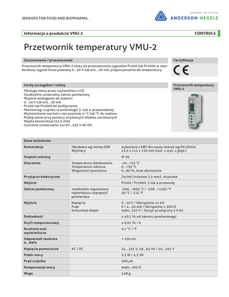 SENSORS FOR FOOD AND BIOPHARMA. Informacja o produkcie VMU-2 CONTROLS Przetwornik temperatury VMU-2 Zastosowanie / przeznaczenie Certyfikacja PrzetworniktemperaturyVMU-2służydoprzetwarzaniasygnałówPt100lubPt1000wstandardowysygnałlinearyzowany0...10Vlub0/4...20mA,proporcjonalniedotemperatury. Cechy szczególne / zalety · · · · · · · · · · Przetwornik temperatury VMU-2 ObsługamenuprzezwyświetlaczLCD Swobodnieustawialnyzakrespomiarowy Wyjścieanalogowedowyboru 0...10Vlub0/4...20mA Pt100lubPt1000dopodłączenia Monitoringczujnikawtechnologii3-lub4-przewodowej Wyświetlaniewartościrzeczywistejw°Club°F,dowyboru Podłączenieprzypomocywtykowychblokówzaciskowych Wąskakonstrukcja(22,5mm) Zasilanieuniwersalne24/20...255VAC/DC Dane techniczne Konstrukcja ObudowawgnormyDIN Wymiary Stopień ochrony Otoczenie wykonanazABSdlaszynynośnejwgEN50022 22,5x111x120mm(szer.xwys.xgłęb.) IP20 Temperaturaskładowania Temperaturarobocza Wilgotnośćpowietrza -10...+55°C 0...+55°C 0...95%,brakobroszenia Przyłącze elektryczne Zaciskiśrubowe2,5mm2,wtykowe Wejście Pt100/Pt1000,3lub4przewody Zakres pomiarowy swobodnieregulowany najmniejszarozpiętość pomiarowa -200...+850°C/-328...+1562°F 50°C/122°F Wyjście Napięcie Prąd Komunikatbłędu 0...10V/Obciążenie≥1kΩ 0/4...20mA/Obciążenie≤500Ω maks.250V/Zestykprzełączny3AAC Dokładność ≤±0,1%odzakresupomiarowego Dryft temperaturowy ≤0,01%/K Rozdzielczość wyświetlacza 0,1°C/°F Odpowiedź skokowa 0...99% <250ms Napięcie pomocnicze AC/DC 24...255V,48...62Hz/20...255V Pobór mocy 2,5W/4,5VA Prąd czujnika 500µA Kompensacja mocy maks.100Ω Waga 148g Przyłącze elektryczne | Uruchomienie CONTROLS Widok z boku i z przodu Ustawianie parametru Schemat blokowy 1. Nacisnąć przycisk „set” i przytrzymać przez co najmniej 5 sekund. Pojawi się tekst „press set 5 s for setup”. Urządzenie przestawia się następnie w tryb„SET”. 2. Wybrać żądane parametry przyciskami „up” i „down”. 3. Wcisnąć przycisk „set”. Urządzenie przechodzi w tryb ustawiania na wybrany parametr. 4. Wybrać żądaną wartość przyciskami „up” i „down”. 5. Jeśli wprowadzono żądaną wartość, należy potwierdzić ją przyciskiem „set”. Urządzenie przechodzi do menu głównego. 6. Powtórzyć kroki od punktu 2 do 5 dla wszystkich parametrów, które należy zmienić (patrz schemat menu). 7. Wybrać menu „Save and Exit” i potwierdzić przyciskiem „set”. Ustawione parametry zostaną zapamiętane. Urządzenie powraca automatycznie do trybu pracy. Test działania 1. Podłączyć czujnik temperatury lub symulator do wejścia (KL 1 do 4) Należy przy tym zwrócić uwagę na podłączenie 3- lub 4-przewodowe (zgodnie z konfiguracją oprogramowania) 2. Podłączyć napięcie pomocnicze (KL 9/10). 3. Przy pomocy menu ustawić parametry urządzenia (np. dolny zakres pomiarowy na 0 °C, a górny zakres pomiarowy na 100 °C) jak opisano wyżej. 4. Sprawdzić działanie wyjść analogowych poprzez powolne podwyższanie ew. obniżanie sygnału wejściowego w ustawionych granicach. 5. Odłączyć czujnik i sprawdzić jego funkcję monitoringu. (Zapala się czerwona dioda LED, a przekaźnik odłącza się po ok. 3-4 sekundach.) 6. Podłączyć ponownie czujnik. Nacisnąć krótko dowolny przycisk. Po ok. 3 sekundach znika komunikat błędu. 20...255 V DC 24...255 V AC Informacja Gdy moduł znajduje się w trybie SET, mierzone wartości nie są rejestrowane, a wyjścia przełączające nie są zmieniane. Jeśli w ciągu ok. 30 sekund nie zostanie wciśnięty żaden przycisk, urządzenie wraca automatycznie z powrotem do trybu pracy, a zmieniane do tego momentu parametry zostaną odrzucone. Podobnie jest, gdy opuszcza się tryb SET przez naciśnięcie menu „cancel”. Urządzenie pracuje wówczas z ostatnio zapamiętanymi parametrami. Jeśli tryb SET opuszcza się naciskając menu „Reset” ładowane są parametry fabryczne. 2 3 Schemat menu | Parametry CONTROLS Schemat menu SET MODE: Jeśli przez 30 sekund nie przyciska się żadnego przycisku, urządzenie przełącza się automatycznie w tryb pracy. Parametry nie ulegają zmianie. Save and Exit: Zapisuje wprowadzone parametry na stałe i przełącza z powrotem do trybu pracy. Cancel: Powrót do trybu pracy bez zapisywania parametrów. Reset: Parametry fabryczne zostały załadowane, powrót do trybu pracy. Parametry Kod Funkcja Input range min Początek zakresu pomiarowego Input range max Koniec zakresu pomiarowego Input unit Input RTD type Input measure type Jednostka temperatury Rodzaj czujnika Technika podłączenia °C / °F Pt100 / Pt1000 3-przewod./ 4-przewod. °C Pt100 4-przewod. Output Rodzaj wyjścia 0...10 V / 0/4...20 mA 0...10 V Save & Exit Zapisz ustawione parametry Cancel Zakończ bez zapisywania Reset Przywrócenie parametrów fabrycznych Ustawienie -200...+850 °C -328...+1562 °F -200...+850 °C -328...+1562 °F Parametr fabryczny 0°C 200 °C Informacja o produkcie VMU-2 CONTROLS Informacja Przy temperaturach powyżej 50°C znacznie pogarsza się kontrast wyświetlacza, aż do całkowitego braku czytelności. Nie pogarsza się przez to funkcjonalność urządzenia. Dla podanego zakresu temperatur roboczych nie następuje uszkodzenie wyświetlacza. Przy obniżeniu temperatury do 50°C powraca czytelność wyświetlacza. Wskazówki montażowe Użycie zgodne z przeznaczeniem ·· Podczas montażu prosimy o przestrzeganie zaleceń bezpieczeństwa z karty charakterystyki dołączonej do urządzenia! ·· Nie nadaje się do stosowania w obszarach zagrożonych wybuchem. ·· Nie nadaje się do stosowania w elementach instalacji istotnych dla bezpieczeństwa (SIL). Transport / przechowywanie ·· Nie przechowywać na wolnym powietrzu ·· Przechować w miejscu suchym i wolnym od pyłu ·· Nie wystawiać na działanie agresywnych mediów ·· Chronić przed bezpośrednim nasłonecznieniem ·· Unikać wstrząsów mechanicznych ·· Temperatura składu