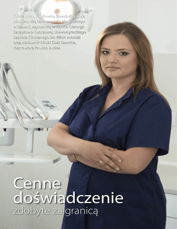 Z dr n. med. Agnieszką Kozak-Rusinek, absolwentką Uniwersytetu Medycznego w Bawarii, asystentką w Klinice Chirurgii Szczękowo-Twarzowej Uniwersyteckiego Szpitala Klinicznego im. WAM w Łodzi oraz kierownik kliniki Gold Dentica, rozmawiała Paulina Budna Cenne doświadczenie zdobyte za granicą t w ó j p r z e g l ą d s t o m at o l o g i c z n y 7-8/2015 Pani Doktor, pracuje Pani jako asystent i kształci się w Klinice Chirurgii Szczękowo-Twarzowej, czy ta, wydawałoby się, „męska” dziedzina stomatologii nie sprawia trudności kobietom? Jakie motywy kierowały Panią przy wyborze drogi zawodowej? Chirurgia szczękowo-twarzowa jest najbardziej wymagającą gałęzią stomatologii. Przez wiele lat dopuszczalna tylko po ukończeniu dwóch fakultetów stała się w pewnym stopniu dostępna dla wybranych. Jako dziedzina egzekwująca zarówno ogromną wiedzę, umiejętności, odporność fizyczną, jak i psychiczną oraz kunszt artystyczny, wielu onieśmiela, innych zaś właśnie tym pociąga. Ja chyba należę do tej drugiej grupy. Zawsze lubiłam wyzwania. Nie dzieliłabym jednak specjalności lekarskich na damskie i męskie. Raczej należałoby tu zauważyć, iż pewne osoby mają predyspozycje do wykonywania procedur chirurgicznych, a inne nie. Często słyszę od moich pacjentów, „oj taka trudna ekstrakcja, chyba sobie Pani nie poradzi, tu trzeba silnego mężczyzny”. Wyjaśnianie, że nie siła, lecz technika jest kluczowa, pozostanie jeszcze długo piętnem każdej kobiety, która chce uprawiać którykolwiek rodzaj chirurgii. Skąd więc pomysł na doktorat z dziedziny endodoncji? Wbrew powszechnie przyjętym algorytmom działania zawsze chciałam robić to, w czym byłam najsłabsza. Wiem, że nie można umieć wszystkiego, ale ambicja zawsze prowadziła mnie do perfekcjonizmu. Na etapie wybierania tematu badań do doktoratu, a było to jeszcze na studiach w Niemczech, czułam się niepewnie właśnie w endodoncji, więc chciałam to zmienić. Stąd wybór tematu dotyczącego irygacji kanałów korzeniowych. Moja determinacja została zauważona i nagrodzona możliwością przedstawienia wyników badań na międzynarodowym kongresie endodontycznym. Wiele godzin spędzonych w laboratorium i setki opracowanych kanałów sprawiły, że strach przed endodoncją minął, a kolejnym wyzwaniem zdawała się właśnie chirurgia. Pani Doktor, łączy Pani pracę naukowodydaktyczną z prowadzeniem nowoczesnej kliniki stomatologicznej, czy takie połączenie ma zalety? Praca naukowa pozwala na ciągły rozwój nie tylko osobisty, ale w głównej mierze zawodowy. Motywuje do zapoznawania się z najnowszymi doniesieniami naukowymi, wynikami badań z różnych zakątków świata. Może bez tego łatwiej byłoby popaść w rutynę zawodową. Prowadzenie własnej kliniki stomatologicznej, chęć jej unowocześniania i rozwijania zakresu oferowanych usług wymagaja bardzo aktualnej wiedzy i nadążania za zmianami, śledzenia trendów. Własny gabinet jest s y lw e t k i s t o m at o l o g i i dla mnie taką perełką, kolejnym celem w życiu czy też spełnieniem marzeń. Chciałabym, żeby zawsze zasługiwał na miano nowoczesnej kliniki stomatologicznej i w tym kierunku zmierzam. Zdaję sobie jednak sprawę, że jest to zasługa doskonałego zespołu pracujących ze mną lekarzy. Kogo ze swoich nauczycieli zawodu wspomina Pani Doktor najcieplej? Z czyich rad i doświadczeń korzysta Pani najczęściej w trakcie pracy zawodowej? Najważniejsze lata studiów, te kliniczne, spędziłam na Friedrich Alexander Universitaet w Erlangen pod Norymbergą w Bawarii w Niemczech. Ten czas nauki ukształtował mnie jako lekarza stomatologa. Mimo że w Niemczech studiuje się razem z regularnymi studentami, nie ma osobnych grup dla obcokrajowców, a co za tym idzie – nie można liczyć na żadne ulgi językowe; spotkał mnie tam ogrom ciepła i życzliwości ze strony zarówno kolegów z roku, jak i nauczycieli. Pasję do zawodu stomatologa i holistyczne spojrzenie na pacjenta zaszczepił we mnie prof. A. Petschelt – bardzo szanowany i lubiany, charyzmatyczny szef Stomatologii Zachowawczej z Endodoncją i Periodontologią. On wyznaczył pewne standardy, którymi kieruję się teraz w prowadzeniu własnej kliniki stomatologicznej. Zainteresowanie chirurgią stomatologiczną i szczękową to w dużym stopniu zasługa wzbudzającego pewien strach i podziw, uznanego w Europie chirurga szczękowego prof. F. Neukama, który prowadził wykłady dla studentów niczym konsylia naukowe z pacjentem obecnym na sali wykładowej lub z ciekawymi operacjami transmitowanymi na żywo z sali operacyjnej. Po powrocie do Polski napotkałam liczne problemy natury głównie proceduralnej, mimo naszego członkostwa w Unii Europejskiej. Na szczęście mogłam liczyć na zrozumienie i życzliwość ze strony dziekana mojego macierzystego Wydziału Uniwersytetu Medycznego w Łodzi profesora Jerzego Sokołowskiego. W mojej obecnej pracy w Klinice Chirurgii Szczękowo-Twarzowej UM w Łodzi staram się zaś czerpać garściami z rad i doświadczeń mojego szefa – profesora Marcina Kozakiewicza oraz pozostałych starszych kolegów i koleżanek. Czy studia w Niemczech przyniosły Pani doktor same korzyści? Czy są one dostępne dla każdego, czy trzeba spełniać jakieś dodatkowe wymogi? Czy mogłaby je Pani polecić swoim kolegom? Studiowałam w Niemczech dwa ostatnie lata i ukończyłam studia egzaminem państwowym porównywalnym do naszego LDEK-u. Przez ten czas z bardzo ubogiej znajomości języka niemieckiego sprowadzającej się do możliwości kupienia chleba w sklepie doszłam 15 s y lw e t k i s t o m at o l o g i i do zaawansowanej znajomości języka medycznego. Poznałam zachodnie standardy świadczenia usług stomatologicznych, pracowałam na najlepszej jakości sprzęcie niemieckim, brałam udział w licznych dodatkowych, dobrowolnych, bezpłatnych zajęciach dokształcających, które organizowała swo