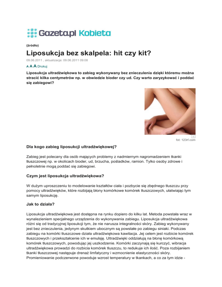 (źródło) Liposukcja bez skalpela: hit czy kit? 09.06.2011 , aktualizacja: 09.06.2011 09:08 AA A Drukuj Liposukcja ultradźwiękowa to zabieg wykonywany bez znieczulenia dzięki któremu moŜna stracić kilka centymetrów np. w obwiedzie bioder czy ud. Czy warto zaryzykować i poddać się zabiegowi? fot: 123rf.com Dla kogo zabieg liposukcji ultradźwiękowej? Zabieg jest polecany dla osób mających problemy z nadmiernym nagromadzeniem tkanki tłuszczowej np. w okolicach bioder, ud, brzucha, pośladków, ramion. Tylko osoby zdrowe i pełnoletnie mogą poddać się zabiegowi. Czym jest liposukcja ultradźwiękowa? W duŜym uproszczeniu to modelowanie kształtów ciała i pozbycie się zbędnego tłuszczu przy pomocy ultradźwięków, które rozbijają błony komórkowe komórek tłuszczowych, ułatwiając tym samym liposukcję. Jak to działa? Liposukcja ultradźwiękowa jest dostępna na rynku dopiero do kilku lat. Metoda powstała wraz w wynalezieniem specjalnego urządzenia do wykonywania zabiegu. Liposukcja ultradźwiękowa róŜni się od tradycyjnej liposukcji tym, Ŝe nie narusza integralności skóry. Zabieg wykonywany jest bez znieczulenia, jedynym skutkiem ubocznym są powstałe po zabiegu siniaki. Podczas zabiegu na komórki tłuszczowe działa ultradźwiękowa kawitacja. Jej celem jest rozbicie komórek tłuszczowych i przekształcenie ich w emulsję. Ultradźwięki oddziałują na błonę komórkową komórek tłuszczowych, powodując jej uszkodzenie. Komórki zaczynają się kurczyć, wibracja ultradźwiękowa prowadzi do rozbicia komórek tłuszczu, to redukuje ich ilość. Poza rozbijaniem tkanki tłuszczowej następuje drenaŜ limfatyczny i wzmocnienie elastyczności skóry. Promieniowanie podczerwone powoduje wzrost temperatury w tkankach, a co za tym idzie - szybszy metabolizm. Uwolniony z tkanki tłuszcz i toksyny są usuwane z ciała poprzez gruczoły potowe oraz układ limfatyczny i naczyniowy. Wszystkie produkty zabiegu docierają do wątroby, gdzie komórki tłuszczowe ulęgają identycznej przemianie jak tłuszcz pochodzący z pokarmów. Z uwagi iŜ zabieg przebiega zgodnie z naturalnym sposobem wydalania metabolitów, w trakcje sesji trwającej od 1,5 do 3 godzin, usunięte moŜe być nie więcej niŜ 500 ml tłuszczu. Liposukcja ultradźwiękowa pozwala usunąć nadmiar tłuszczu z obszarów bioder, pośladków, ud, pleców, ramion, talii. Chcąc uzyskać lepsze efekty zabieg często przeprowadzany jest w połączeniu z innymi technikami przyczyniającymi się do usuwania złogów tłuszczu i nadmiaru płynów (np. masaŜe, drenaŜ limfatyczny). Efekty zabiegu Na pełny efekt zabiegu trzeba czekać około miesiąca. Po tym czasie wszystkie zniszczone ultradźwiękiem tkanki tłuszczowe zostaną wyeliminowane z organizmu. Zabieg jest bezbolesny i bezinwazyjny, nie wymaga rekonwalescencji jak np. po zabiegu chirurgicznym. Po zabiegu Chcąc uniknąć gromadzenia się tkanki tłuszczowej w miejscach jej usunięcia naleŜy przestrzegać zasad zdrowej diety. WaŜne jest aby ograniczać węglowodany: cukry, produkty mączne. Lekką dietę naleŜy łączyć z indywidualnie dobranymi ćwiczeniami. Przeciwwskazania Przeciwwskazaniem do zabiegu liposukcji ultradźwiękowej jest najczęściej: ciąŜa i karmienie piersią, choroby przewlekłe narządów wewnętrznych, zmiany na skórze: wysypki, rany, blizny, słaba krzepliwość krwi, choroby nowotworowe, osteoporoza, nadciśnienie tętnicze, choroby endokrynologiczne (np. otyłość), przyjmowanie leków hormonalnych. Pacjent musi być teŜ pełnoletni. O czy warto wiedzieć? Liposukcji ultradźwiękowej nie stosuje się do znacznego zmniejszenia masy ciała pacjenta, jest to metoda redukująca złogi tłuszczu i cellulit oraz pomagająca korygować kształty ciała. Liposukcji ultradźwiękowej nie naleŜy traktować jako formy leczenia nadwagi.