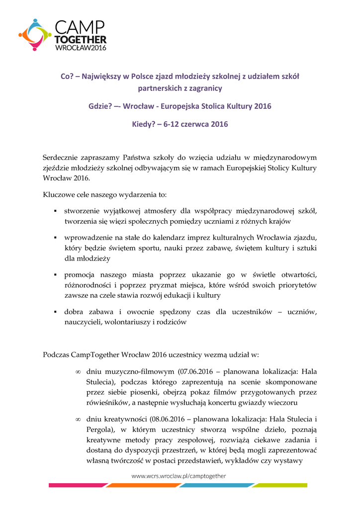 Co? – Największy w Polsce zjazd młodzieży szkolnej z udziałem szkół partnerskich z zagranicy Gdzie? –- Wrocław - Europejska Stolica Kultury 2016 Kiedy? – 6-12 czerwca 2016 Serdecznie zapraszamy Państwa szkoły do wzięcia udziału w międzynarodowym zjeździe młodzieży szkolnej odbywającym się w ramach Europejskiej Stolicy Kultury Wrocław 2016. Kluczowe cele naszego wydarzenia to: stworzenie wyjątkowej atmosfery dla współpracy międzynarodowej szkół, tworzenia się więzi społecznych pomiędzy uczniami z różnych krajów wprowadzenie na stałe do kalendarz imprez kulturalnych Wrocławia zjazdu, który będzie świętem sportu, nauki przez zabawę, świętem kultury i sztuki dla młodzieży promocja naszego miasta poprzez ukazanie go w świetle otwartości, różnorodności i poprzez pryzmat miejsca, które wśród swoich priorytetów zawsze na czele stawia rozwój edukacji i kultury dobra zabawa i owocnie spędzony czas dla uczestników – uczniów, nauczycieli, wolontariuszy i rodziców Podczas CampTogether Wrocław 2016 uczestnicy wezmą udział w: • dniu muzyczno-filmowym (07.06.2016 – planowana lokalizacja: Hala Stulecia), podczas którego zaprezentują na scenie skomponowane przez siebie piosenki, obejrzą pokaz filmów przygotowanych przez rówieśników, a następnie wysłuchają koncertu gwiazdy wieczoru • dniu kreatywności (08.06.2016 – planowana lokalizacja: Hala Stulecia i Pergola), w którym uczestnicy stworzą wspólne dzieło, poznają kreatywne metody pracy zespołowej, rozwiążą ciekawe zadania i dostaną do dyspozycji przestrzeń, w której będą mogli zaprezentować własną twórczość w postaci przedstawień, wykładów czy wystawy • dniu sportu (09.06.2016 – planowana lokalizacja: Pola Marsowe), pełnym rozgrywek sportowych i poznawania nowych dyscyplin, z dodatkowymi atrakcjami w postaci warsztatów sportowych oraz gier planszowych • dniu rozrywki (10.06.2016 – planowana lokalizacja: Wyspa Słodowa, plac przed NFM), w którym odbędzie się pochód przy specjalnie skomponowanym na tę okazję Rytmie Wrocławia. Atrakcją wieczoru będzie natomiast dyskoteka na wolnej przestrzeni przy Narodowym Forum Muzyki i pokaz filmu podsumowującego CampTogether • w sobotnim Flow – autorskim programie artystycznym Chrisa Baldwina, zaprojektowanym w ramach ESK 2016. Flow to przedstawienie, w którym głównym narratorem a jednocześnie tematem przedstawienia będzie miasto, jego mieszkańcy oraz diaspory Wrocławia Podczas przygotowań do CampTogether Wrocław 2016 uczestnicy wezmą udział w: • tworzeniu własnych filmów przedstawiających miejsca, z których pochodzą, w których mieszkają • tworzeniu własnych piosenek, które będą mogły stać się hitami CampTogether Mając nadzieję, że program naszego wydarzenia przypadnie Państwu do gustu, zapraszamy serdecznie wszystkie szkoły do zgłaszania uczestników oraz nawiązywania kontaktów ze swoimi szkołami partnerskimi za granicą, w celu zaproszenia ich do Wrocławia. Strona internetowa: http://wcrs.wroclaw.pl/CampTogether e-mail do organizatora: [email protected] zapisy: http://wcrs.wroclaw.pl/zapisycamptogether