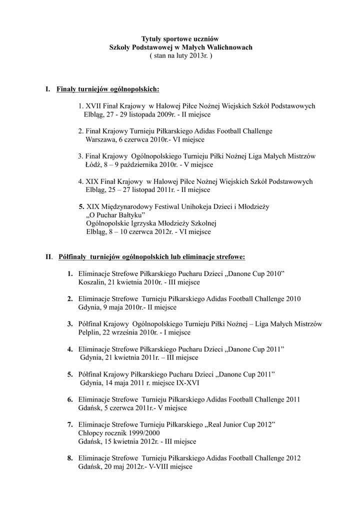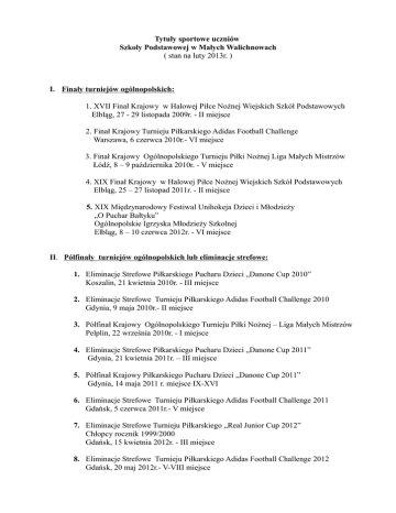 Tytuły sportowe uczniów Szkoły Podstawowej w Małych Walichnowach ( stan na luty 2013r. ) I. Finały turniejów ogólnopolskich: 1. XVII Finał Krajowy w Halowej Piłce Nożnej Wiejskich Szkół Podstawowych Elbląg, 27 - 29 listopada 2009r. - II miejsce 2. Finał Krajowy Turnieju Piłkarskiego Adidas Football Challenge Warszawa, 6 czerwca 2010r.- VI miejsce 3. Finał Krajowy Ogólnopolskiego Turnieju Piłki Nożnej Liga Małych Mistrzów Łódź, 8 – 9 października 2010r. - V miejsce 4. XIX Finał Krajowy w Halowej Piłce Nożnej Wiejskich Szkół Podstawowych Elbląg, 25 – 27 listopad 2011r. - II miejsce 5. XIX Międzynarodowy Festiwal Unihokeja Dzieci i Młodzieży „O Puchar Bałtyku” Ogólnopolskie Igrzyska Młodzieży Szkolnej Elbląg, 8 – 10 czerwca 2012r. - VI miejsce II. Półfinały turniejów ogólnopolskich lub eliminacje strefowe: 1. Eliminacje Strefowe Piłkarskiego Pucharu Dzieci „Danone Cup 2010” Koszalin, 21 kwietnia 2010r. - III miejsce 2. Eliminacje Strefowe Turnieju Piłkarskiego Adidas Football Challenge 2010 Gdynia, 9 maja 2010r.- II miejsce 3. Półfinał Krajowy Ogólnopolskiego Turnieju Piłki Nożnej – Liga Małych Mistrzów Pelplin, 22 września 2010r. - I miejsce 4. Eliminacje Strefowe Piłkarskiego Pucharu Dzieci „Danone Cup 2011” Gdynia, 21 kwietnia 2011r. – III miejsce 5. Półfinał Krajowy Piłkarskiego Pucharu Dzieci „Danone Cup 2011” Gdynia, 14 maja 2011 r. miejsce IX-XVI 6. Eliminacje Strefowe Turnieju Piłkarskiego Adidas Football Challenge 2011 Gdańsk, 5 czerwca 2011r.- V miejsce 7. Eliminacje Strefowe Turnieju Piłkarskiego „Real Junior Cup 2012” Chłopcy rocznik 1999/2000 Gdańsk, 15 kwietnia 2012r. - III miejsce 8. Eliminacje Strefowe Turnieju Piłkarskiego Adidas Football Challenge 2012 Gdańsk, 20 maj 2012r.- V-VIII miejsce III. Finały wojewódzkie: 1. Finał XXXIV Wojewódzkich Igrzysk Młodzieży Szkolnej w Unihokeju Gdańsk, 21 grudnia 2005r. - V miejsce 2. Finał Wojewódzki VI Turnieju Piłki Nożnej Dla Dzieci „Z podwórka na stadion o Puchar Tymbarku” Gdańsk, 21 czerwca 2006r. - faza grupowa ( chłopcy ) 3. Finał Wojewódzki XII Pucharu TP w Piłce Nożnej dla Dzieci Stężyca, 11 czerwca 2007r. - IX miejsce ( chłopcy ) 4. Finał XXXVI Wojewódzkich Igrzysk Młodzieży Szkolnej w Halowej Piłce Nożnej Wiejskich Szkół Podstawowych Przechlewo, 9 listopada 2007r. - VI miejsce 5. Finał Wojewódzki XIII Pucharu TP w Piłce Nożnej dla Dzieci Gdańsk, 23 maja 2008r. - III miejsce ( dziewczęta ) 6. Finał Wojewódzki XIII Pucharu TP w Piłce Nożnej dla Dzieci Gdańsk, 23 maja 2008r. - V miejsce ( chłopcy ) 7. Finał Wojewódzki VIII Turnieju Piłki Nożnej Dla Dzieci „Z podwórka na stadion o Puchar Tymbarku” Gniewino, 11 czerwca 2008r. - faza grupowa ( chłopcy ) 8. Finał XXXVII Wojewódzkich Igrzysk Młodzieży Szkolnej w Unihokeju Dziewcząt Prabuty, 17 listopada 2008r. - IV miejsce 9. Finał XXXVII Wojewódzkich Igrzysk Młodzieży Szkolnej w Unihokeju Chłopców Prabuty, 19 listopada 2008r. - II miejsce 10. Finał Wojewódzki IX Turnieju Piłki Nożnej Dla Dzieci „Z Podwórka na Stadion o Puchar Tymbarku” Gniewino, 27 maja 2009r. - dziewczęta miejsce V, chłopcy miejsce V-VIII, 11. Finał Wojewódzki XIV Pucharu Orange Cup 2009 w Piłce Nożnej Dla Dzieci im. Marka Wielgusa Pruszcz Gdański, 29 maja 2009r. - V- VIII miejsce ( chłopcy ) 12. Finał XXXVIII Wojewódzkich Igrzysk Młodzieży Szkolnej w Halowej Piłce Nożnej Wiejskich Szkół Podstawowych Przechlewo, 7 listopada 2009r. - II miejsce 13. Finał Wojewódzki XV Pucharu Orange Cup 2010 w Piłce Nożnej Dla Dzieci im. Marka Wielgusa Stężyca, 22 maja 2010r. XV miejsce ( dziewczęta ) 14. Finał Wojewódzki Ogólnopolskiego Turnieju Piłkarskiego Liga Małych Mistrzów Kartuzy, 22 czerwca 2010r. - II miejsce ( chłopcy ) 15. Finał XXXIX Wojewódzkich Igrzysk Młodzieży Szkolnej w Halowej Piłce Nożnej Wiejskich Szkół Podstawowych Przechlewo, 6 listopada 2010r. - IV miejsce 16. Finał XXXIX Wojewódzkich Igrzysk Młodzieży Szkolnej w Unihokeju Dziewcząt Rumia, 17 listopada 2010r. - IV miejsce 17. Finał Wojewódzki XVI Pucharu Orange Cup 2011 w Piłce Nożnej Dla Dzieci im. Marka Wielgusa Stężyca, 21 maja 2011r. - udział w fazie grupowej ( dziewczęta ) 18. Finał Wojewódzki XI Turnieju Piłki Nożnej Dla Dzieci „Z Podwórka na Stadion o Puchar Tymbarku” Kwidzyn, 6 czerwca 2011r. - udział w fazie grupowej ( dziewczęta ) 19. Finał Wojewódzki II Turnieju Orlika „O Puchar premiera Donalda Tuska” Kwidzyn, 28 września 2011r. - IV miejsce ( dziewczęta ) 20. Finał XL Wojewódzkich Igrzysk Młodzieży Szkolnej w Unihokeju Chłopców Rumia, 17 listopada 2011r. - I miejsce 21. Finał Wojewódzki XII Turnieju Piłki Nożnej Dla Dzieci „Z Podwórka na Stadion O Puchar Tymbarku” Stężyca, 24 maja 2012r. - III miejsce ( dziewczęta ) 22. Finał XLI Wojewódzkich Igrzysk Młodzieży Szkolnej w Unihokeju Chłopców Rumia, 3 grudnia 2012r. - VI miejsce IV. Półfinały wojewódzkie: 1. Półfinały Wojewódzkich Igrzysk Młodzieży Szkolnej w Unihokeju Dziewcząt: Gdynia, 5 listopada 2008r. - I miejsce Gdynia, 10 listopada 2009r. - II miejsce Gdynia, 15 listopada 2010r. - I miejsce 2. Półfinały Wojewódzkich Igrzysk Młodzieży Szkolnej w Unihokeju Chłopców: Sopot, 14 grudnia 2005r. - I miejsce Gdynia, 16 listopada 2006r. - III miejsce Gdynia, 8 listopada 2007r. - III miejsce Gdynia, 5 listopada 2008r. - I miejsce Gdynia, 15 listopada 2011r. - I miejsce Gdynia, 12 listopada 2012r. - I miejsce 3. Półfinał Wojewódzki XI Pucharu TP w Piłce Nożnej Dla Dzieci im. Marka Wielgusa Pruszcz Gdański, 23 maja 2006r. - faza grupowa ( chłopcy ) 4. Półfinał Wojewódzki XII Pucharu TP w Piłce Nożnej Dla Dzieci im. Marka Wielgusa Rakowiec k/Kwidzyna, 25 maja 2007r. - I miejsce ( chłopcy ) 5. Półfinał Wojewódzki Turnieju Piłkarskiego Coca Cola Cup 2008 Skarszewy – 21.04.2008r. - II miejsce ( chłopcy ) 6