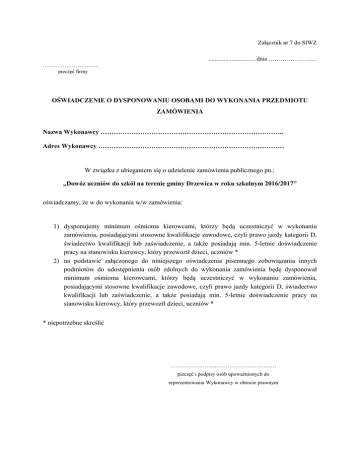 Załącznik nr 7 do SIWZ ............................... dnia …………………… …………………………. pieczęć firmy OŚWIADCZENIE O DYSPONOWANIU OSOBAMI DO WYKONANIA PRZEDMIOTU ZAMÓWIENIA Nazwa Wykonawcy ……………………………………………………………………….. Adres Wykonawcy ………………………………………………………………………… W związku z ubieganiem się o udzielenie zamówienia publicznego pn.: „Dowóz uczniów do szkól na terenie gminy Drzewica w roku szkolnym 2016/2017” oświadczamy, że w do wykonania w/w zamówienia: 1) dysponujemy minimum ośmioma kierowcami, którzy będą uczestniczyć w wykonaniu zamówienia, posiadającymi stosowne kwalifikacje zawodowe, czyli prawo jazdy kategorii D, świadectwo kwalifikacji lub zaświadczenie, a także posiadają min. 5-letnie doświadczenie pracy na stanowisku kierowcy, który przewoził dzieci, uczniów * 2) na podstawie załączonego do niniejszego oświadczenia pisemnego zobowiązania innych podmiotów do udostępnienia osób zdolnych do wykonania zamówienia będę dysponował minimum ośmioma kierowcami, którzy będą uczestniczyć w wykonaniu zamówienia, posiadającymi stosowne kwalifikacje zawodowe, czyli prawo jazdy kategorii D, świadectwo kwalifikacji lub zaświadczenie, a także posiadają min. 5-letnie doświadczenie pracy na stanowisku kierowcy, który przewoził dzieci, uczniów * * niepotrzebne skreślić ……………………..…………………………… pieczęć i podpisy osób upoważnionych do reprezentowania Wykonawcy w obrocie prawnym