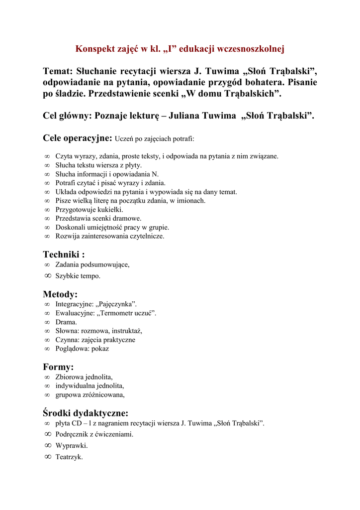 Konspekt zajęć w kl. „I” edukacji wczesnoszkolnej Temat: Słuchanie recytacji wiersza J. Tuwima „Słoń Trąbalski”, odpowiadanie na pytania, opowiadanie przygód bohatera. Pisanie po śladzie. Przedstawienie scenki „W domu Trąbalskich”. Cel główny: Poznaje lekturę – Juliana Tuwima „Słoń Trąbalski”. Cele operacyjne: Uczeń po zajęciach potrafi: • • • • • • • • • • Czyta wyrazy, zdania, proste teksty, i odpowiada na pytania z nim związane. Słucha tekstu wiersza z płyty. Słucha informacji i opowiadania N. Potrafi czytać i pisać wyrazy i zdania. Układa odpowiedzi na pytania i wypowiada się na dany temat. Pisze wielką literę na początku zdania, w imionach. Przygotowuje kukiełki. Przedstawia scenki dramowe. Doskonali umiejętność pracy w grupie. Rozwija zainteresowania czytelnicze. Techniki : • • Zadania podsumowujące, Szybkie tempo. Metody: • • • • • • Integracyjne: „Pajęczynka”. Ewaluacyjne: „Termometr uczuć”. Drama. Słowna: rozmowa, instruktaż, Czynna: zajęcia praktyczne Poglądowa: pokaz Formy: • • • Zbiorowa jednolita, indywidualna jednolita, grupowa zróżnicowana, Środki dydaktyczne: • • • • płyta CD – l z nagraniem recytacji wiersza J. Tuwima „Słoń Trąbalski”. Podręcznik z ćwiczeniami. Wyprawki. Teatrzyk. • • • • Kłębek nici. Kołówki sylabowe. Kukiełki. Szarfy. Przebieg zajęć: 1. Zabawa integracyjna „Pajęczynka”. U. Siedzą w kręgu N. rzuca kłębek podaje nazwę zwierzątka, które jest bohaterem dowolnego wiersza dla dzieci. U. łapią i odpowiadają, rzucając dalej. 2. Wprowadzenie do zajęć. Rozwiązanie kołówki sylabowej. N. informuje ,że początkowa sylaba oznaczona jest drzewkiem, następne trzeba łączyć przeskakują co drugą sylabę zgodnie z kierunkiem strzałki. Odczytują. Zawieszają rozwiązanie na tablicy. Jedna grupa – Julian Tuwim Druga grupa – „Słoń Trąbalski” 3. N. Podaje temat i cele zajęć. 4. Słuchanie nagrania utworu „Słoń Trąbalski”, oglądanie ilustracji, które w trakcie czytania pokazuje N. 5. Rozmowa na temat przygód słonia . Odpowiadanie na pytania dotyczące tekstu. - Kto jest autorem utworu? - Jaki jest tytuł utworu ? - Kto jest jego bohaterem ? - Jaki problem miał bohater wiersza ? 6. Zabawa z szarfami „Supełek na trąbie”. U. stoją w kole, podrzucając związane szarfy. Wykonują to jedną ręką, natomiast łapią drugą. Następnie wykonują to ćwiczenie w parach. 7. Utrwalenie wiadomości o bohaterach lektury. U. piszą imiona po śladzie i dopasowują nalepki z imionami Trąbalskich do ich portretów i wpisanych imion. 8. Przygotowanie (wyciskanie) kukiełki z kart pracy zamieszczonych w „Wyprawce”. 9. Przygotowanie inscenizacji. N. dzieli klasę na grupy, wybierając chętne dzieci . U. przygotowują jedną ze wskazanych scenek: - „Trąbalscy wybierają się do kina” - „Trąbalscy wybierają się na wycieczkę rowerową”. - „Trąbalscy wybierają się na kolację do babci”. 10. U. przedstawiają przygotowane scenki, czynią to z za kurtyny teatrzyku. Zostają nagrodzeni brawami. 11. Podsumowanie zajęć. N. zwraca się do dzieci „Dowiedziałam się, że...”, „Zaskoczyło mnie, że...”.U. kończą zdania , wyciągają wnioski. 12. U. dokonują oceny siebie i innych metodą ewaluacyjną „termometr uczuć”. Dzieci otrzymują arkusz z narysowanym termometrem, na którym zaznaczają swój nastrój, oceniając swoją pracę na zajęciach. Opracowała: Bożena Trzeszczkowska