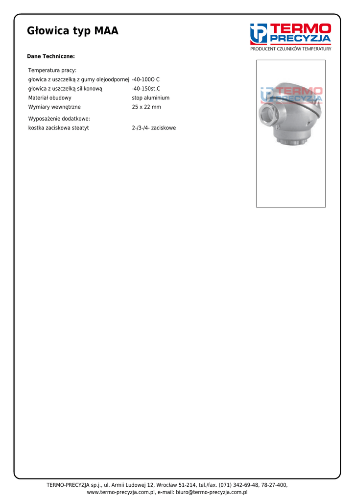 Głowica typ MAA Dane Techniczne: Temperatura pracy: głowica z uszczelką z gumy olejoodpornej -40-100O C głowica z uszczelką silikonową -40-150st.C Materiał obudowy stop aluminium Wymiary wewnętrzne 25 x 22 mm Wyposażenie dodatkowe: kostka zaciskowa steatyt 2-/3-/4- zaciskowe TERMO-PRECYZJA sp.j., ul. Armii Ludowej 12, Wrocław 51-214, tel./fax. (071) 342-69-48, 78-27-400, www.termo-precyzja.com.pl, e-mail: [email protected]