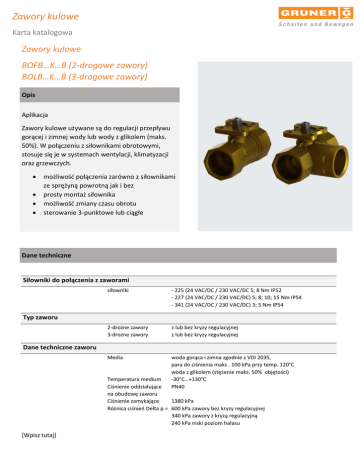Zawory kulowe Karta katalogowa Zawory kulowe BOFB…K…B (2-drogowe zawory) BOLB…K…B (3-drogowe zawory) Opis Aplikacja Zawory kulowe używane są do regulacji przepływu gorącej i zimnej wody lub wody z glikolem (maks. 50%). W połączeniu z siłownikami obrotowymi, stosuje się je w systemach wentylacji, klimatyzacji oraz grzewczych. możliwość połączenia zarówno z siłownikami ze sprężyną powrotną jak i bez prosty montaż siłownika możliwość zmiany czasu obrotu sterowanie 3-punktowe lub ciągłe Dane techniczne Siłowniki do połączenia z zaworami siłowniki - 225 (24 VAC/DC / 230 VAC/DC 5; 8 Nm IP52 - 227 (24 VAC/DC / 230 VAC/DC) 5; 8; 10; 15 Nm IP54 - 341 (24 VAC/DC / 230 VAC/DC) 3; 5 Nm IP54 2-drożne zawory 3-drożne zawory z lub bez kryzy regulacyjnej z lub bez kryzy regulacyjnej Media woda gorąca i zimna zgodnie z VDI 2035, para do ciśnienia maks . 100 kPa przy temp. 120°C woda z glikolem (stężenie maks. 50% objętości) -30°C…+130°C PN40 Typ zaworu Dane techniczne zaworu Temperatura medium Ciśnienie oddziałujące na obudowę zaworu Ciśnienie zamykające 1380 kPa Różnica ciśnień Delta p = 600 kPa zawory bez kryzy regulacyjnej 340 kPa zawory z kryzą regulacyjną 240 kPa niski poziom hałasu [Wpisz tutaj] Zawory kulowe Karta katalogowa Charakterystyka przepływu stałoprocentowa dla zaworaów 2-drogowych stałoprocentowa dla zaworów 3-drogowych liniowa w zaworach 3-drogowych z bajpasem Przeciek Złącza Kąt obrotu Pozycja montażowa <0,01% wartości Kvs, <1% przez bajpas dla powietrza gwint żeński (Rp, ISO 7/1) 0…90° pozioma lub pionowa (w zależności od trzpienia) Materiały, z których zbudowane są zawory Obudowa Kula zaworu Trzpień zaworu Kryza regulacyjna Uszczelka trzpienia zaworu Uszczelka Smarowanie mosiądz stal nierdzewna stal nierdzewna AMODEL AS 1145HS 2 x EPDM O-ring CE Konserwacja PED 97/23/EC nie wymaga Części sprzęgła wkładki łączniki Wymiary Waga patrz tabela patrz tabela PTFE z grafitem oraz EPDM o-ring zgodnie z aprobatą Bezpieczeństwo Części mechaniczne Wymiary / waga [Wpisz tutaj] Zawory kulowe Karta katalogowa Tryb pracy / właściwości Tryb pracy Podłączenie z siłownikiem Wykres ciśnienia od temp. Zawór obsługiwany jest przez siłownik, który go otwiera lub zamyka. Sterowany jest 3punktowo lub sygnałem ciągłym przy czym kula zaworu ustawiana jest w określonej pozycji. Tym samym kula zachowuje się jak dławik. Poprzez zastosowanie kryzy regulacyjnej, uzyskana zostaje stabilność regulacji przepływu. Zawory są przystosowane do pracy z siłownikami wyszególnionymi powyżej w danych technicznych. Montaż bezpośredni Prosty bezpośredni montaż siłownika na zaworze. Napęd przykręcany jest jedną śrubą do wkładki i trzpienia zaworu tworząc jedną całość. Możliwości użycia różnych adapterów pozwala na różne opcje połączenia zaworu z siłownikiem. Podłączenie / wskazówki bezpieczeństwa Kryzy regulacyjne Wskazówki bezpieczeństwa - Zaworów kulowych nie można używać w innych aplikacjach niż wskazane w dokumentacji. Zastosowanie w samolotach jest zabronione. - Mogą być instalowane jedynie przez osoby wyszkolone w tym kierunku. Podczas montażu należy przestrzegać wszystkich regulacji prawnych i wszelkich innych przepisów. - Zawory nie mają żadnych części wymiennych ani naprawialnych. [Wpisz tutaj] - Przy określaniu charakterystyki należy przestrzegać przyjętych przepisów. - Zaworów kulowych nie można pozbywać się jak codziennych śmieci domowych. Należy Zawory kulowe Karta katalogowa Formuła Kvs dla wody ∆pmax = max. dozwolona różnica ciśnień - - - - - ∆pmax = dla pracy cichej (nisko szumowej) ∆pv100 = różnica ciśnienia za zaworem kulowym w pełni otwartym 𝑽̇ = przepływ nominalny przy ∆pv100 [Wpisz tutaj] Zawory kulowe Karta katalogowa 2-drożne zawory 3-drożne zawory [Wpisz tutaj]