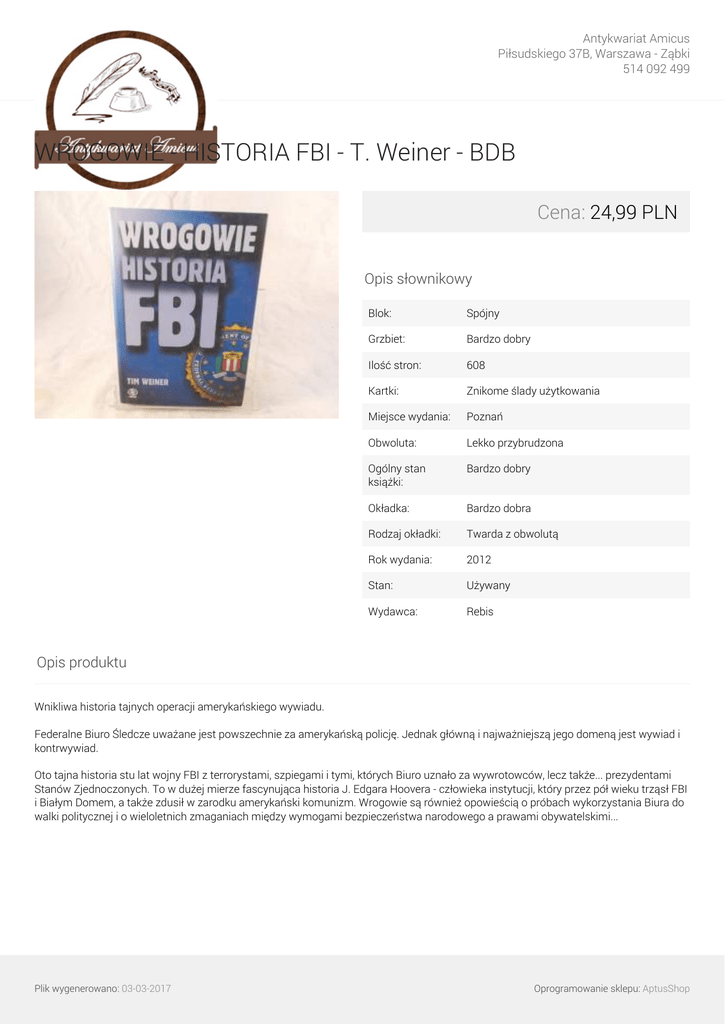 Antykwariat Amicus Piłsudskiego 37B, Warszawa - Ząbki 514 092 499 WROGOWIE - HISTORIA FBI - T. Weiner - BDB Cena: 24,99 PLN Opis słownikowy Blok: Spójny Grzbiet: Bardzo dobry Ilość stron: 608 Kartki: Znikome ślady użytkowania Miejsce wydania: Poznań Obwoluta: Lekko przybrudzona Ogólny stan książki: Bardzo dobry Okładka: Bardzo dobra Rodzaj okładki: Twarda z obwolutą Rok wydania: 2012 Stan: Używany Wydawca: Rebis Opis produktu Wnikliwa historia tajnych operacji amerykańskiego wywiadu. Federalne Biuro Śledcze uważane jest powszechnie za amerykańską policję. Jednak główną i najważniejszą jego domeną jest wywiad i kontrwywiad. Oto tajna historia stu lat wojny FBI z terrorystami, szpiegami i tymi, których Biuro uznało za wywrotowców, lecz także... prezydentami Stanów Zjednoczonych. To w dużej mierze fascynująca historia J. Edgara Hoovera - człowieka instytucji, który przez pół wieku trząsł FBI i Białym Domem, a także zdusił w zarodku amerykański komunizm. Wrogowie są również opowieścią o próbach wykorzystania Biura do walki politycznej i o wieloletnich zmaganiach między wymogami bezpieczeństwa narodowego a prawami obywatelskimi... Plik wygenerowano: 03-03-2017 Oprogramowanie sklepu: AptusShop Antykwariat Amicus Piłsudskiego 37B, Warszawa - Ząbki 514 092 499 Galeria Plik wygenerowano: 03-03-2017 Powered by TCPDF (www.tcpdf.org) Oprogramowanie sklepu: AptusShop