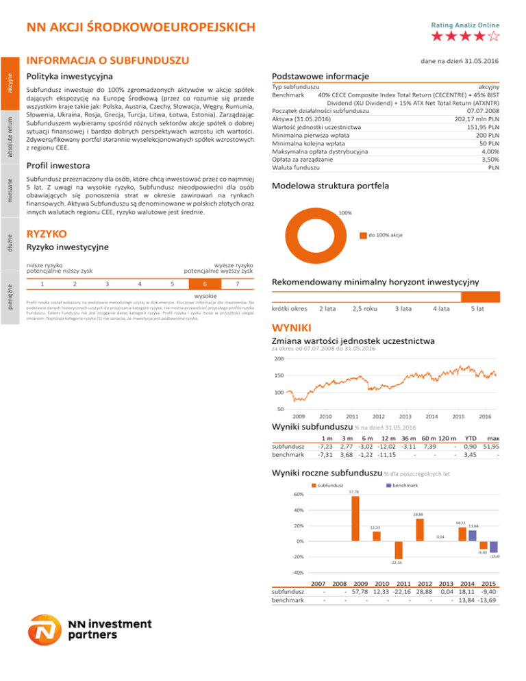 NN AKCJI ŚRODKOWOEUROPEJSKICH absolute return akcyjne INFORMACJA O SUBFUNDUSZU dane na dzień 31.05.2016 Polityka inwestycyjna Podstawowe informacje Subfundusz inwestuje do 100% zgromadzonych aktywów w akcje spółek dających ekspozycję na Europę Środkową (przez co rozumie się przede wszystkim kraje takie jak: Polska, Austria, Czechy, Słowacja, Węgry, Rumunia, Słowenia, Ukraina, Rosja, Grecja, Turcja, Litwa, Łotwa, Estonia). Zarządzając Subfunduszem wybieramy spośród różnych sektorów akcje spółek o dobrej sytuacji finansowej i bardzo dobrych perspektywach wzrostu ich wartości. Zdywersyfikowany portfel starannie wyselekcjonowanych spółek wzrostowych z regionu CEE. akcyjny Typ subfunduszu Benchmark 40% CECE Composite Index Total Return (CECENTRE) + 45% BIST Dividend (XU Dividend) + 15% ATX Net Total Return (ATXNTR) Początek działalności subfunduszu 07.07.2008 Aktywa (31.05.2016) 202,17 mln PLN Wartość jednostki uczestnictwa 151,95 PLN Minimalna pierwsza wpłata 200 PLN Minimalna kolejna wpłata 50 PLN Maksymalna opłata dystrybucyjna 4,00% Opłata za zarządzanie 3,50% Waluta funduszu PLN dłużne mieszane Profil inwestora Subfundusz przeznaczony dla osób, które chcą inwestować przez co najmniej 5 lat. Z uwagi na wysokie ryzyko, Subfundusz nieodpowiedni dla osób obawiających się ponoszenia strat w okresie zawirowań na rynkach finansowych. Aktywa Subfunduszu są denominowane w polskich złotych oraz innych walutach regionu CEE, ryzyko walutowe jest średnie. 100% RYZYKO do 100% akcje Ryzyko inwestycyjne niższe ryzyko potencjalnie niższy zysk pieniężne Modelowa struktura portfela 1 2 wyższe ryzyko potencjalnie wyższy zysk 3 4 5 6 7 Rekomendowany minimalny horyzont inwestycyjny wysokie Profil ryzyka został wskazany na podstawie metodologii użytej w dokumencie: Kluczowe informacje dla inwestorów. Na podstawie danych historycznych użytych do przypisania kategorii ryzyka, nie można przewidzieć przyszłego profilu ryzyka Funduszu. Celem Funduszu nie jest osiąganie danej kategorii ryzyka. Profil ryzyka i zysku może w przyszłości ulegać zmianom. Najniższa kategoria ryzyka (1) nie oznacza, że inwestycja jest pozbawiona ryzyka. krótki okres 2 lata 2,5 roku 3 lata 4 lata 5 lat WYNIKI Zmiana wartości jednostek uczestnictwa za okres od 07.07.2008 do 31.05.2016 200 150 100 50 2009 2010 2011 2012 2013 2014 2015 2016 Wyniki subfunduszu % na dzień 31.05.2016 subfundusz benchmark 1m -7,23 -7,31 3 m 6 m 12 m 36 m 60 m 120 m 2,77 -3,02 -12,02 -3,11 7,39 3,68 -1,22 -11,15 - YTD max 0,90 51,95 3,45 - Wyniki roczne subfunduszu % dla poszczególnych lat subfundusz 60% benchmark 57,78 40% 20% 28,88 18,11 12,33 13,84 0,04 0% -9,40 -20% -13,69 -22,16 -40% subfundusz benchmark 2007 2008 2009 2010 2011 2012 2013 2014 2015 - 57,78 12,33 -22,16 28,88 0,04 18,11 -9,40 - 13,84 -13,69 SKŁAD PORTFELA Alokacja instrumentów finansowych dane na dzień 31.05.2016 nazwa Akcje Gotówka i lokaty skorygowane o saldo należności i zobowiązań udział w portfelu 97,95% 2,05% Otwarte pozycje walutowe dane na dzień 31.05.2016 nazwa TRY PLN EUR CZK HUF inne udział w portfelu 45,71% 23,05% 16,24% 6,21% 6,06% 2,73% wg sprawozdania finansowego z dnia 31.12.2015 nazwa Erste Group Bank AG Akbank T.A.S. Turkiye Garanti Bankasi a.s. Polski Koncern Naftowy ORLEN S.A. Turkiye Is Bankasi a.s. Środki pieniężne Powszechna Kasa Oszczędności Bank Polski S.A. PGE Polska Grupa Energetyczna S.A. Emlak Konut Gayrimenkul Yatirim Ortak a.s. Komercni Banka udział w portfelu 8,36% 4,38% 3,90% 3,88% 3,87% 3,37% 3,33% 3,17% 2,91% 2,59% Alokacja geograficzna dane na dzień 31.05.2016 Alokacja sektorowa dane na dzień 31.05.2016 nazwa Finanse Energia Surowce Spółki użyteczności publicznej Nieruchomości Spółki przemysłowe Telekomunikacja Dobra codziennego użytku Spółki konsumenckie Budownictwo inne Największe pozycje w portfelu udział w portfelu 48,04% 9,37% 9,26% 6,12% 5,26% 5,15% 4,61% 4,52% 2,06% 2,02% 3,59% nazwa Turcja Polska Austria Czechy Węgry Rumunia Grecja Holandia Jersey Litwa udział w portfelu 45,77% 23,00% 14,12% 6,71% 6,01% 2,62% 0,59% 0,52% 0,51% 0,15% ZARZĄDZAJĄCY FUNDUSZEM Michał Kopiczyński Dyrektor Zespołu Zespół Zarządzania Instrumentami Udziałowymi 20 lat w branży Marcin Szortyka Starszy Zarządzający Funduszami Zespół Zarządzania Instrumentami Udziałowymi 11 lat w branży SŁOWNIK Odchylenie standardowe to jedna z bardziej popularnych miar statystycznych, pokazująca jak bardzo całkowite zyski funduszu zmieniały się w przeszłości. Im wyższe odchylenie standardowe, tym wyższe ryzyko towarzyszące inwestycji w jednostkę funduszu. R², czyli kwadrat współczynnika korelacji liniowej Pearsona, to jedna z bardziej popularnych miar statystycznych, pokazująca stopień dopasowania serii danych do wzorca. Wskaźnik Sharpe’a opisuje jak dobrze osiągnięta stopa zwrotu wynagradza inwestora za podjęte przez niego ryzyko inwestowania w walory ryzykowne. Parametr umożliwia jednoczesną maksymalizację zysku oraz minimalizację ryzyka, co można osiągnąć przez wybór funduszu o największej dodatniej wartości wskaźnika. Alfa to miara wskazująca możliwość i skalę zmiany ceny badanego instrumentu przy założeniu, że wartość benchmarku nie ulega zmianie. Alfa może przyjmować zarówno wartości dodatnie, ale również wartości ujemne. Beta to miara wskazująca wrażliwość zmiany ceny badanego instrumentu w porównaniu ze zmianą benchmarku. Wskaźnik równy 1 oznacza, że spodziewany 10% wzrost wartości wzorca przełoży się na 10% wzrost wartości badanego instrumentu (wartości jednostki w przypadku funduszy). Im wyższą wartość przyjmuje wskaźnik beta, tym bardziej ryzykowna jest rozpatrywana inwestycja. Tracking Error pozwala dokonać oceny zgodności efektów prowadzonej przez zarządzającego polityki inwestycyjnej z wynikami osiąganymi przez benchmark. Im mniejsza jest wartość wskaźnika TE tym ewentualne powsta