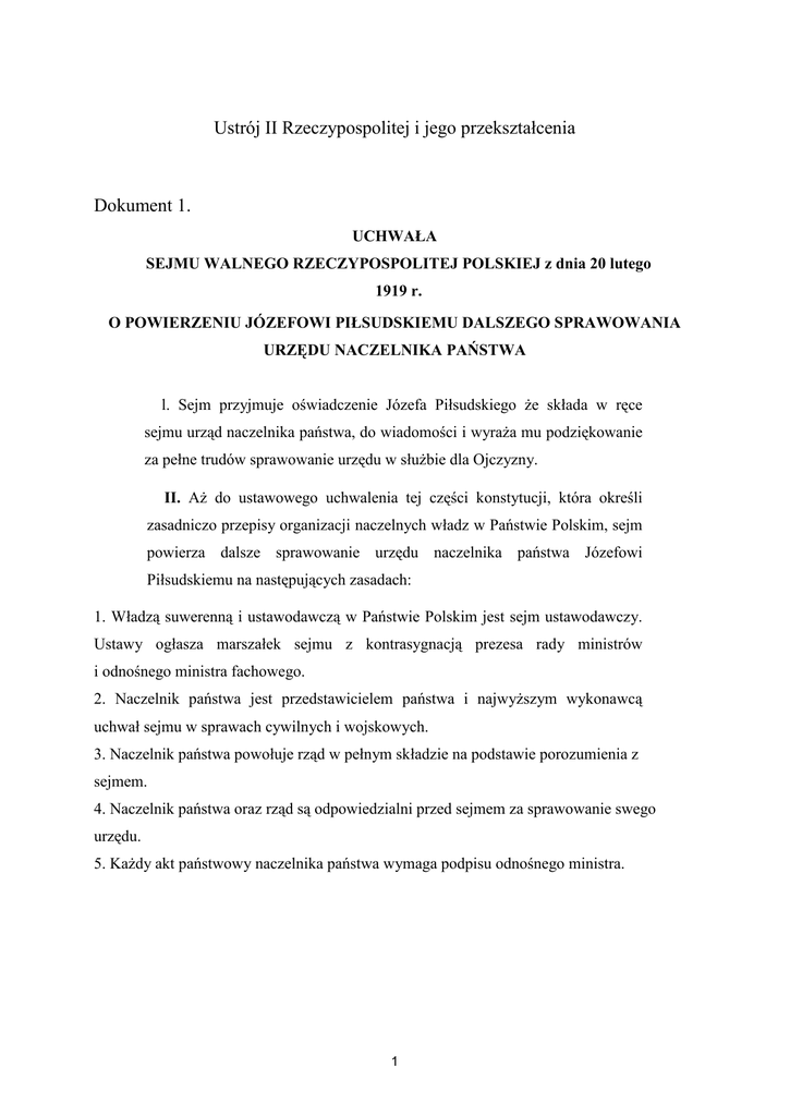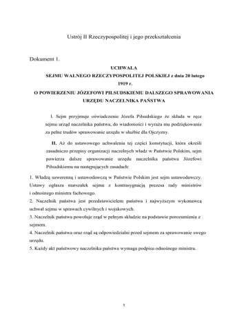 Ustrój II Rzeczypospolitej i jego przekształcenia Dokument 1. UCHWAŁA SEJMU WALNEGO RZECZYPOSPOLITEJ POLSKIEJ z dnia 20 lutego 1919 r. O POWIERZENIU JÓZEFOWI PIŁSUDSKIEMU DALSZEGO SPRAWOWANIA URZĘDU NACZELNIKA PAŃSTWA l. Sejm przyjmuje oświadczenie Józefa Piłsudskiego że składa w ręce sejmu urząd naczelnika państwa, do wiadomości i wyraża mu podziękowanie za pełne trudów sprawowanie urzędu w służbie dla Ojczyzny. II. Aż do ustawowego uchwalenia tej części konstytucji, która określi zasadniczo przepisy organizacji naczelnych władz w Państwie Polskim, sejm powierza dalsze sprawowanie urzędu naczelnika państwa Józefowi Piłsudskiemu na następujących zasadach: 1. Władzą suwerenną i ustawodawczą w Państwie Polskim jest sejm ustawodawczy. Ustawy ogłasza marszałek sejmu z kontrasygnacją prezesa rady ministrów i odnośnego ministra fachowego. 2. Naczelnik państwa jest przedstawicielem państwa i najwyższym wykonawcą uchwał sejmu w sprawach cywilnych i wojskowych. 3. Naczelnik państwa powołuje rząd w pełnym składzie na podstawie porozumienia z sejmem. 4. Naczelnik państwa oraz rząd są odpowiedzialni przed sejmem za sprawowanie swego urzędu. 5. Każdy akt państwowy naczelnika państwa wymaga podpisu odnośnego ministra. 1 Dokument 2. Konstytucja Rzeczypospolitej Polskiej z 17 marca 1921 r. W imię Boga Wszechmogącego! My, Naród Polski, dziękując Opatrzności za wyzwolenie nas z półtorawiekowej niewoli, wspominając z wdzięcznością męstwo i wytrwałość ofiarnej walki pokoleń, które najlepsze wysiłki swoje sprawie niepodległości bez przerwy poświęcały, nawiązując do świetnej tradycji wiekopomnej Konstytucji 3-go Maja - dobro całej, zjednoczonej i niepodległej Matki-Ojczyzny mając na oku, a pragnąc jej byt niepodległy, potęgę i bezpieczeństwo oraz ład społeczny utwierdzić na wiekuistych zasadach prawa i wolności, pragnąc zarazem zapewnić rozwój wszystkich jej sił moralnych i materialnych dla dobra całej odradzającej się ludzkości, wszystkim obywatelom Rzeczypospolitej równość, a pracy poszanowanie, należne prawa i szczególną opiekę Państwa zabezpieczyć - tę oto Ustawę Konstytucyjną na Sejmie Ustawodawczym Rzeczypospolitej Polskiej uchwalamy i stanowimy. Rozdział l. Rzeczpospolita (...) Art. 2. Władza zwierzchnia w Rzeczypospolitej Polskiej należy do narodu. Organami narodu w zakresie ustawodawstwa są Sejm i Senat, w zakresie władzy wykonawczej Prezydent Rzeczypospolitej łącznie z odpowiedzialnymi ministrami, w zakresie wymiaru sprawiedliwości - niezawisłe Sądy. (...) Rozdział II. Władza ustawodawcza (...) Art. 3. Zakres ustawodawstwa państwowego obejmuje stanowienie wszelkich praw publicznych i prywatnych i sposobu ich wykonania. Nie ma ustawy bez zgody Sejmu, wyrażonej w sposób regulaminowo ustalony. Ustawa uchwalona przez Sejm zyskuje moc obowiązującą w czasie przez nią samą określonym. Rzeczpospolita Polska, opierając swój ustrój na zasadzie szerokiego samorządu terytorialnego, przekaże przedstawicielstwom tego samorządu właściwy zakres ustawodawstwa, zwłaszcza z dziedziny administracji, kultury i gospodarstwa, który zostanie bliżej określony ustawami państwowymi. (...) 2 Art. 10. Prawo inicjatywy ustawodawczej przysługuje Rządowi i Sejmowi. Wnioski i projekty ustaw, pociągające za sobą wydatki ze Skarbu Państwa, muszą podawać sposób ich zużycia i pokrycia. Art. 11. Sejm składa się z posłów, wybranych na lat pięć, licząc od dnia otwarcia Sejmu, w głosowaniu powszechnym, tajnym, bezpośrednim, równym i stosunkowym. Art. 12. Prawo wybierania ma każdy obywatel polski bez różnicy płci, który w dniu ogłoszenia wyborów ukończył lat 21, używa w pełni praw cywilnych i zamieszkuje w okręgu wyborczym przynajmniej od przedednia ogłoszenia wyborów w Dzienniku Ustaw. Prawo głosowania może być wykonywane tylko osobiście. Wojskowi w służbie czynnej nie mają prawa głosowania. Art. 13. Prawo wybieralności ma każdy obywatel, mający prawo wybierania do Sejmu, nie wyjmując wojskowych w służbie czynnej, niezależnie od miejsca zamieszkania, o ile ukończył lat 25. Art. 14. Nie mogą korzystać z prawa wyborczego obywatele skazani za przestępstwa, które określi ordynacja wyborcza, jako pociągające za sobą czasową lub stałą utratę prawa wybierania, wybieralności, a także piastowania mandatu poselskiego. Art. 15. Państwowi urzędnicy administracyjni, skarbowi i sądowi nie mogą być wybierani w tych okręgach, w których pełnią swą służbę. Przepis ten dotyczy urzędników pełniących swą służbę przy władzach centralnych. (...) Art. 21. Posłowie nie mogą być pociągani do odpowiedzialności za swoją działalność w Sejmie, lub poza Sejmem, wchodzącą w zakres wykonywania mandatu poselskiego, ani w czasie trwania mandatu, ani po jego wygaśnięciu. Za przemówienia i odezwania się, tudzież manifestacje w Sejmie posłowie odpowiadają tylko przed Sejmem. Za naruszenie prawa osoby trzeciej mogą być pociągnięci do odpowiedzialności sądowej, o ile władza sądowa uzyska na to zezwolenie Sejmu. Postępowanie karno-sądowe, karno-administracyjne lub dyscyplinarne, wdrożone przeciw posłowi przed uzyskaniem mandatu poselskiego, ulegnie na żądanie Sejmu zawieszeniu aż do wygaśnięcia mandatu. (...) Art. 26. Sejm może się rozwiązać mocą własnej uchwały, powziętej większością 2/3 głosów, przy obecności połowy ustawowej liczby posłów. Prezydent Rzeczypospolitej może rozwiązać Sejm za zgodą 3/5 ustawowej liczby członków Senatu. Równocześnie w obu wypadkach z samego prawa rozwiązuje się Senat. Wybory odbędą się w ciągu 90 dni od dnia rozwiązania; termin ich będzie oznaczony bądź w uchwale Sejmu, 3 bądź w orędziu Prezydenta o rozwiązaniu Sejmu. (...) Art. 32. Do prawomocności uchwał potrzebna jest zwykła większość głosów, przy obecności przynajmniej 1/3 