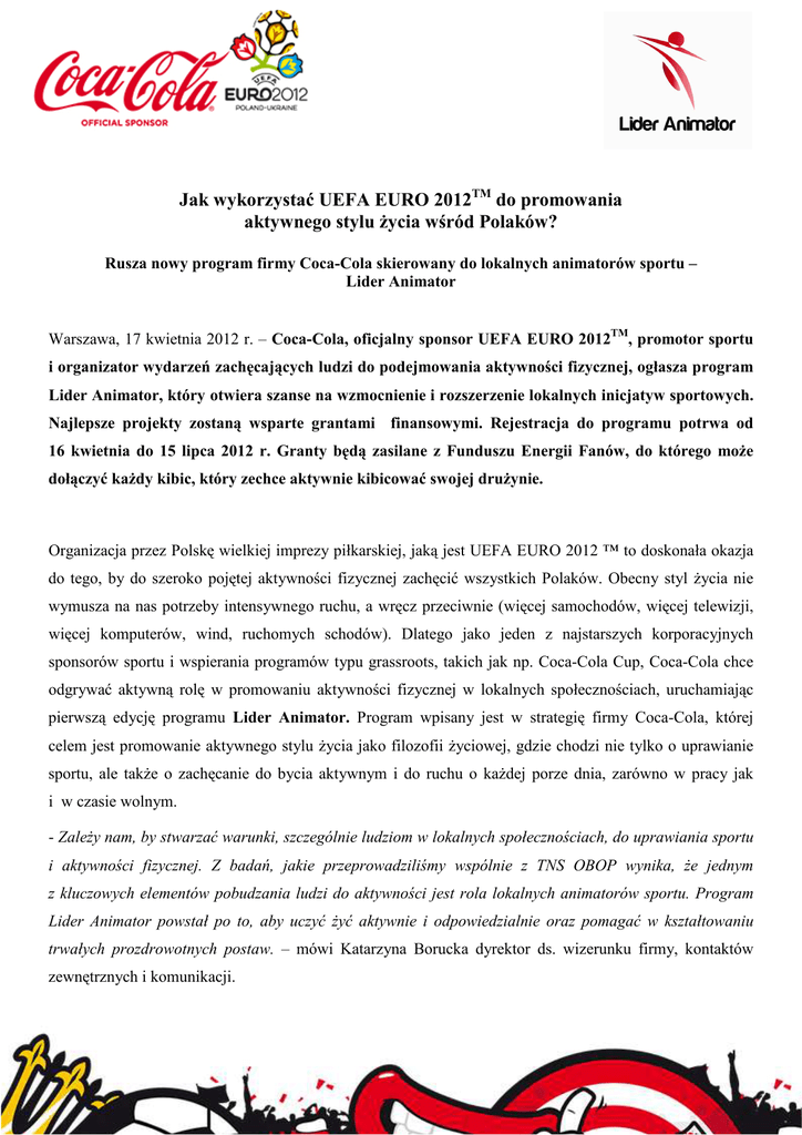 Jak wykorzystać UEFA EURO 2012TM do promowania aktywnego stylu Ŝycia wśród Polaków? Rusza nowy program firmy Coca-Cola skierowany do lokalnych animatorów sportu – Lider Animator Warszawa, 17 kwietnia 2012 r. – Coca-Cola, oficjalny sponsor UEFA EURO 2012TM, promotor sportu i organizator wydarzeń zachęcających ludzi do podejmowania aktywności fizycznej, ogłasza program Lider Animator, który otwiera szanse na wzmocnienie i rozszerzenie lokalnych inicjatyw sportowych. Najlepsze projekty zostaną wsparte grantami finansowymi. Rejestracja do programu potrwa od 16 kwietnia do 15 lipca 2012 r. Granty będą zasilane z Funduszu Energii Fanów, do którego moŜe dołączyć kaŜdy kibic, który zechce aktywnie kibicować swojej druŜynie. Organizacja przez Polskę wielkiej imprezy piłkarskiej, jaką jest UEFA EURO 2012 ™ to doskonała okazja do tego, by do szeroko pojętej aktywności fizycznej zachęcić wszystkich Polaków. Obecny styl Ŝycia nie wymusza na nas potrzeby intensywnego ruchu, a wręcz przeciwnie (więcej samochodów, więcej telewizji, więcej komputerów, wind, ruchomych schodów). Dlatego jako jeden z najstarszych korporacyjnych sponsorów sportu i wspierania programów typu grassroots, takich jak np. Coca-Cola Cup, Coca-Cola chce odgrywać aktywną rolę w promowaniu aktywności fizycznej w lokalnych społecznościach, uruchamiając pierwszą edycję programu Lider Animator. Program wpisany jest w strategię firmy Coca-Cola, której celem jest promowanie aktywnego stylu Ŝycia jako filozofii Ŝyciowej, gdzie chodzi nie tylko o uprawianie sportu, ale takŜe o zachęcanie do bycia aktywnym i do ruchu o kaŜdej porze dnia, zarówno w pracy jak i w czasie wolnym. - ZaleŜy nam, by stwarzać warunki, szczególnie ludziom w lokalnych społecznościach, do uprawiania sportu i aktywności fizycznej. Z badań, jakie przeprowadziliśmy wspólnie z TNS OBOP wynika, Ŝe jednym z kluczowych elementów pobudzania ludzi do aktywności jest rola lokalnych animatorów sportu. Program Lider Animator powstał po to, aby uczyć Ŝyć aktywnie i odpowiedzialnie oraz pomagać w kształtowaniu trwałych prozdrowotnych postaw. – mówi Katarzyna Borucka dyrektor ds. wizerunku firmy, kontaktów zewnętrznych i komunikacji. Program Lider Animator skierowany jest do jednostek samorządu terytorialnego i instytucji oświatowych, ale przede wszystkim do lokalnych animatorów organizujących róŜnego rodzaju zajęcia rekreacyjne, programy szkolne i imprezy sportowe oparte na aktywności fizycznej. Program Lider Animator nagradzać będzie najciekawsze projekty, które mają na celu zachęcać lokalne społeczności do aktywnego Ŝycia. WyróŜnione projekty zostaną uhonorowane grantami przeznaczonymi na realizację nowych projektów oraz na rozszerzenie lub kontynuowanie dotychczasowej działalności. Wysokość grantów, od 10 000 PLN do 15 000 PLN będzie zaleŜała od ilości energii zebranej w Funduszu Energii Fanów, który Coca-Cola uruchomii w ramach swojej kampanii na czas Mistrzostw Europy w Piłce NoŜnej. Program oferować będzie takŜe szkolenia, które wzbogacą wiedzę animatorów oraz wyposaŜą ich w narzędzia ułatwiające realizację podejmowanych przez nich na co dzień działań. Pierwsze 50 osób, które zgłosi się do programu otrzyma moŜliwość uczestniczenia w całodniowej sesji szkoleniowej. Autorzy najlepszych 15 projektów, wybranych przez jury programu, zostaną zaproszeni do Akademii Lidera. Akademia Lidera to okazja do wymiany doświadczeń z innymi osobami, którzy realizują w swoich miejscowościach projekty oparte o sport i aktywność fizyczną, oraz miejsce, gdzie wybrani animatorzy sportu będę mogli dalej pogłębiać swoją wiedzę, uczestnicząc w specjalnie przygotowanych szkoleniach. Akademia będzie takŜe miejscem, gdzie najlepsza 15-tka animatorów osobiście, przed komisją konkursową, zaprezentuje swoje pomysły. - Mamy nadzieję, Ŝe program Lider Animator zwiększy świadomość potrzeby podejmowania działań na rzecz aktywności fizycznej i zdrowia. Wierzymy, Ŝe program zaowocuje nowatorskimi pomysłami wartymi szerokiego rozpowszechniania, promowania i wsparcia – dodaje Katarzyna Borucka. Więcej informacji o programie moŜna znaleźć na www.lideranimator.pl Partnerem programu Lider Animator jest Szkolny Związek Sportowy, a jego patronem Ministerstwo Sportu i Turystyki. Partnerami mediowymi projektu są: Gazeta Wyborcza oraz portale sport.pl i gazeta.pl. O FUNDUSZU ENERGII FANÓW: Fundusz Energii Fanów to kolejny innowacyjny element kampanii Coca-Cola na UEFA EURO 2012TM, który ma na celu zgromadzenie pozytywnej energii, uwalnianej przez fanów piłki noŜnej podczas kibicowania ich ulubionej druŜynie, poprzez śpiew, taniec i ruch, w trakcie meczów UEFA EURO 2012™. Jako jeden z głównych sponsorów UEFA EURO 2012TM, marka chce zachęcać ludzi do pozytywnego kibicowania oraz do uwolnienia piłkarskich emocji podczas wielkiego święta futbolu, dzięki czemu będą mogli wesprzeć lokalne inicjatywy na rzecz promowania aktywności fizycznej. Fundusz Energii Fanów będzie gromadził energię kibiców przez cały czas trwania UEFA EURO 2012TM. Po zakończeniu Mistrzostw zgromadzona energia zostanie zamieniona na wsparcie finansowe dla programu Lider-Animator, skierowanego do lokalnych animatorów sportu, na co dzień promujących aktywność fizyczną w swoich społecznościach. O ZAANGAśOWANIU COCA-COLA W FUTBOL: Firmy z systemu Coca-Cola są związane z piłką noŜną od ponad 80 lat, a dokładniej od Mistrzostw Świata FIFA w Urugwaju w 1930 r. CocaCola jest najstarszym partnerem korporacyjnym FIFA, z którą współpracuje od 1978r. Od 1988 roku Coca-Cola współpracuje teŜ z UEFA jako Oficjalny Sponsor Mistrzostw Europy. Coca-Cola angaŜuje się w futbol na kaŜdym poziomie - sponsoruje największe imprezy piłkarskie, jak Mistrzostwa Świata czy UEFA EUROTM, ale teŜ realizuje w ponad 100 krajach liczne turni