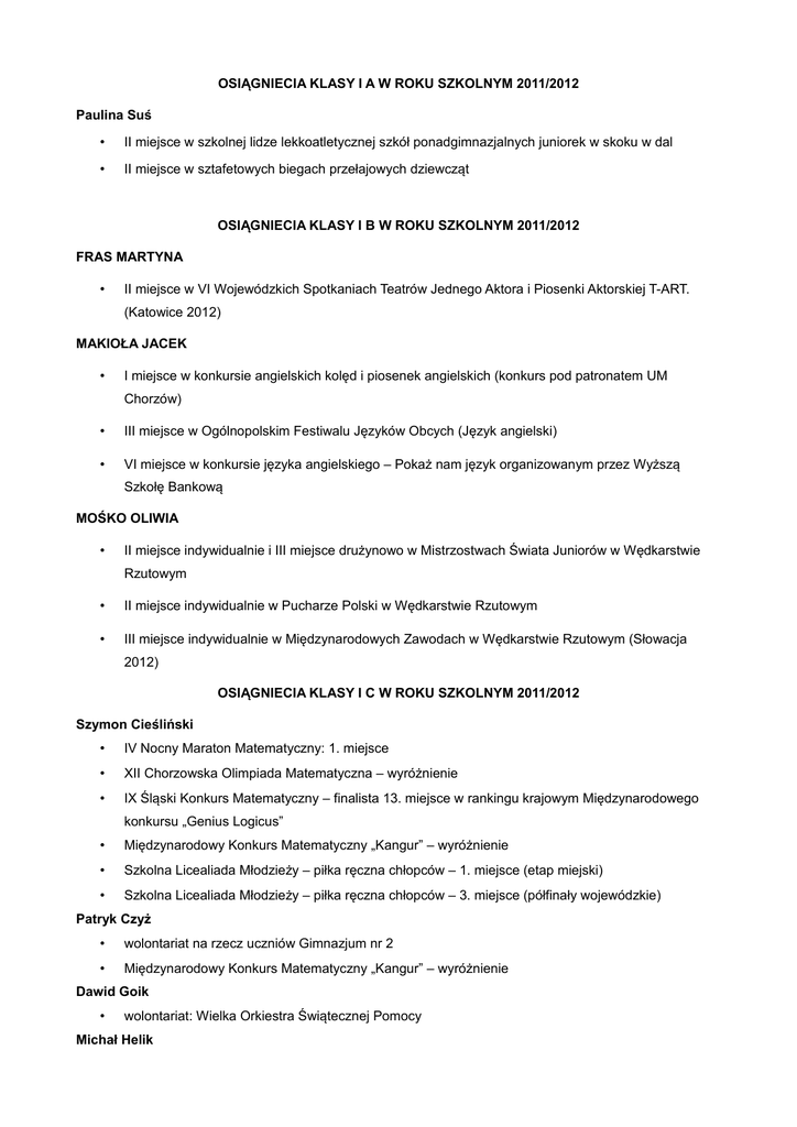OSIĄGNIECIA KLASY I A W ROKU SZKOLNYM 2011/2012 Paulina Suś • II miejsce w szkolnej lidze lekkoatletycznej szkół ponadgimnazjalnych juniorek w skoku w dal • II miejsce w sztafetowych biegach przełajowych dziewcząt OSIĄGNIECIA KLASY I B W ROKU SZKOLNYM 2011/2012 FRAS MARTYNA • II miejsce w VI Wojewódzkich Spotkaniach Teatrów Jednego Aktora i Piosenki Aktorskiej T-ART. (Katowice 2012) MAKIOŁA JACEK • I miejsce w konkursie angielskich kolęd i piosenek angielskich (konkurs pod patronatem UM Chorzów) • III miejsce w Ogólnopolskim Festiwalu Języków Obcych (Język angielski) • VI miejsce w konkursie języka angielskiego – Pokaż nam język organizowanym przez Wyższą Szkołę Bankową MOŚKO OLIWIA • II miejsce indywidualnie i III miejsce drużynowo w Mistrzostwach Świata Juniorów w Wędkarstwie Rzutowym • II miejsce indywidualnie w Pucharze Polski w Wędkarstwie Rzutowym • III miejsce indywidualnie w Międzynarodowych Zawodach w Wędkarstwie Rzutowym (Słowacja 2012) OSIĄGNIECIA KLASY I C W ROKU SZKOLNYM 2011/2012 Szymon Cieśliński • IV Nocny Maraton Matematyczny: 1. miejsce • XII Chorzowska Olimpiada Matematyczna – wyróżnienie • IX Śląski Konkurs Matematyczny – finalista 13. miejsce w rankingu krajowym Międzynarodowego konkursu „Genius Logicus” • Międzynarodowy Konkurs Matematyczny „Kangur” – wyróżnienie • Szkolna Licealiada Młodzieży – piłka ręczna chłopców – 1. miejsce (etap miejski) • Szkolna Licealiada Młodzieży – piłka ręczna chłopców – 3. miejsce (półfinały wojewódzkie) Patryk Czyż • wolontariat na rzecz uczniów Gimnazjum nr 2 • Międzynarodowy Konkurs Matematyczny „Kangur” – wyróżnienie Dawid Goik • wolontariat: Wielka Orkiestra Świątecznej Pomocy Michał Helik • wolontariat: Wielka Orkiestra Świątecznej Pomocy • członek Młodej Ekstraklasy Ruchu Chorzów Piotr Janiak • Szkolna Licealiada Młodzieży – piłka ręczna chłopców – 1. miejsce (etap miejski) • Szkolna Licealiada Młodzieży – piłka ręczna chłopców – 3. miejsce (półfinały wojewódzkie) • Mistrzostwo Śląska w Piłce Ręcznej Chłopców w kategorii Junior Młodszy Łukasz Kokot • Szkolna Licealiada Młodzieży – piłka ręczna chłopców – 1. miejsce (etap miejski) • Szkolna Licealiada Młodzieży – lekkoatletyka – drużynowo 1. miejsce (etap rejonowy) • 2. miejsce drużynowo w zawodach miejskich tenisa stołowego Martyna Korzeniec • wolontariat: Wielka Orkiestra Świątecznej Pomocy Wojciech Krawczyk • wygrana turnieju Mikołajkowego w Piłce Nożnej (III LO) Ryszard Kukulski • 1. miejsce w Szachowej Lidze Szkół o Puchar Prezydenta Miasta Chorzów Monika Masternak • wolontariat: Wielka Orkiestra Świątecznej Pomocy Dawid Mięsopust • Szkolna Licealiada Młodzieży – piłka ręczna chłopców – 1. miejsce (etap miejski) • Szkolna Licealiada Młodzieży – piłka ręczna chłopców – 3. miejsce (półfinały wojewódzkie) • Mistrzostwo Śląska w Piłce Ręcznej Chłopców w kategorii Junior Młodszy • 2. miejsce w drużynowych zawodach tenisa stołowego w Chorzowie na szczeblu miejskim oraz miejsce 5. na szczeblu rejonowym • wygrana turnieju Mikołajkowego w Piłce Nożnej (III LO) Łukasz Olek • wolontariat: Wielka Orkiestra Świątecznej Pomocy • XII Chorzowska Olimpiada Matematyczna – wyróżnienie • Międzynarodowy Konkurs Matematyczny „Kangur” – wyróżnienie • Szkolna Licealiada Młodzieży – piłka ręczna chłopców – 1. miejsce (etap miejski) • Szkolna Licealiada Młodzieży – piłka ręczna chłopców – 3. miejsce (półfinały wojewódzkie) Mariusz Ozdoba • wolontariat: Wielka Orkiestra Świątecznej Pomocy Lilianna Piec • 2. miejsce w Wojewódzkim Konkursie Poetycko-Recytatorskim „W kręgu poezji lagrowej więźniarek obozu KL Ravensbrück” Aleksander Serafin • Szkolna Licealiada Młodzieży – bieg na 100 metrów – 1. miejsce (etap rejonowy) • Szkolna Licealiada Młodzieży – sztafeta 4x100 metrów – 1. miejsce (etap rejonowy) • Szkolna Licealiada Młodzieży – piłka ręczna chłopców – 3. miejsce (półfinały wojewódzkie) Tomasz Skoczewski • Szkolna Licealiada Młodzieży – piłka ręczna chłopców – 1. miejsce (etap miejski) • Szkolna Licealiada Młodzieży – piłka ręczna chłopców – 3. miejsce (półfinały wojewódzkie) • Mistrzostwo Śląska w Piłce Ręcznej Chłopców w kategorii Junior Młodszy wygrana turnieju Mikołajkowego w Piłce Nożnej (III LO) Artur Rajwa • wolontariat: Wielka Orkiestra Świątecznej Pomocy Maciej Urbańczyk • członek Młodej Ekstraklasy piłki nożnej Karolina Żuk • wolontariat: Wielka Orkiestra Świątecznej Pomocy Osiągnięcia klasy II A w roku szkolnym 2011/12 Sebastian Bodzioch • I mc w powiecie w Ogólnopolskim Konkursie Języka Angielskiego FOX organizowanym przez Śląskie Stowarzyszenie Delta, • I mc w konkursie języka angielskiego „Reading broadens your mind”, organizowanym przez II L.O. Ligonia w Chorzowie, • II etap konkursu z języka angielskiego „Pokaż nam język”, organizowanego przez WSB w Chorzowie, Anna Bula • II etap Ogólnopolskiego Konkursu Biblijnego (etap diecezjalny) Monika Dawidziuk • Wyróżnienie w Wojewódzkim Konkursie Historycznym „Państwo stanu wyjątkowego, lata 19811984” Aleksander Górka • II etap Olimpiady Wiedzy o Współczesnym Państwie Katarzyna Wawro • II etap Olimpiady Wiedzy o Współczesnym Państwie Adam Łazowski • I mc w Drużynowym Turnieju Szachowym o Puchar Prezydenta Chorzowa. Agata Kramorz • II etap konkursu z języka niemieckiego „Pokaż nam język”, organizowanego przez WSB w Chorzowie.