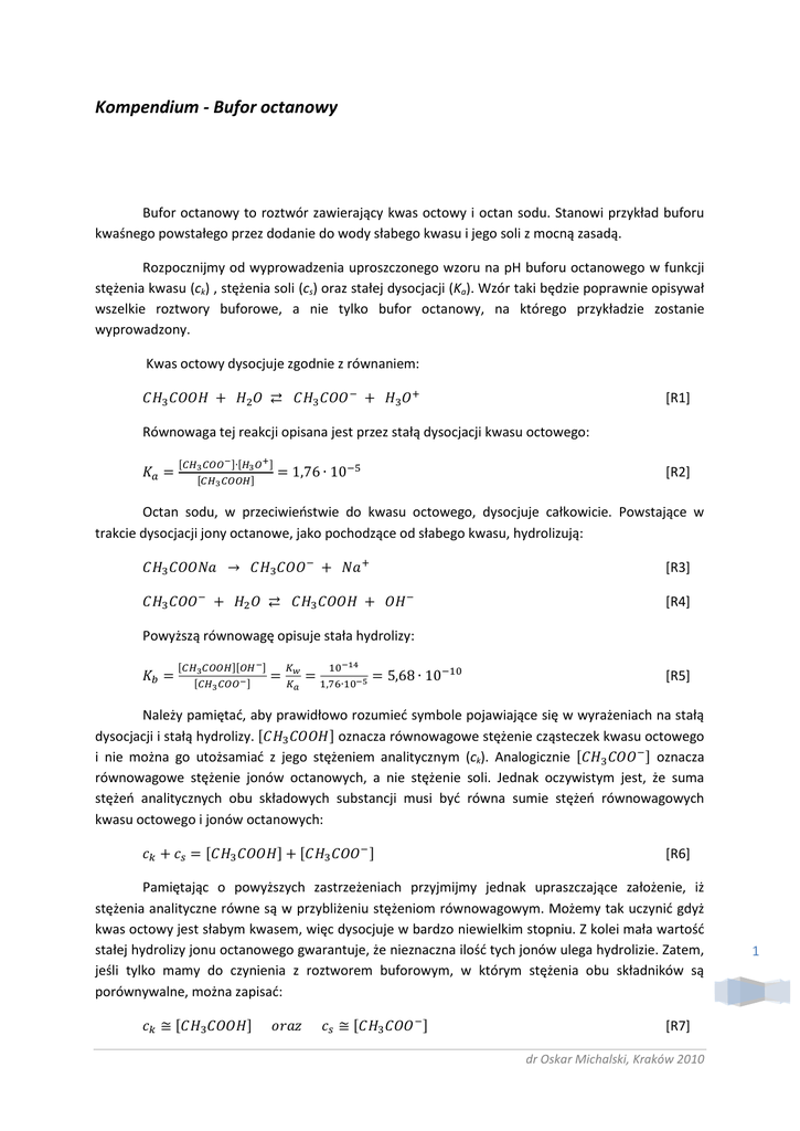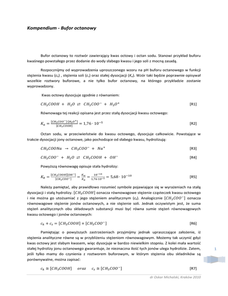 Kompendium - Bufor octanowy Bufor octanowy to roztwór zawierający kwas octowy i octan sodu. Stanowi przykład buforu kwaśnego powstałego przez dodanie do wody słabego kwasu i jego soli z mocną zasadą. Rozpocznijmy od wyprowadzenia uproszczonego wzoru na pH buforu octanowego w funkcji stężenia kwasu (ck) , stężenia soli (cs) oraz stałej dysocjacji (Ka). Wzór taki będzie poprawnie opisywał wszelkie roztwory buforowe, a nie tylko bufor octanowy, na którego przykładzie zostanie wyprowadzony. Kwas octowy dysocjuje zgodnie z równaniem: [R1] Równowaga tej reakcji opisana jest przez stałą dysocjacji kwasu octowego: [R2] Octan sodu, w przeciwieństwie do kwasu octowego, dysocjuje całkowicie. Powstające w trakcie dysocjacji jony octanowe, jako pochodzące od słabego kwasu, hydrolizują: [R3] [R4] Powyższą równowagę opisuje stała hydrolizy: [R5] Należy pamiętać, aby prawidłowo rozumieć symbole pojawiające się w wyrażeniach na stałą dysocjacji i stałą hydrolizy. oznacza równowagowe stężenie cząsteczek kwasu octowego i nie można go utożsamiać z jego stężeniem analitycznym (ck). Analogicznie oznacza równowagowe stężenie jonów octanowych, a nie stężenie soli. Jednak oczywistym jest, że suma stężeń analitycznych obu składowych substancji musi być równa sumie stężeń równowagowych kwasu octowego i jonów octanowych: [R6] Pamiętając o powyższych zastrzeżeniach przyjmijmy jednak upraszczające założenie, iż stężenia analityczne równe są w przybliżeniu stężeniom równowagowym. Możemy tak uczynić gdyż kwas octowy jest słabym kwasem, więc dysocjuje w bardzo niewielkim stopniu. Z kolei mała wartość stałej hydrolizy jonu octanowego gwarantuje, że nieznaczna ilość tych jonów ulega hydrolizie. Zatem, jeśli tylko mamy do czynienia z roztworem buforowym, w którym stężenia obu składników są porównywalne, można zapisać: [R7] dr Oskar Michalski, Kraków 2010 1 Możemy teraz podstawić powyższe wielkości do równania [R2] otrzymując: [R8] Kolejne matematyczne przekształcenia: przekształcenie ze względu na stężenie jonów hydroniowych, następnie obustronne zlogarytmowanie i pomnożenie przez -1 prowadzą do wyrażenia na pH kwasowego roztworu buforowego. [R9] [R10] [R11] Powyższy wzór można uogólnić, aby opisywał również bufory zasadowe: [R12] Korzystając z powyższego wzoru należy pamiętać o jego ograniczeniach i nie stosować w przypadkach: a) bardzo rozcieńczonych roztworów buforowych, gdy nie można pomijać autodysocjacji wody b) roztworów buforowych o bardzo dużej różnicy stężeń dwu jego składników Aby obliczyć pH roztworu buforowego o stężeniach składników spoza zakresu stosowalności wzoru R12 należy rozwiązać równanie trzeciego stopnia dające poprawne wyniki dla dowolnych, rzeczywistych stężeń: [R13] Porównajmy przewidywania obu wzorów w przypadku buforów bardzo rozcieńczonych, ale mających równe stężenia obu składników. Zgodnie ze wzorem R12 pH buforu zależy od stosunku stężeń obu składników, zatem przy rozcieńczaniu buforu pH się nie zmienia, gdyż wtedy stężenia składników buforu maleją w tym samym stopniu. Rysunek 1 przedstawia pH buforu octanowego wyliczone ze wzorów R12 (pH przybliżone) i R13 (pH dokładne). Jak widać, przybliżony wzór R12 daje poprawne wartości pH dla roztworów buforowych o stężeniu powyżej 0,001 mol/dm3. W praktyce laboratoryjnej nigdy nie stosuje się roztworów buforowych o tak małym stężeniu, zatem z powodzeniem można ograniczyć się do stosowania uproszczonego wzoru R12. Rysunek 2 przedstawia zależność pH buforu octanowego od stężenia octanu sodu przy stałym stężeniu kwasu octowego (0,1 mol/dm3). Graniczne stężenie octanu sodu, poniżej którego przewidywania uproszczonego wzoru R12 stają się błędne, w tym przypadku wynosi ok. 0,005 mol/dm3, czyli jest 20-krotnie niższe od stężenia kwasu octowego. dr Oskar Michalski, Kraków 2010 2 Rysunek 1. Porównanie pH roztworu buforu octanowego (o równych stężeniach obu składników) wyliczonego na podstawie wzorów R13 (pH dokładne) i R12 (pH przybliżone). Zielona strzałka – zakres stężeń, w którym można stosować uproszczony wzór R12. Rysunek 2. Porównanie pH roztworu buforu octanowego (o stałym stężeniu kwasu octowego) wyliczonego na podstawie wzorów R13 (pH dokładne) i R12 (pH przybliżone). Zielona strzałka – zakres stężeń octanu sodu, w którym można stosować uproszczony wzór R12. dr Oskar Michalski, Kraków 2010 3 Na kolejnym, trzecim rysunku widzimy zależność pH buforu octanowego od stężenia kwasu octowego przy stałym stężeniu octanu sodu (0,1 mol/dm3). Tym razem uproszczony wzór R12 można stosować tylko dla roztworów o stężeniu kwasu octowego powyżej ok. 0,00001 mol/dm3, czyli 10000 razy niższego od stężenia octanu sodu. Rysunek 3. Porównanie pH roztworu buforu octanowego (o stałym stężeniu octanu sodu) wyliczonego na podstawie wzorów R13 (pH dokładne) i R12 (pH przybliżone). Zielona strzałka – zakres stężeń kwasu octowego, w którym można stosować uproszczony wzór R12. Podsumowując stwierdzamy, że wzór R12 można stosować, gdy stężenie octanu sodu (cs) mieści się w przedziale od 0,05 ck do 10000 ck. 4 dr Oskar Michalski, Kraków 2010