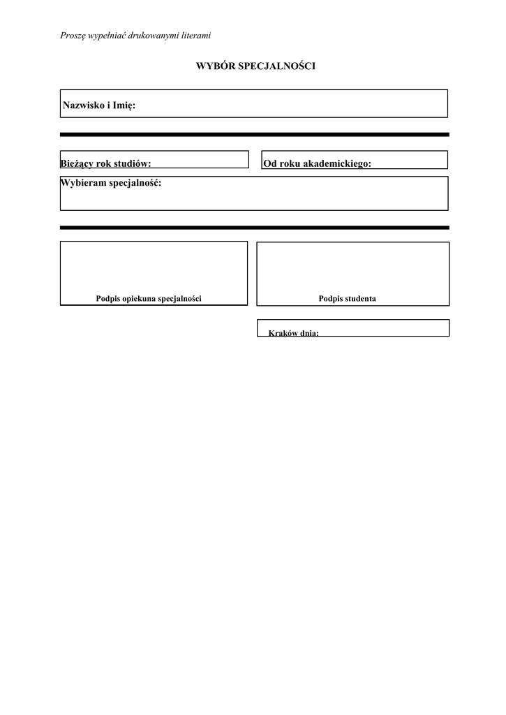 Proszę wypełniać drukowanymi literami WYBÓR SPECJALNOŚCI Nazwisko i Imię: Bieżący rok studiów: Od roku akademickiego: Wybieram specjalność: Podpis opiekuna specjalności Podpis studenta Kraków dnia: