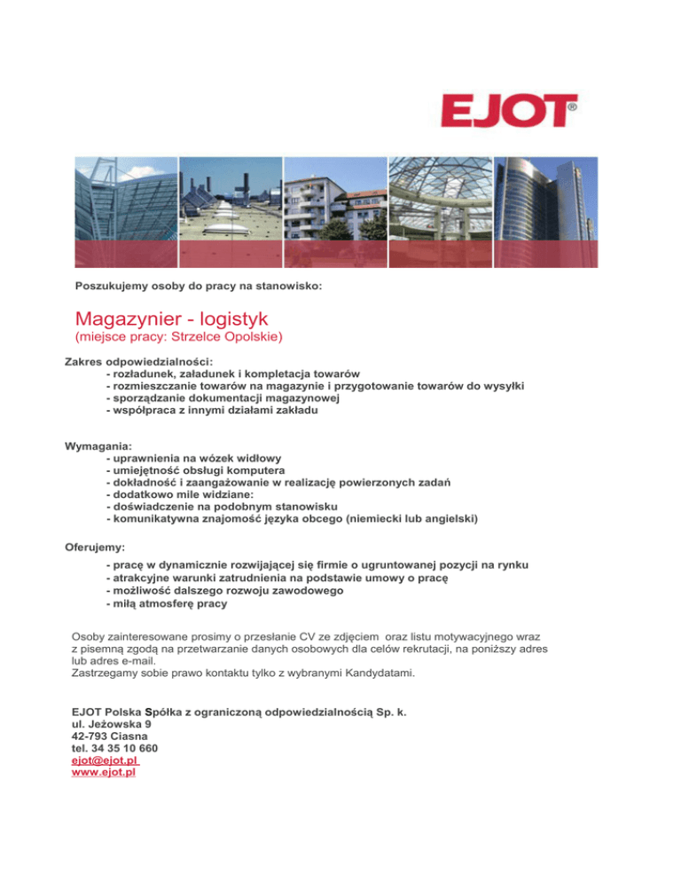 Poszukujemy osoby do pracy na stanowisko: Magazynier - logistyk (miejsce pracy: Strzelce Opolskie) Zakres odpowiedzialności: - rozładunek, załadunek i kompletacja towarów - rozmieszczanie towarów na magazynie i przygotowanie towarów do wysyłki - sporządzanie dokumentacji magazynowej - współpraca z innymi działami zakładu Wymagania: - uprawnienia na wózek widłowy - umiejętność obsługi komputera - dokładność i zaangażowanie w realizację powierzonych zadań - dodatkowo mile widziane: - doświadczenie na podobnym stanowisku - komunikatywna znajomość języka obcego (niemiecki lub angielski) Oferujemy: - pracę w dynamicznie rozwijającej się firmie o ugruntowanej pozycji na rynku - atrakcyjne warunki zatrudnienia na podstawie umowy o pracę - możliwość dalszego rozwoju zawodowego - miłą atmosferę pracy Osoby zainteresowane prosimy o przesłanie CV ze zdjęciem oraz listu motywacyjnego wraz z pisemną zgodą na przetwarzanie danych osobowych dla celów rekrutacji, na poniższy adres lub adres e-mail. Zastrzegamy sobie prawo kontaktu tylko z wybranymi Kandydatami. EJOT Polska Spółka z ograniczoną odpowiedzialnością Sp. k. ul. Jeżowska 9 42-793 Ciasna tel. 34 35 10 660 [email protected] www.ejot.pl