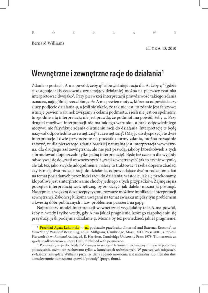 R o Bernard Williams z p r a w y ETYKA 43, 2010 Wewnętrzne i zewnętrzne racje do działania1 Zdania o postaci „A ma powód, żeby φ” albo „Istnieje racja dla A, żeby φ” (gdzie φ zastępuje jakiś czasownik oznaczający działanie) można na pierwszy rzut oka interpretować dwojako2. Przy pierwszej interpretacji prawdziwość takiego zdania oznacza, najogólniej rzecz biorąc, że A ma pewien motyw, któremu odpowiada czy służy podjęcie działania φ, a jeśli się okaże, że tak nie jest, to zdanie jest fałszywe; istnieje pewien warunek związany z celami podmiotu, i jeśli nie jest on spełniony, to zgodnie z tą interpretacją nie jest prawdą, że podmiot ma powód, żeby φ. Przy drugiej możliwej interpretacji nie ma takiego warunku, a brak odpowiedniego motywu nie falsyfikuje zdania o istnieniu racji do działania. Interpretacje te będę nazywał odpowiednio „wewnętrzną” i „zewnętrzną”. (Mając do dyspozycji te dwie interpretacje i dwie przytoczone na początku formy zdania, można rozsądnie założyć, że dla pierwszego zdania bardziej naturalna jest interpretacja wewnętrzna, dla drugiego zaś zewnętrzna, ale nie jest prawdą, jakoby którekolwiek z tych sformułowań dopuszczało tylko jedną interpretację). Będę też czasem dla wygody odwoływał się do „racji wewnętrznych” i „racji zewnętrznych”, jak to czynię w tytule, ale tak też, jako zwykłe udogodnienie, należy to traktować. Trzeba dopiero zbadać, czy istnieją dwa rodzaje racji do działania, odpowiadające dwóm rodzajom zdań na temat posiadanych przez ludzi racji do działania; w istocie, jak się przekonamy, kłopotliwe jest zinterpretowanie choćby jednego z tych przypadków. Zajmę się na początek interpretacją wewnętrzną, by zobaczyć, jak daleko można ją posunąć. Następnie, z większą dozą sceptycyzmu, rozważę możliwe implikacje interpretacji zewnętrznej. Zakończę kilkoma uwagami na temat związku między tym problemem a kwestią dóbr publicznych i tzw. problemem pasażera na gapę. Najprostszy model interpretacji wewnętrznej wyglądałby tak: A ma powód, żeby φ, wtedy i tylko wtedy, gdy A ma jakieś pragnienie, którego zaspokojeniu się przysłuży, jeśli podejmie działanie φ. Można by też powiedzieć: jakieś pragnienie, 1 Przekład Agata Łukomska — na podstawie przedruku „Internal and External Reasons”, w: Varieties of Practical Reasoning, ed. E. Millgram, Cambridge, Mass., MIT Press 2001, s. 77–89. Pierwodruk w: Rational Action, ed. R. Harrison, Cambridge University Press 1979. Tłumaczenie za zgodą spadkobierców autora i CUP. Published with permission. 2 Ponieważ „racja do działania” (reason to act) jest terminem technicznym i razi w potocznej polszczyźnie, zwrot ten zachowano tylko w kontekstach technicznych. W pozostałych miejscach, zwłaszcza tam, gdzie Williams pisze, że dany sposób mówienia jest naturalny lub nienaturalny, konsekwentnie tłumaczono „powód/powody” (przyp. tłum.). 8 Bernard Williams co do którego A jest przekonany, że φ posłuży jego zaspokojeniu; różnicą między tymi sformułowaniami zajmiemy się później. Taki model przypisuje się czasem Hume’owi, ale ponieważ poglądy Hume’a na tę kwestię są w rzeczywistości bardziej złożone, możemy to nazwać modelem sub-Humowskim. Model sub-Humowski jest z pewnością zbyt prosty. Moim celem będzie zrewidowanie go i rozbudowanie w coś bardziej adekwatnego; zacznę od zestawienia ze sobą trzech twierdzeń na temat zdań o racjach wewnętrznych. Zasadniczo, i niejako z definicji, każdy model interpretacji wewnętrznej musi ukazywać zależność stwierdzenia istnienia racji do działania od subiektywnego układu motywacyjnego podmiotu, który będę nazywał jego S. Do zawartości S jeszcze dojdziemy, ale już teraz możemy powiedzieć, że: (i) Stwierdzenie istnienia racji do działania zostaje sfalsyfikowane przez brak odpowiedniego elementu w S podmiotu. Zgodnie z najprostszym modelem sub-Humowskim, dowolny element S dostarcza podmiotowi wewnętrznej racji do działania. Są jednak podstawy, by temu zaprzeczyć, nie ze względu na godne pożałowania, nieroztropne czy odbiegające od normy elementy w S — te sprawiają problemy innego rodzaju — ale z powodu elementów S opartych na błędnych przekonaniach. Ktoś jest przekonany, że to, co ma przed sobą, to gin, gdy w rzeczywistości to benzyna. Chce się napić ginu z tonikiem. Czy zrobiłby słusznie, gdyby zmieszał to coś z tonikiem i wypił? Czy ma powód, żeby to zrobić? Można podejść do tego problemu na dwa sposoby (jak sugerują już alternatywne sposoby formułowania modelu sub-Humowskiego). Z jednej strony powiedzenie, że ma on powód, żeby wypić tę mieszankę, brzmi po prostu bardzo dziwnie, naturalnie jest natomiast powiedzieć, że nie ma powodu, by to wypić, chociaż sądzi, że ma. Z drugiej strony, jeśli mimo wszystko podmiot to wypije, mamy nie tylko wytłumaczenie, dlaczego to zrobił (powód, dla którego to zrobił), lecz także wytłumaczenie w kategoriach racji do działania. Ich wymiar wyjaśniający jest bardzo istotny i nieraz jeszcze do niego wrócimy; jeśli istnieją racje do działania w pewien sposób, to ludzie muszą czasami działać ze względu na te racje, a jeśli to robią, ich racje muszą figurować w jakimś poprawnym wyjaśnieniu ich działania (z czego nie wynika, że muszą się znaleźć we wszystkich poprawnych wyjaśnieniach ich działania). Różnica pomiędzy fałszywymi a prawdziwymi przekonaniami po stronie podmiotu nie może zmieniać formy wyjaśnienia, które będzie odpowiednie dla jego działania. Ten fakt może nas skłonić do zignorowania intuicji, na którą poprzednio zwróciliśmy uwagę i doprowadzić nas wprost do uznania, że w przypadku podmiotu, który chce się napić ginu, ma on powód, by napić się stojącej przed nim benzyny. Sądzę jednak, że nie powinniśmy tego robić. To 