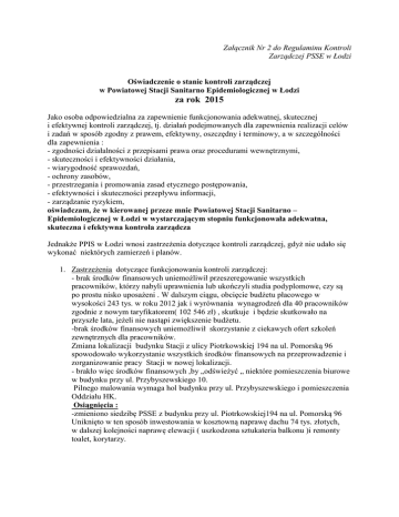 Załącznik Nr 2 do Regulaminu Kontroli Zarządczej PSSE w Łodzi Oświadczenie o stanie kontroli zarządczej w Powiatowej Stacji Sanitarno Epidemiologicznej w Łodzi za rok 2015 Jako osoba odpowiedzialna za zapewnienie funkcjonowania adekwatnej, skutecznej i efektywnej kontroli zarządczej, tj. działań podejmowanych dla zapewnienia realizacji celów i zadań w sposób zgodny z prawem, efektywny, oszczędny i terminowy, a w szczególności dla zapewnienia : - zgodności działalności z przepisami prawa oraz procedurami wewnętrznymi, - skuteczności i efektywności działania, - wiarygodność sprawozdań, - ochrony zasobów, - przestrzegania i promowania zasad etycznego postępowania, - efektywności i skuteczności przepływu informacji, - zarządzanie ryzykiem, oświadczam, że w kierowanej przeze mnie Powiatowej Stacji Sanitarno – Epidemiologicznej w Łodzi w wystarczającym stopniu funkcjonowała adekwatna, skuteczna i efektywna kontrola zarządcza Jednakże PPIS w Łodzi wnosi zastrzeżenia dotyczące kontroli zarządczej, gdyż nie udało się wykonać niektórych zamierzeń i planów. 1. Zastrzeżenia dotyczące funkcjonowania kontroli zarządczej: - brak środków finansowych uniemożliwił przeszeregowanie wszystkich pracowników, którzy nabyli uprawnienia lub ukończyli studia podyplomowe, czy są po prostu nisko uposażeni . W dalszym ciągu, obcięcie budżetu płacowego w wysokości 243 tys. w roku 2012 jak i wyrównania wynagrodzeń dla 40 pracowników zgodnie z nowym taryfikatorem( 102 546 zł) , skutkuje i będzie skutkowało na przyszłe lata, jeżeli nie nastąpi zwiększenie budżetu. -brak środków finansowych uniemożliwił skorzystanie z ciekawych ofert szkoleń zewnętrznych dla pracowników. Zmiana lokalizacji budynku Stacji z ulicy Piotrkowskiej 194 na ul. Pomorską 96 spowodowało wykorzystanie wszystkich środków finansowych na przeprowadzenie i zorganizowanie pracy Stacji w nowej lokalizacji. - brakło więc środków finansowych ,by „odświeżyć „ niektóre pomieszczenia biurowe w budynku przy ul. Przybyszewskiego 10. Pilnego malowania wymaga hol budynku przy ul. Przybyszewskiego i pomieszczenia Oddziału HK. Osiągnięcia : -zmieniono siedzibę PSSE z budynku przy ul. Piotrkowskiej194 na ul. Pomorską 96 Uniknięto w ten sposób inwestowania w kosztowną naprawę dachu 74 tys. złotych, w dalszej kolejności naprawę elewacji ( uszkodzona sztukateria balkonu )i remonty toalet, korytarzy. - przeniesiono i zorganizowano pracę Oddziału HDM i LBŚ w budynku przy Przybyszewskiego 10 - przeniesiono Odział Księgowości do nowych pomieszczeń - prowadzono dalsze prace adaptacyjne archiwum - zakupiono nowy zestaw szaf chłodniczych dla Sekcji Szczepień - zakupiono miernik drgań SV106 i miernik poziomu dźwięku SVAN 971 dla LBŚ - zakupiono 2 cieplarki Poprawiono sytuację transportową : - zakupiono nowy samochód Skoda Rapid , oraz pozyskano nieodpłatnie używany ,ale w dobrym stanie samochód Skoda Fabia combi z PSSE w Pabianicach. - zakupiono 10 komputerów stacjonarnych, 16 laptopów ,mimo dużo większego zapotrzebowania i pilnej potrzeby zamiany posiadanego "przestarzałego"" sprzętu na nowy. W związku ze zmianami lokalizacyjnymi złożono wniosek do UW o zmiany w rejestrze podmiotów wykonujących działalność leczniczą prowadzonym przez Wojewodę Łódzkiego. - Zrealizowano zaplanowane cele i zadania merytoryczne zgodnie z Rocznym Planem pracy jednostki na 2015 r (załącznik Nr.1), który dotyczył przede wszystkim poprawy stanu sanitarno-technicznego obiektów użyteczności publicznej, poprawy warunków produkcji i obrotu żywności zapobiegania i zwalczania chorób zakaźnych, poprawy warunków pracy, promocji zdrowia, realizacji harmonogramów pracy jak i realizacji powyższych zadań zgodnie z planem finansowym. Oświadczam, że przyznane środki finansowe na 2015r. w §§ rzeczowych pozwoliły tak zarządzać finansami PSSE w Łodzi, że udało się zrealizować przede wszystkim to ogromne przedsięwzięcie jakim była zmiana siedziby Stacji i zorganizowanie pracy oddziałów w nowej lokalizacji (nowa sieć komputerowa, telekomunikacyjna, meble itd. ) Nie dofinansowanie §§ płacowych, powoduje niezadowolenie pracowników co do ich wynagrodzenia. Kilku pracowników z wysokimi kwalifikacjami zrezygnowało z pracy w PSSE w Łodzi. 2. Planowane działania, które zostaną podjęte w celu poprawy funkcjonowania kontroli zarządczej. -wnioskowanie do PWIS o zwiększenie budżetu na 2016 r.w §§ płacowych, mimo że projekt budżetu na 2016r. zakłada przyznanie 8,5% podniesienia uposażenia zasadniczego dla pracowników Inspekcji Sanitarnej województwa łódzkiego -wnioskowanie do PWIS o organizowanie szkoleń z wybranej tematyki dla PPIS i kierowników oddziałów merytorycznych - wnioskowanie do Prezydenta Łodzi o przyznanie zarządu trwałego dla budynku przy ul. Pomorskiej 96 –obniżenie kosztów czynszu i możliwość inwestowania. - kontynuowanie prac remontowych poszczególnych pomieszczeń "pałacu" we własnym zakresie. - remont chłodni szczepionek - kontrole dyscypliny pracy, efektywności pracy ( liczba kontroli/pracownika) i dokumentacji. Niniejsze oświadczenie opiera się na mojej ocenie i informacjach dostępnych w czasie sporządzania niniejszego oświadczenia pochodzących z : - z nadzoru nad realizacją celów i zadań, - samooceny kontroli zarządczej przeprowadzonej z uwzględnieniem standardów kontroli zarządczej dla sektora finansów publicznych, - procesu zarządzania ryzykiem, - audytu wewnętrznego, - kontroli wewnętrznych, - kontroli zewnętrznych, - ankiet do samooceny kontroli zarządczej dla kierowników - innych źródeł informacji : sugestie, uwagi właścicieli kontrolowanych obiektów, zalecenia pokontrolne WSSE, procedury zamówień publicznych, uwagi kierowników i pracowników Stacji przekazywane na wewnętrznych naradach, sprawozdanie RB 28, Plan Finansowy. Jednocześnie oświadczam,
