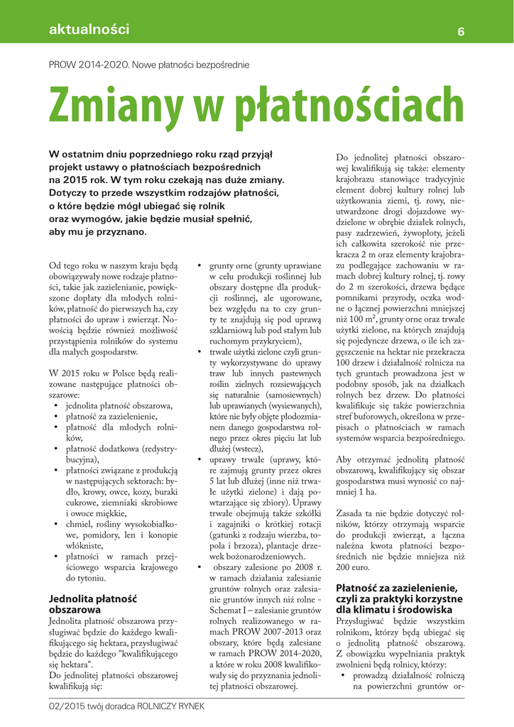 aktualności 6 PROW 2014-2020. Nowe płatności bezpośrednie Zmiany w płatnościach W ostatnim dniu poprzedniego roku rząd przyjął projekt ustawy o płatnościach bezpośrednich na 2015 rok. W tym roku czekają nas duże zmiany. Dotyczy to przede wszystkim rodzajów płatności, o które będzie mógł ubiegać się rolnik oraz wymogów, jakie będzie musiał spełnić, aby mu je przyznano. Od tego roku w naszym kraju będą obowiązywały nowe rodzaje płatności, takie jak zazielenianie, powiększone dopłaty dla młodych rolników, płatność do pierwszych ha, czy płatności do upraw i zwierząt. Nowością będzie również możliwość przystąpienia rolników do systemu dla małych gospodarstw. W 2015 roku w Polsce będą realizowane następujące płatności obszarowe: y jednolita płatność obszarowa, y płatność za zazielenienie, y płatność dla młodych rolników, y płatność dodatkowa (redystrybucyjna), y płatności związane z produkcją w następujących sektorach: bydło, krowy, owce, kozy, buraki cukrowe, ziemniaki skrobiowe i owoce miękkie, y chmiel, rośliny wysokobiałkowe, pomidory, len i konopie włókniste, y płatności w ramach przejściowego wsparcia krajowego do tytoniu. Jednolita płatność obszarowa Jednolita płatność obszarowa przysługiwać będzie do każdego kwalifikującego się hektara, przysługiwać będzie do każdego "kwalifikującego się hektara". Do jednolitej płatności obszarowej kwalifikują się: y grunty orne (grunty uprawiane w celu produkcji roślinnej lub obszary dostępne dla produkcji roślinnej, ale ugorowane, bez względu na to czy grunty te znajdują się pod uprawą szklarniową lub pod stałym lub ruchomym przykryciem), y trwałe użytki zielone czyli grunty wykorzystywane do uprawy traw lub innych pastewnych roślin zielnych rozsiewających się naturalnie (samosiewnych) lub uprawianych (wysiewanych), które nie były objęte płodozmianem danego gospodarstwa rolnego przez okres pięciu lat lub dłużej (wstecz), y uprawy trwałe (uprawy, które zajmują grunty przez okres 5 lat lub dłużej (inne niż trwałe użytki zielone) i dają powtarzające się zbiory). Uprawy trwałe obejmują także szkółki i zagajniki o krótkiej rotacji (gatunki z rodzaju wierzba, topola i brzoza), plantacje drzewek bożonarodzeniowych. y obszary zalesione po 2008 r. w ramach działania zalesianie gruntów rolnych oraz zalesianie gruntów innych niż rolne Schemat I – zalesianie gruntów rolnych realizowanego w ramach PROW 2007-2013 oraz obszary, które będą zalesiane w ramach PROW 2014-2020, a które w roku 2008 kwalifikowały się do przyznania jednolitej płatności obszarowej. 02/2015 twój doradca ROLNICZY RYNEK Do jednolitej płatności obszarowej kwalifikują się także: elementy krajobrazu stanowiące tradycyjnie element dobrej kultury rolnej lub użytkowania ziemi, tj. rowy, nieutwardzone drogi dojazdowe wydzielone w obrębie działek rolnych, pasy zadrzewień, żywopłoty, jeżeli ich całkowita szerokość nie przekracza 2 m oraz elementy krajobrazu podlegające zachowaniu w ramach dobrej kultury rolnej, tj. rowy do 2 m szerokości, drzewa będące pomnikami przyrody, oczka wodne o łącznej powierzchni mniejszej niż 100 m², grunty orne oraz trwałe użytki zielone, na których znajdują się pojedyncze drzewa, o ile ich zagęszczenie na hektar nie przekracza 100 drzew i działalność rolnicza na tych gruntach prowadzona jest w podobny sposób, jak na działkach rolnych bez drzew. Do płatności kwalifikuje się także powierzchnia stref buforowych, określona w przepisach o płatnościach w ramach systemów wsparcia bezpośredniego. Aby otrzymać jednolitą płatność obszarową, kwalifikujący się obszar gospodarstwa musi wynosić co najmniej 1 ha. Zasada ta nie będzie dotyczyć rolników, którzy otrzymają wsparcie do produkcji zwierząt, a łączna należna kwota płatności bezpośrednich nie będzie mniejsza niż 200 euro. Płatność za zazielenienie, czyli za praktyki korzystne dla klimatu i środowiska Przysługiwać będzie wszystkim rolnikom, którzy będą ubiegać się o jednolitą płatność obszarową. Z obowiązku wypełniania praktyk zwolnieni będą rolnicy, którzy: y prowadzą działalność rolniczą na powierzchni gruntów or- aktualności nych mniejszej niż 10 ha i nie posiadają trwałych użytków zielonych, y planują przystąpić w 2015 r. do systemu dla małych gospodarstw, y prowadzą gospodarstwo ekologiczne. Pozostali rolnicy będą zobowiązani do stosowania, praktyk rolniczych korzystnych dla klimatu i środowiska lub tzw. praktyk równoważnych na wszystkich hektarach kwalifikujących się do jednolitej płatności obszarowej. Obowiązkowe praktyki obejmują: y dywersyfikację upraw – (dotyczy gospodarstw rolnych o powierzchni od 10 ha gruntów ornych i polega na utrzymaniu odpowiedniej liczby i powierzchni upraw na gruntach ornych w gospodarstwie rolnym w danym roku), y utrzymywanie trwałych użytków rolnych, y utrzymywanie obszarów proekologicznych (dotyczy gospodarstw rolnych o powierzchni od 15 ha gruntów ornych i polega na wykazaniu obszarów proekologicznych w ilości odpowiadającej co najmniej 5% gruntów ornych. Wykaz obszarów proekologicznych można znaleźć na stronie www.arimr. gov.pl. Gospodarstwa ekologiczne będą automatycznie objęte płatnością za zazielenienie, a rolnicy gospodarujący na obszarach Natura 2000 oraz objętych tzw. ramową dyrektywą wodną będą otrzymywać płatność za zazielenienie pod warunkiem realizacji praktyk zazielenienia (zgodnie z celami dyrektywy ptasiej, siedliskowej oraz ramowej dyrektywy wodnej). Płatność dla młodych rolników Płatność dla młodego rolnika stanowić będzie dodatkową płatność roczną dla określonej grupy rolników. Płatność przysługiwać będzie rolnikowi aktywnemu zawodowo, uprawnionemu do jednolitej płatności obszarowej, który: 8 y Jest osobą fizyczną, która po raz pierws