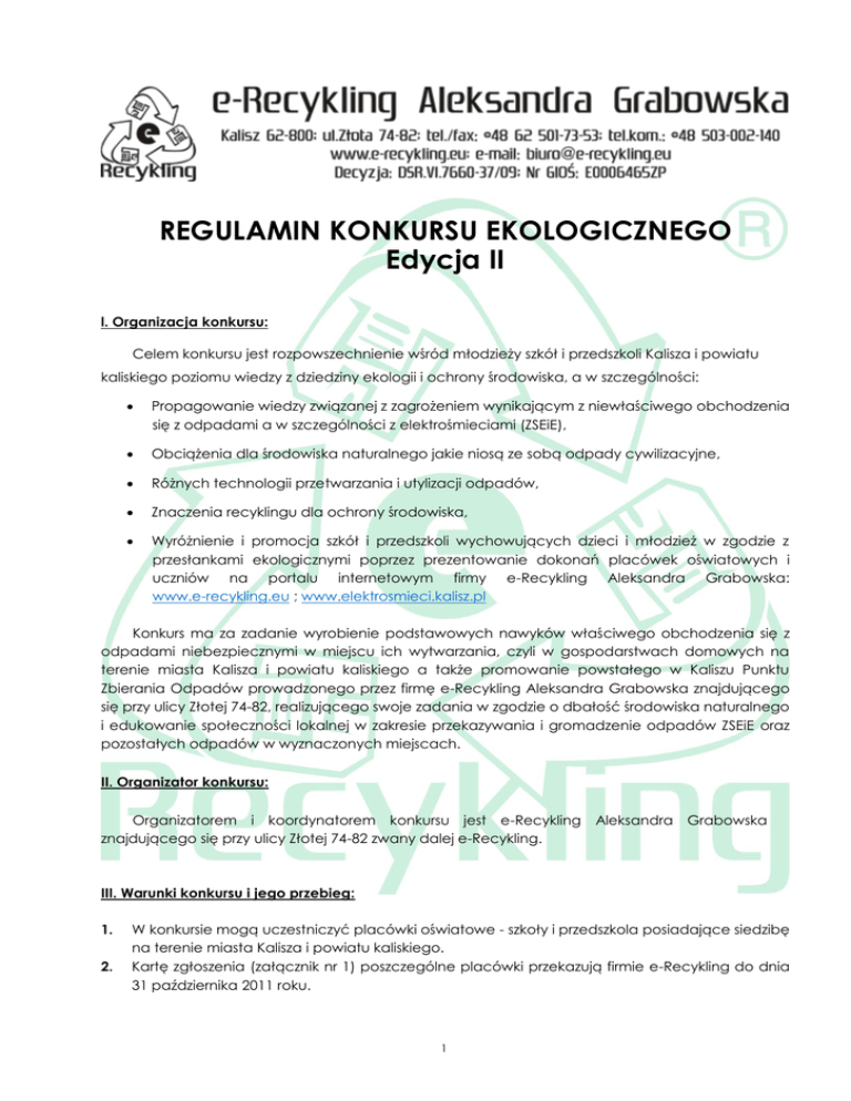 REGULAMIN KONKURSU EKOLOGICZNEGO Edycja II l. Organizacja konkursu: Celem konkursu jest rozpowszechnienie wśród młodzieży szkół i przedszkoli Kalisza i powiatu kaliskiego poziomu wiedzy z dziedziny ekologii i ochrony środowiska, a w szczególności: Propagowanie wiedzy związanej z zagrożeniem wynikającym z niewłaściwego obchodzenia się z odpadami a w szczególności z elektrośmieciami (ZSEiE), Obciążenia dla środowiska naturalnego jakie niosą ze sobą odpady cywilizacyjne, Różnych technologii przetwarzania i utylizacji odpadów, Znaczenia recyklingu dla ochrony środowiska, Wyróżnienie i promocja szkół i przedszkoli wychowujących dzieci i młodzież w zgodzie z przesłankami ekologicznymi poprzez prezentowanie dokonań placówek oświatowych i uczniów na portalu internetowym firmy e-Recykling Aleksandra Grabowska: www.e-recykling.eu ; www.elektrosmieci.kalisz.pl Konkurs ma za zadanie wyrobienie podstawowych nawyków właściwego obchodzenia się z odpadami niebezpiecznymi w miejscu ich wytwarzania, czyli w gospodarstwach domowych na terenie miasta Kalisza i powiatu kaliskiego a także promowanie powstałego w Kaliszu Punktu Zbierania Odpadów prowadzonego przez firmę e-Recykling Aleksandra Grabowska znajdującego się przy ulicy Złotej 74-82, realizującego swoje zadania w zgodzie o dbałość środowiska naturalnego i edukowanie społeczności lokalnej w zakresie przekazywania i gromadzenie odpadów ZSEiE oraz pozostałych odpadów w wyznaczonych miejscach. II. Organizator konkursu: Organizatorem i koordynatorem konkursu jest e-Recykling znajdującego się przy ulicy Złotej 74-82 zwany dalej e-Recykling. Aleksandra Grabowska III. Warunki konkursu i jego przebieg: 1. 2. W konkursie mogą uczestniczyć placówki oświatowe - szkoły i przedszkola posiadające siedzibę na terenie miasta Kalisza i powiatu kaliskiego. Kartę zgłoszenia (załącznik nr 1) poszczególne placówki przekazują firmie e-Recykling do dnia 31 października 2011 roku. 1 3. 4. Konkurs rozpoczyna się w dniu 15 września 2011 r. ( "Sprzątanie Świata - Polska" ) Dyrektor szkoły, która zgłosi udział w konkursie wskazuje swojego przedstawiciela -koordynatora konkursu. 5. Konkurs polega na zebraniu przez placówki oświatowe odpadów i przekazanie ich do firmy e-Recykling. 6. Firma e-Recykling dostarczy na życzenie placówki kosze i worki na gromadzenie odpadów. 7. Zbierane będą następujące odpady: Elektrośmieci – zużyte urządzenia elektryczne i elektroniczne (załącznik nr 2), Makulatura – karton, gazety, książki … Tworzywa sztuczne – butelki plastikowe, nakrętki plastikowe Puszki aluminiowe i nakrętki aluminiowe 8. Za zebrane odpady przyznawane są punkty (załącznik nr 3). 9. Placówki, które zbiorą najwięcej punktów w przeliczeniu na ucznia otrzymają nagrody. 10. Każda placówka, która weźmie udział w konkursie otrzyma drobne upominki. IV. Komisja Konkursowa: Komisję Konkursową dla konkursu powołuje e-Recykling w terminie poprzedzającym pracę danej komisji. V. Nagrody: 1. Nagrody przyznawane są zgodnie z niniejszym regulaminem. Pierwsza nagroda – notebook, Druga nagroda – komputer stacjonarny, Trzecia nagroda – urządzenie wielofunkcyjne do drukowania, Upominki – materiały biurowe, akcesoria sportowe 2. Fundatorami nagród jest Firma e-Recykling, VI. Rozstrzygnięcie konkursów i ogłoszenie wyników 1. O wynikach konkursów uczestnicy zostaną powiadomieni pisemnie, co najmniej na 14 dni przed uroczystym wręczeniem nagród. 2. Ogłoszenie wyników i wręczenie nagród konkursu związanego ze zbiórką odpadów nastąpi miedzy 31 maja a 15 czerwca 2012 roku. 3. Wyniki konkursu zostaną podane do publicznej wiadomości na portalach internetowych. 2