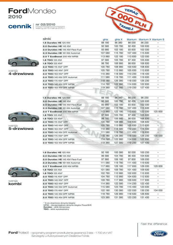 FordMondeo 70 00 2010 cennik silniki 2.0 Duratec HE 145 KM 2.0 Duratec HE 145 KM Flexi-Fuel 2.3 Duratec HE 161 KM Automat 2.0 T EcoBoost 200 KM MPS6 1.8 TDCi 125 KM 1.8 TDCi 125 KM* 2.0 TDCi 115 KM* DPF 2.0 TDCi 140 KM* DPF wersja 4-drzwiowa 2.0 TDCi 163 KM* DPF 2.0 TDCi 140 KM DPF Automat 2.2 TDCi 175 KM* DPF 2.0 TDCi 140 KM DPF MPS6 2.0 TDCi 163 KM DPF MPS6 1.6 Duratec HE 125 KM 2.0 Duratec HE 145 KM 2.0 Duratec HE 145 KM Flexi-Fuel 2.3 Duratec HE 161 KM Automat 2.0 T EcoBoost 200 KM MPS6 1.8 TDCi 125 KM 1.8 TDCi 125 KM* 2.0 TDCi 115 KM* DPF 2.0 TDCi 140 KM* DPF 5-drzwiowa 2.0 TDCi 163 KM* DPF 2.0 TDCi 140 KM DPF Automat 2.2 TDCi 175 KM* DPF 2.0 TDCi 140 KM DPF MPS6 2.0 TDCi 163 KM DPF MPS6 1.6 Duratec HE 125 KM 2.0 Duratec HE 145 KM 2.0 Duratec HE 145 KM Flexi-Fuel 2.3 Duratec HE 161 KM Automat 2.0 T EcoBoost 200 KM MPS6 1.8 TDCi 125 KM 1.8 TDCi 125 KM* 2.0 TDCi 115 KM* DPF wersja kombi A wa˝ny od 15 marca 2010 r. 1.6 Duratec HE 125 KM wersja T nr 02/2010 2.0 TDCi 140 KM* DPF 2.0 TDCi 163 KM* DPF 2.0 TDCi 140 KM DPF Automat 2.2 TDCi 175 KM* DPF 2.0 TDCi 140 KM DPF MPS6 2.0 TDCi 163 KM DPF MPS6 PL EJ N ghia 88 180 92 580 93 980 107 580 113 980 97 580 98 780 100 780 105 780 110 380 111 580 118 180 114 780 119 380 ghia X 96 380 100 780 102 180 115 780 122 180 105 780 106 980 108 980 113 980 118 580 119 780 126 380 122 980 127 580 titanium titanium X titanium S 88 030 96 230 – 92 430 100 630 – 93 830 102 030 – 107 430 115 630 – 113 830 122 030 – 97 430 105 630 – 98 630 106 830 – 100 630 108 830 – 105 630 113 830 – 110 230 118 430 – 111 430 119 630 – 118 030 126 230 – 114 630 122 830 – 119 230 127 430 – 88 180 92 580 93 980 107 580 113 980 97 580 98 780 100 780 105 780 110 380 111 580 118 180 114 780 119 380 96 380 100 780 102 180 115 780 122 180 105 780 106 980 108 980 113 980 118 580 119 780 126 380 122 980 127 580 88 030 92 430 93 830 107 430 113 830 97 430 98 630 100 630 105 630 110 230 111 430 118 030 114 630 119 230 96 230 100 630 102 030 115 630 122 030 105 630 106 830 108 830 113 830 118 430 119 630 126 230 122 830 127 430 – – – – 125 830 – – – – – – 130 030 – – 92 180 96 580 97 980 111 580 117 980 101 580 102 780 104 780 109 780 114 380 115 580 122 180 118 780 123 380 100 104 106 119 126 109 110 112 117 122 123 130 126 131 92 030 96 430 97 830 111 430 117 830 101 430 102 630 104 630 109 630 114 230 115 430 122 030 118 630 123 230 100 104 106 119 126 109 110 112 117 122 123 130 126 131 – – – – 129 830 – – – – – – 134 030 – – * 6-cio stopniowa skrzynia biegów MPS6 - dwusprz´g∏owa skrzynia biegów PowerShift Duratec - silnik benzynowy TDCi - silnik wysokopr´˝ny FordProtect – opcjonalny program przed∏u˝enia gwarancji 3 lata – 1 700 z∏ z VAT Szczegó∏y u Autoryzowanych Dealerów Forda NI 380 780 180 780 180 780 980 980 980 580 780 380 980 380 230 630 030 630 030 630 830 830 830 430 630 230 830 430 FordMondeo wyposa˝enie 2010 bezpieczeƒstwo Uk∏ad ABS z elektronicznym uk∏adem podzia∏u si∏y hamowania (EBD) IVD (ESP + TCS) – elektroniczny uk∏ad stabilizacji toru jazdy (ESP) z uk∏adem kontroli trakcji (TCS) oraz uk∏adem wspomagania awaryjnego hamowania (EBA) Uk∏ad IVDC (ESP + TCS+EBA+CDC+HLA) i sportowe zawieszenie (niedost´pne z samopoziomujàcym zawieszeniem i silnikiem benzynowym Duratec 1.6) Âwiat∏a awaryjnego hamowania Bezw∏adnoÊciowy wy∏àcznik odcinajàcy dop∏yw paliwa (tylko wersje z silnikiem benzynowym) System tankowania bez tradycyjnego korka paliwa; z zabezpieczeniem przed zatankowaniem z niew∏aÊciwego dystrybutora Hydrauliczny uk∏ad wspomagania kierownicy (HPAS) Inteligentny System Bezpieczeƒstwa (IPS) Poduszki powietrzne – poduszki czo∏owe kierowcy i pasa˝era z przoduu Poduszki powietrzne – poduszki boczne dla kierowcy i pasa˝era z przodu Poduszki powietrzne – boczne kurtyny powietrzne chroniàce osoby na przednich i tylnych fotelach, umieszczone w podsufitce Poduszki powietrzne – poduszka chroniàca kolana kierowcy Bezpieczna (cofajàca si´) kolumna kierownicys Reflektory halogenowe ze szk∏ami z poliw´glanu o zwi´kszonej wytrzyma∏oÊci na drobne uderzenia i zarysowania, boczne Êwiat∏a pozycyjne, tylne Êwiat∏a przeciwmgielne, Êwiat∏a biegu wstecznego oraz dodatkowe Êwiat∏o STOP z ty∏u Przednie Êwiat∏a przeciwmgielne System halogenowych reflektorów adaptacyjnych ze statycznymi Êwiat∏ami doÊwietlajàcymi zakr´ty Spryskiwacze reflektorów Wy∏àcznik reflektorów z opóêniaczem System statycznych ksenonowych reflektorów adaptacyjnych ze spryskiwaczami i automatycznà regulacjà kàta ustawienia Zaawansowany uk∏ad ESP, zawiera uk∏ad u∏atwiajàcy ruszanie z miejsca na wzniesieniach HLA, (standard ze skrzynià MPS6) Uk∏ad monitorowania ciÊnienia w ogumieniu Fotele – mocowana fotelików dzieci´cych typu ISOFIX (tylko skrajne tylne fotele) komfort Kolumna kierownicy z regulacjà odleg∏oÊci i pochylenia Klimatyzacja – dwustrefowa, z automatycznà regulacjà temperatury (DEATC), bezfreonowy czynnik ch∏odniczy Lusterko wsteczne samoczynnie Êciemniajace si´ (zawiera przednie lampy przeciwmgielne) Elektrycznie sterowane szyby przednich drzwi – opuszczane jednym naciÊni´ciem przycisku, z czujnikiem przeszkody przy zamykaniu, z funkcjà ca∏kowitego otwierania/zamykania wszystkich szyb Fotel pasa˝era z przodu – regulacja podparcia odcinka l´dêwiowego Fotel pasa˝era z przodu – r´czna regulacja wysokoÊci Fotel pasa˝era z przodu – pe∏na elektryczna regulacja po∏o˝enia Przednie fotele – o profilu sportowym Podgrzewane przednie fotele Przednie fotele – wentylowane i podgrzewane Fotel kierowcy – pe∏na elektryczna regulacja po∏o˝enia z funkcjà pami´ci po∏o˝enia i elektrycznie sk∏adanymi lusterkami z pami´cià ustawienia Podgrzewana tylna kanapa Tapicerka foteli – Alcantara (tylko z przednimi zag∏ówkami z regulacjà w 4 kierunkach) Tapicerka foteli skórzana T